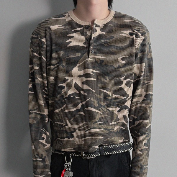 Camo waffle henley neck crop t-shirt