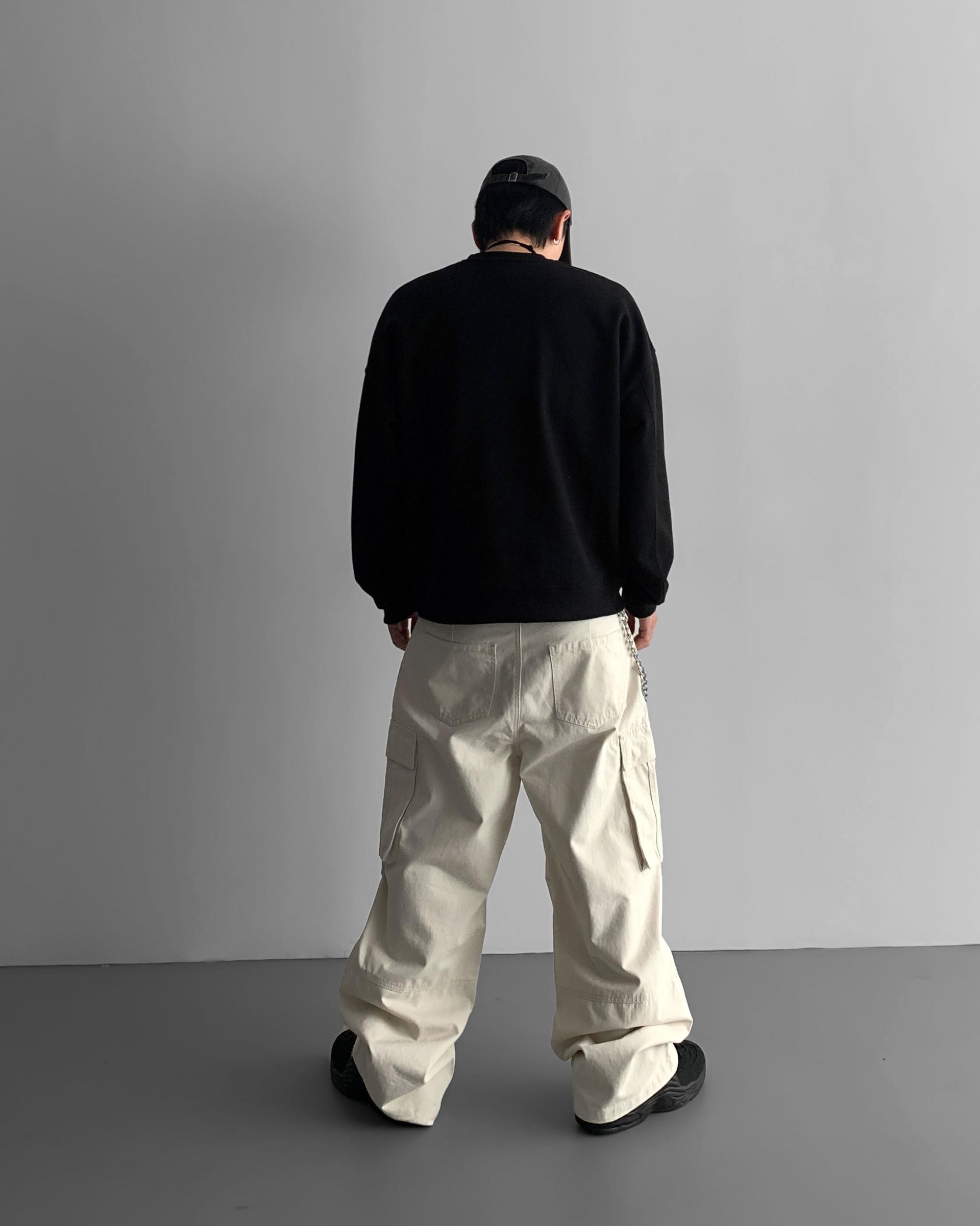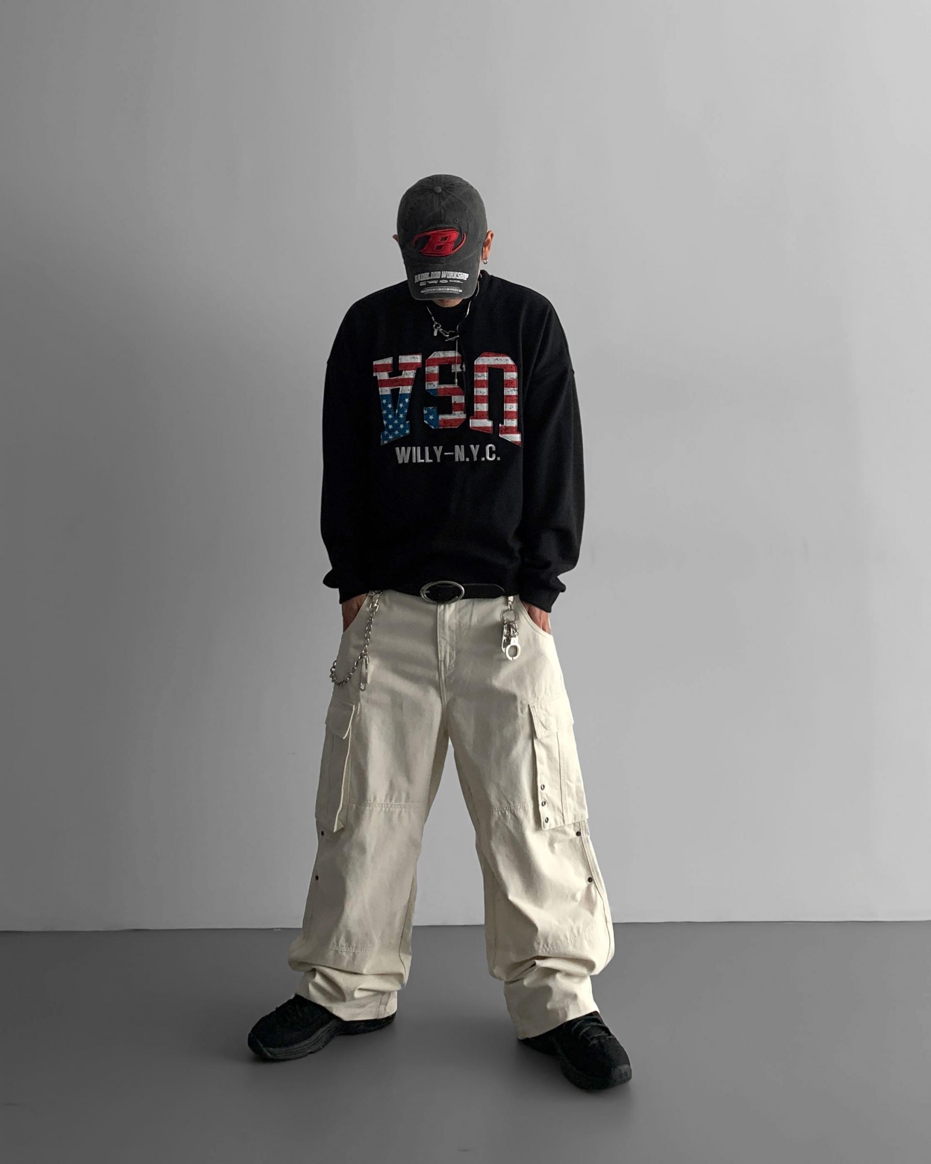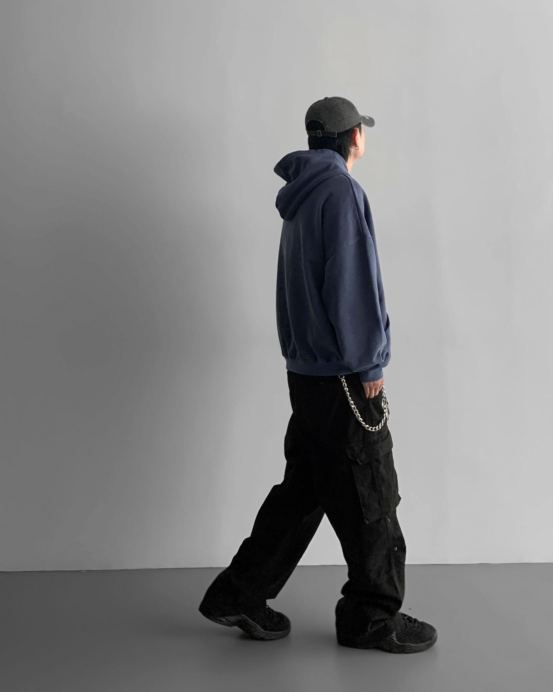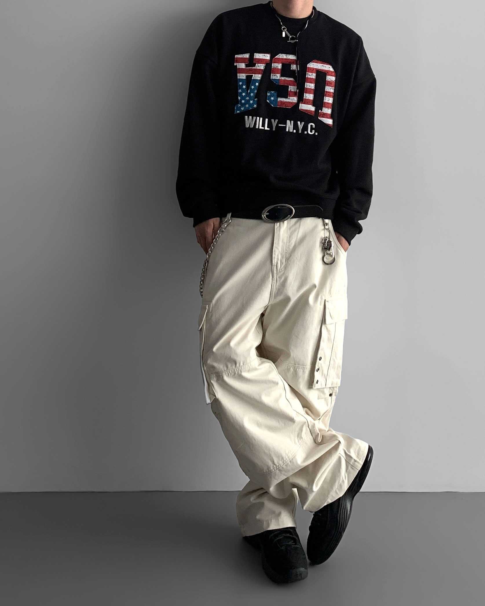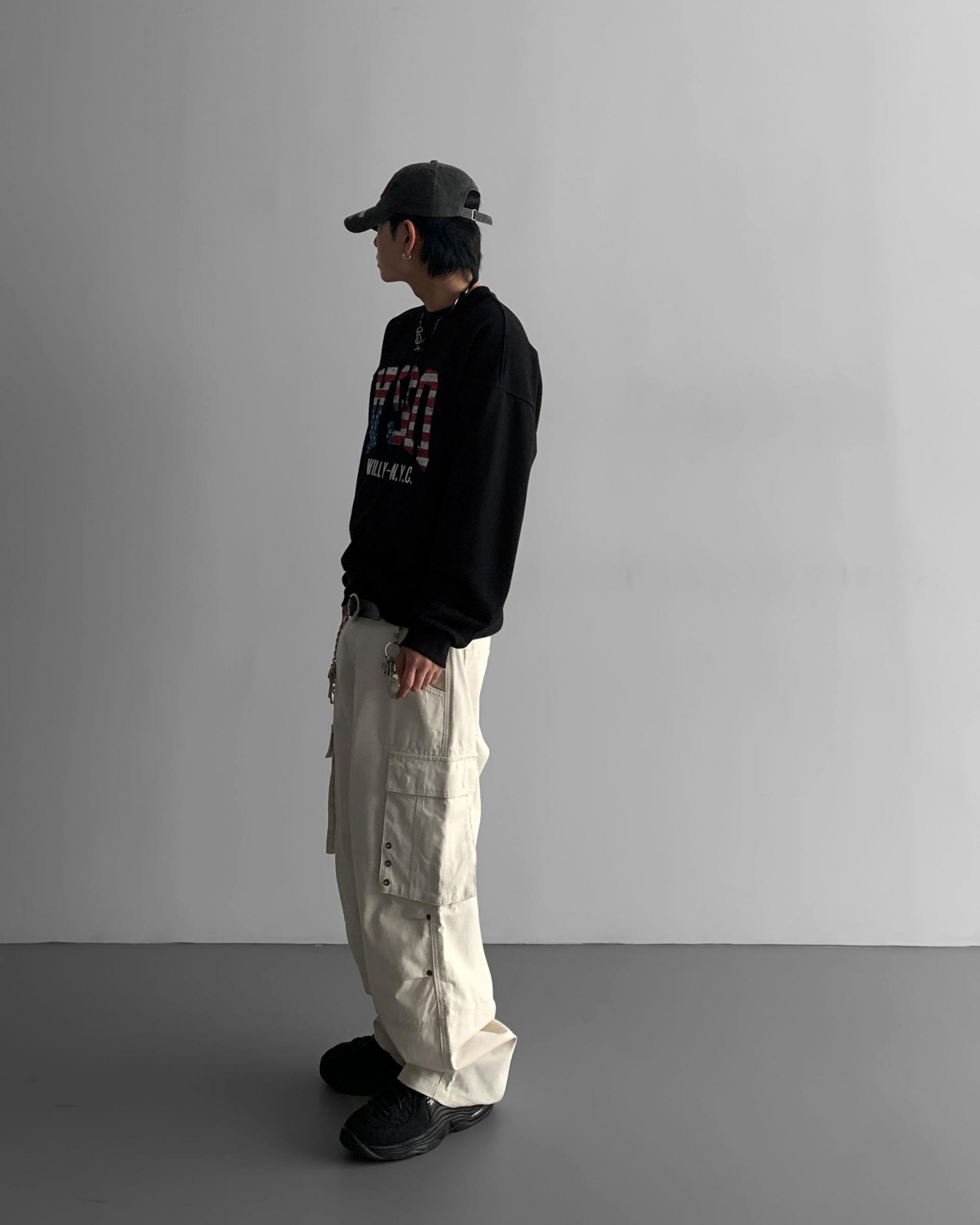 (모델에게 큰 사이즈를 선택하여 골반에 걸쳐서 착용. 와이드한 핏 연출)