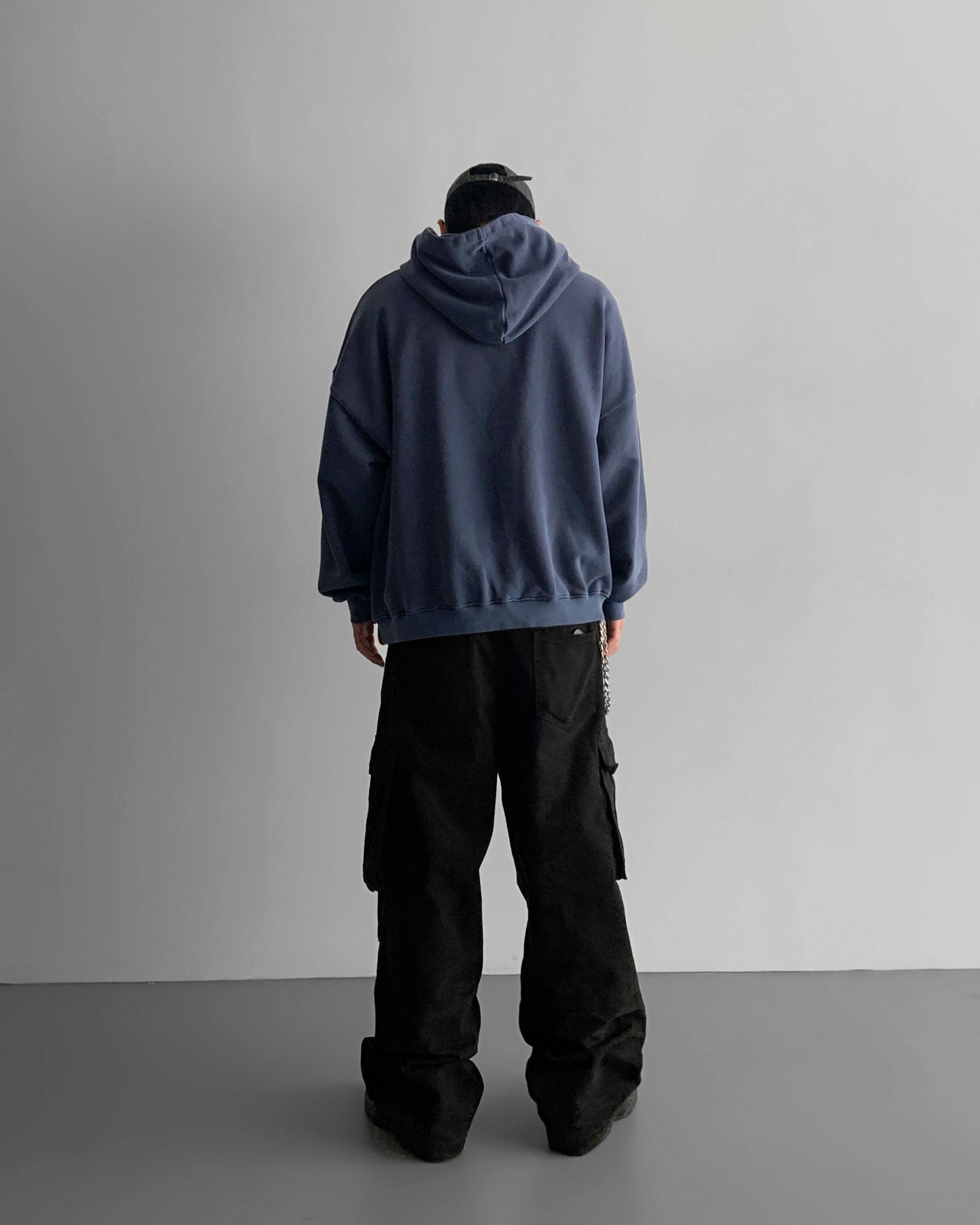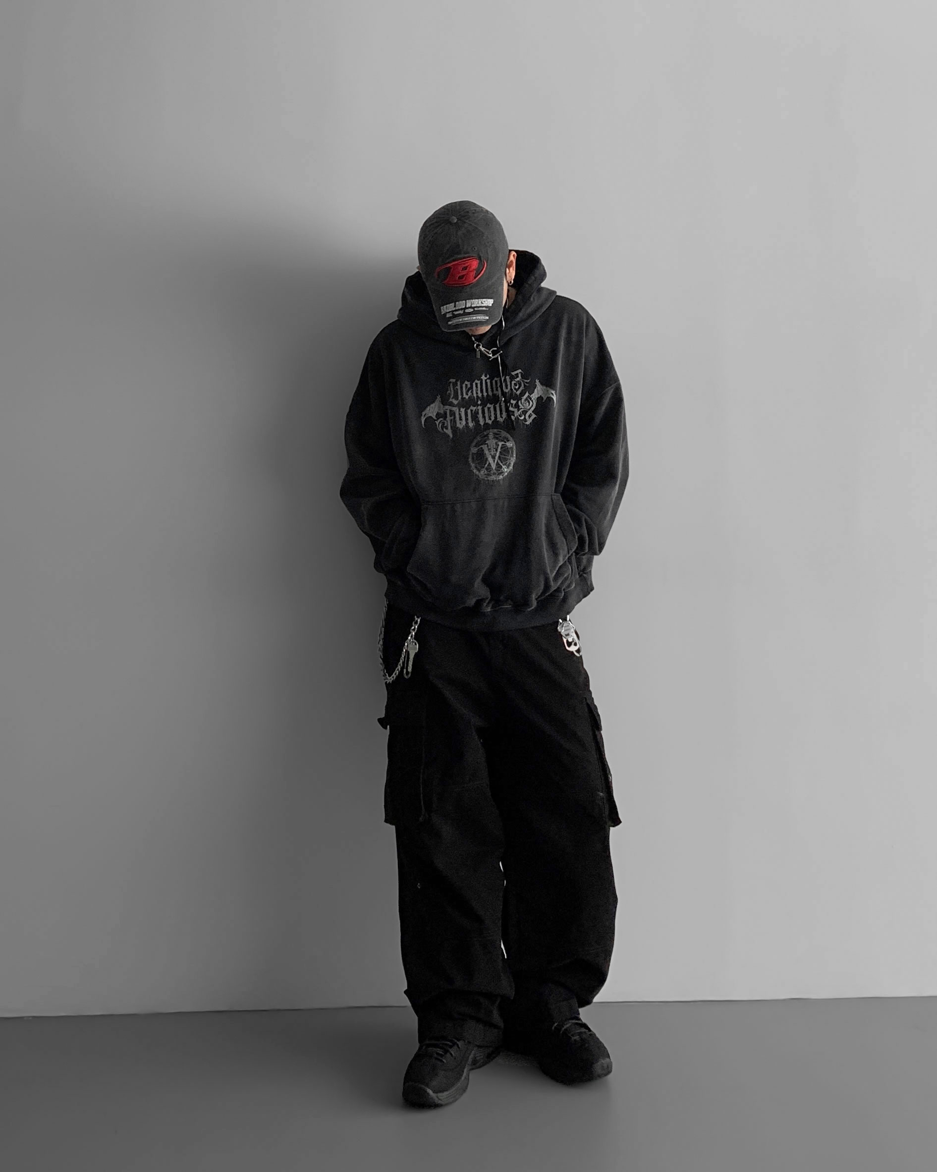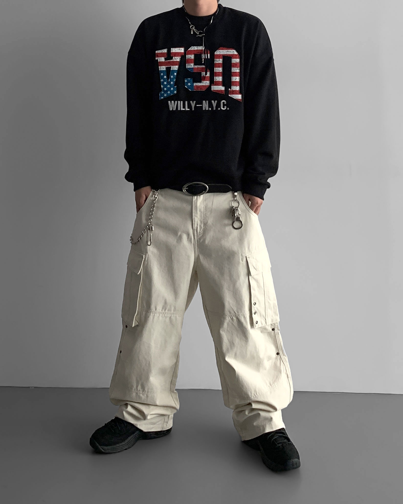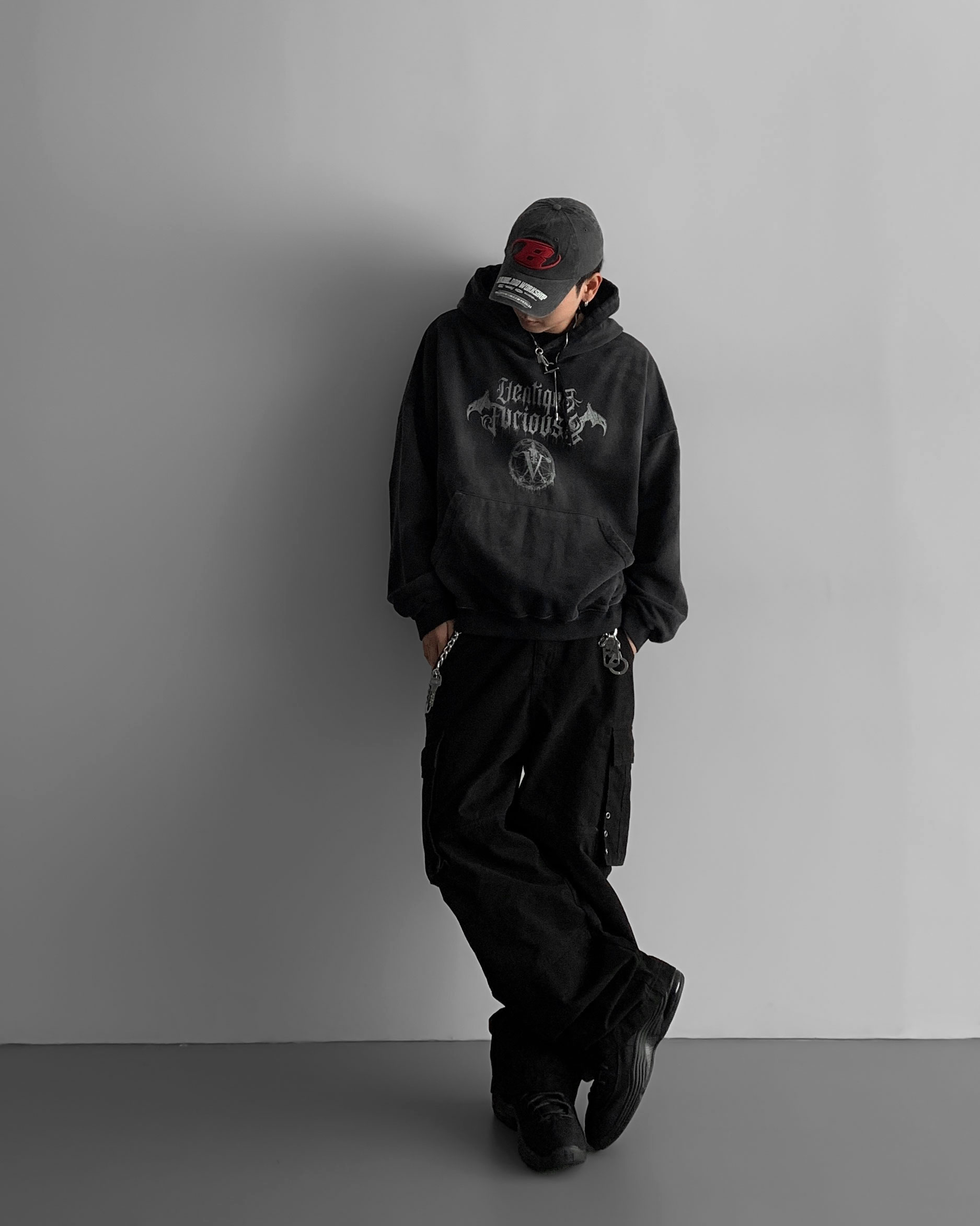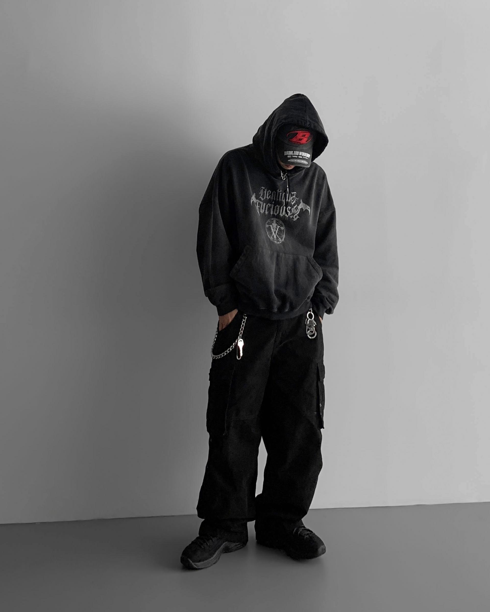 (모델에게 큰 사이즈를 선택하여 골반에 걸쳐서 착용. 와이드한 핏 연출)