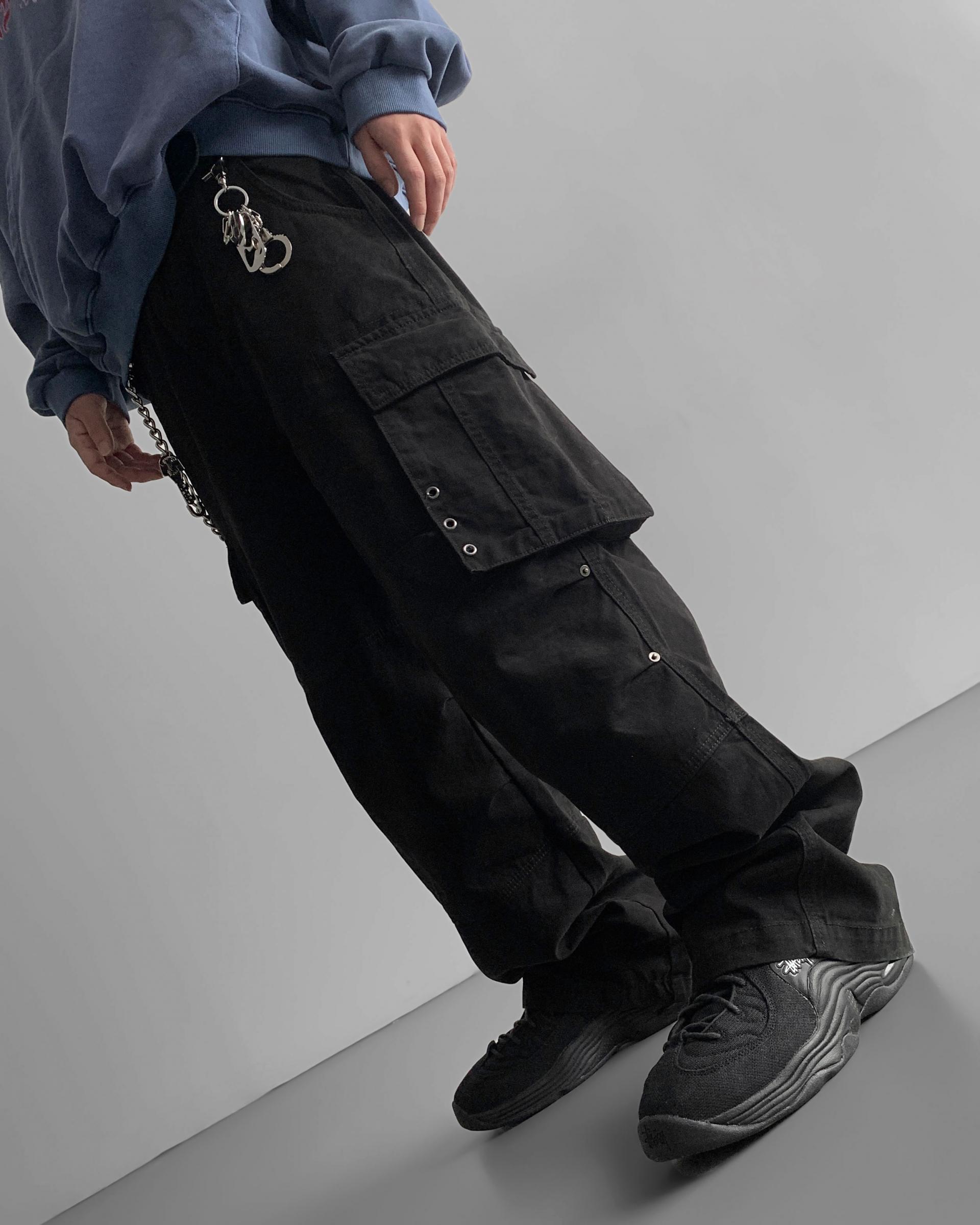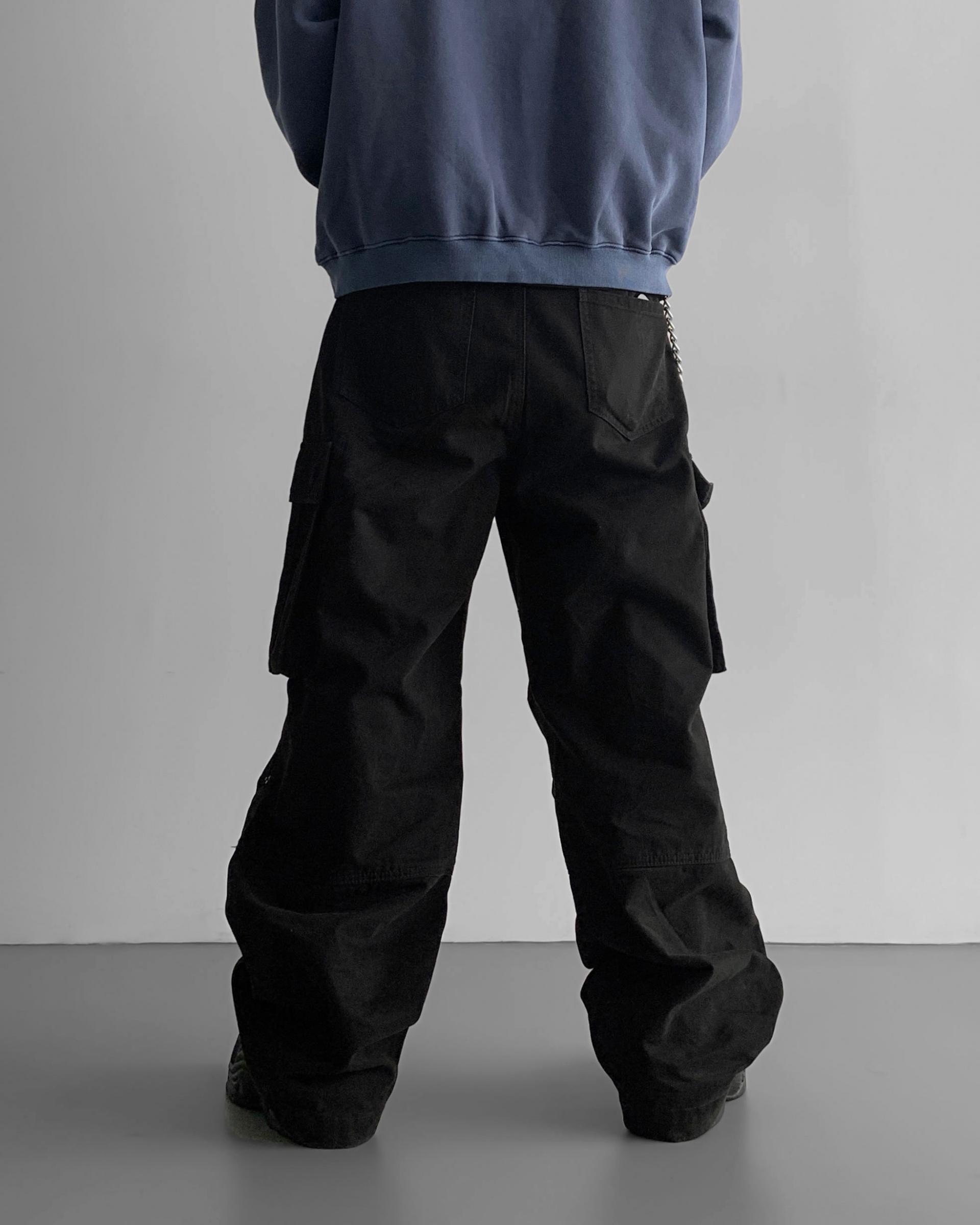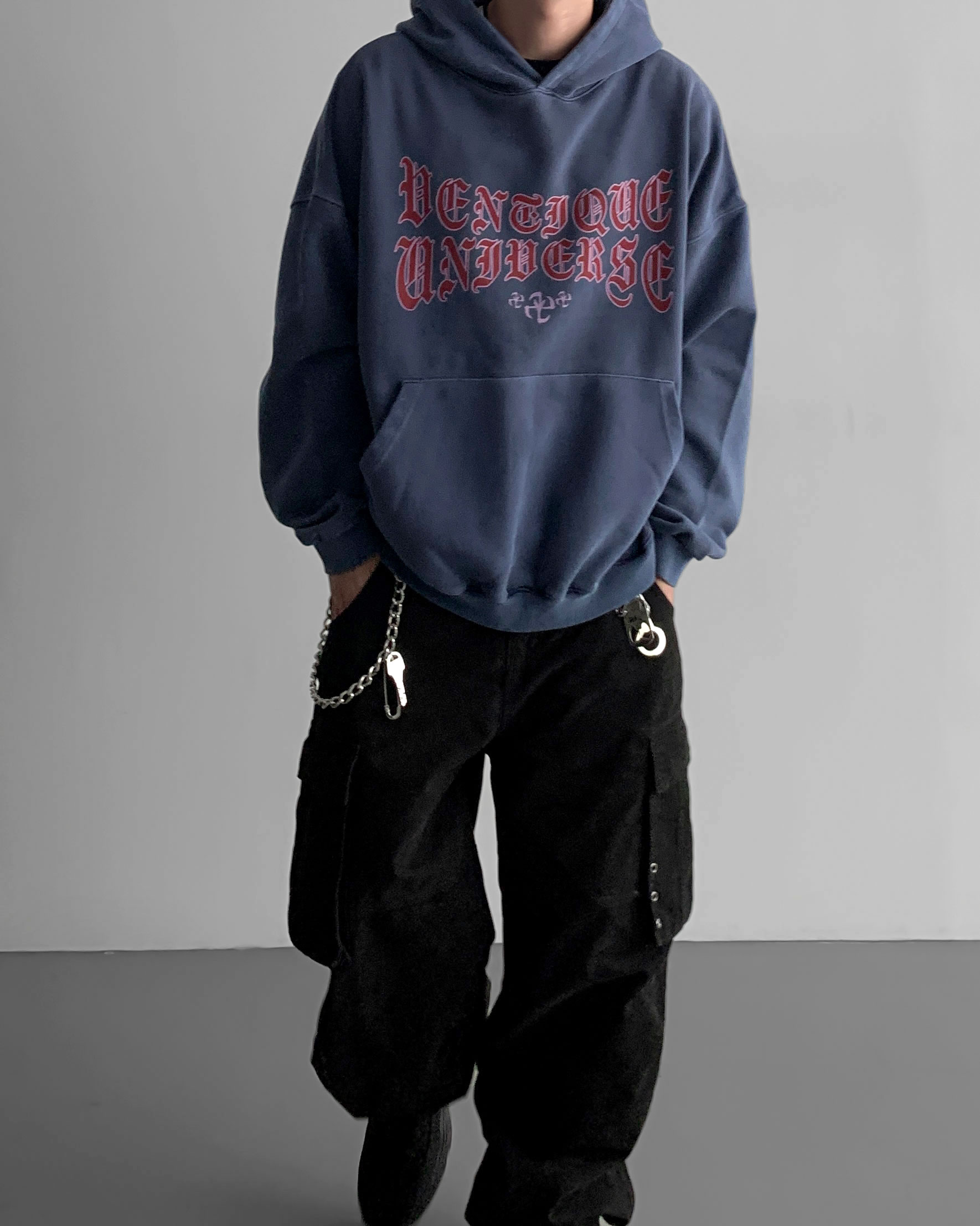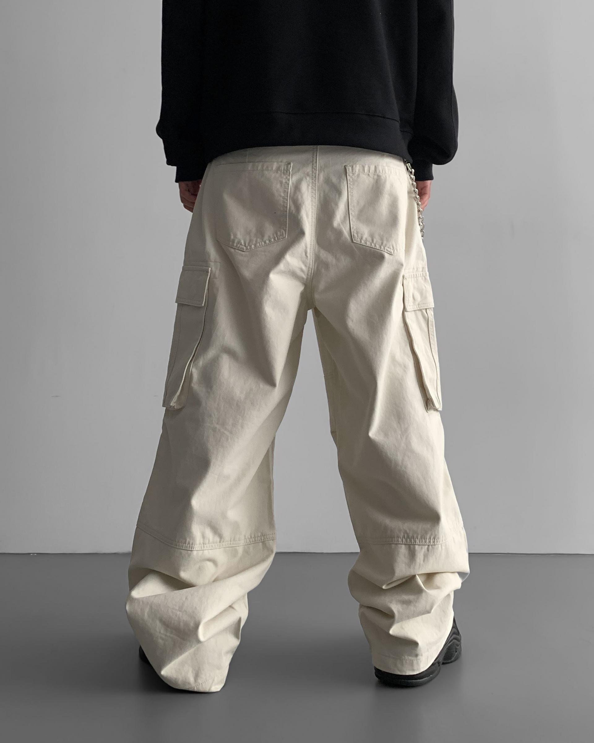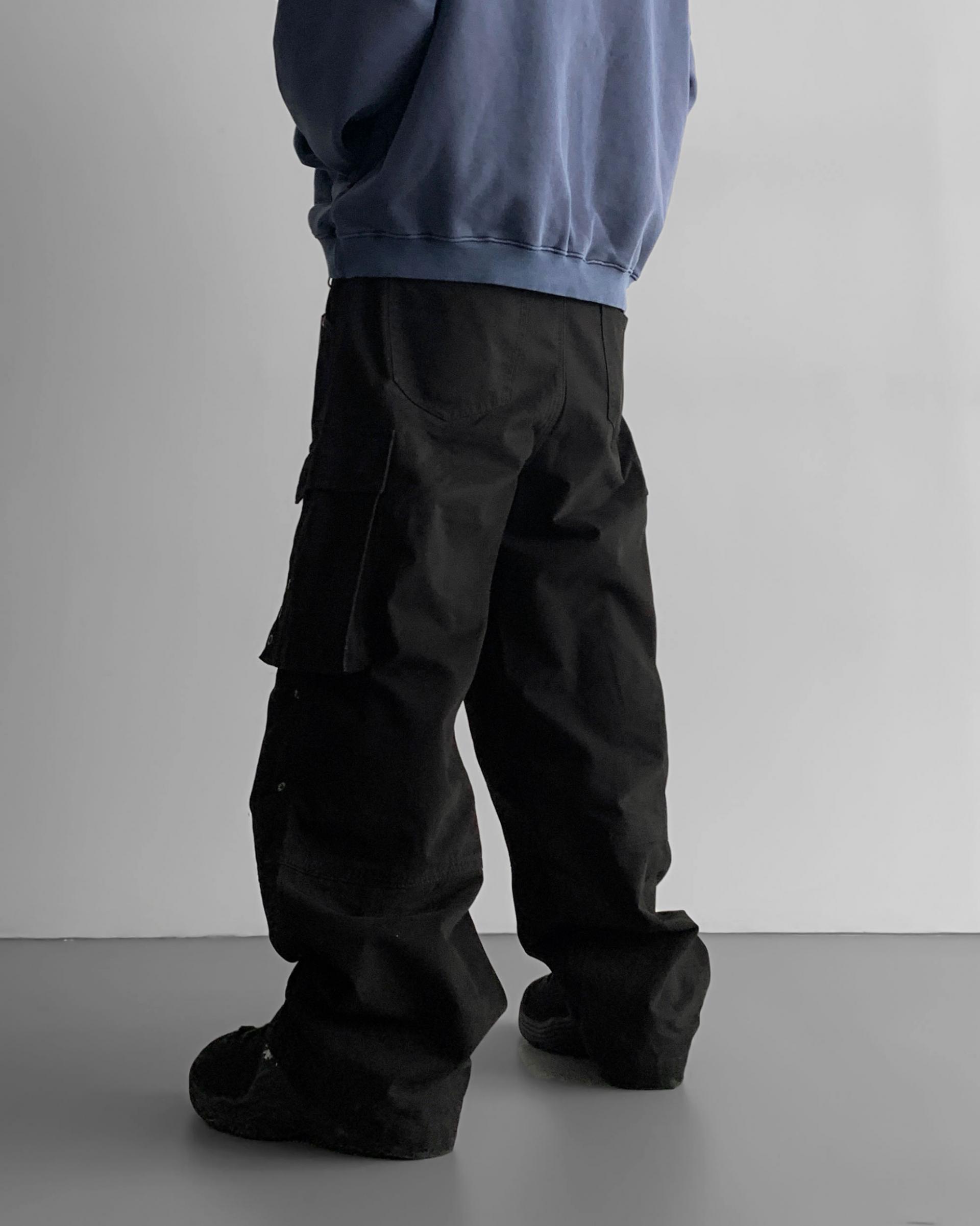 (모델에게 큰 사이즈를 선택하여 골반에 걸쳐서 착용. 와이드한 핏 연출)