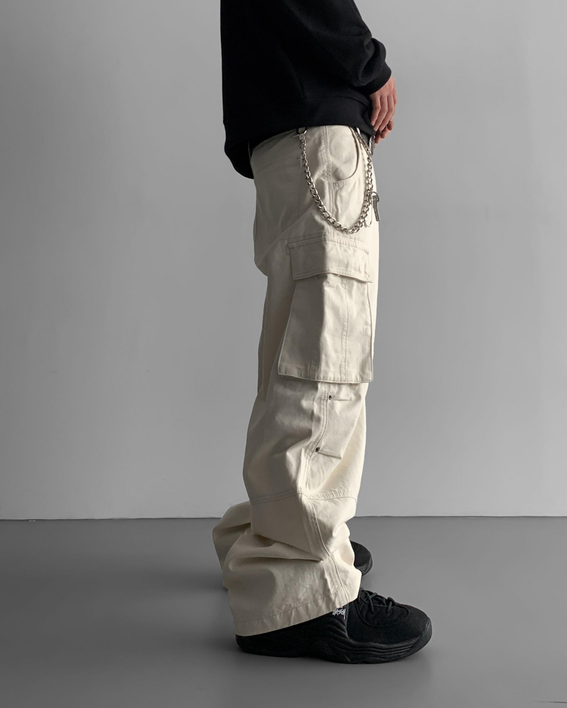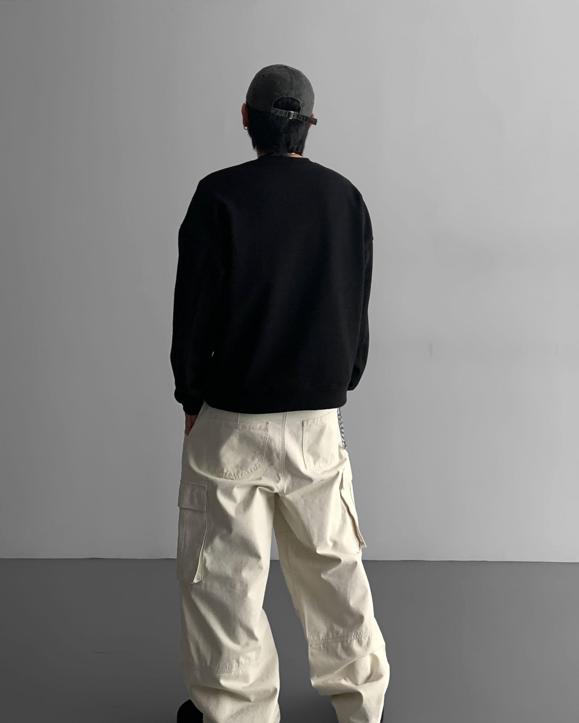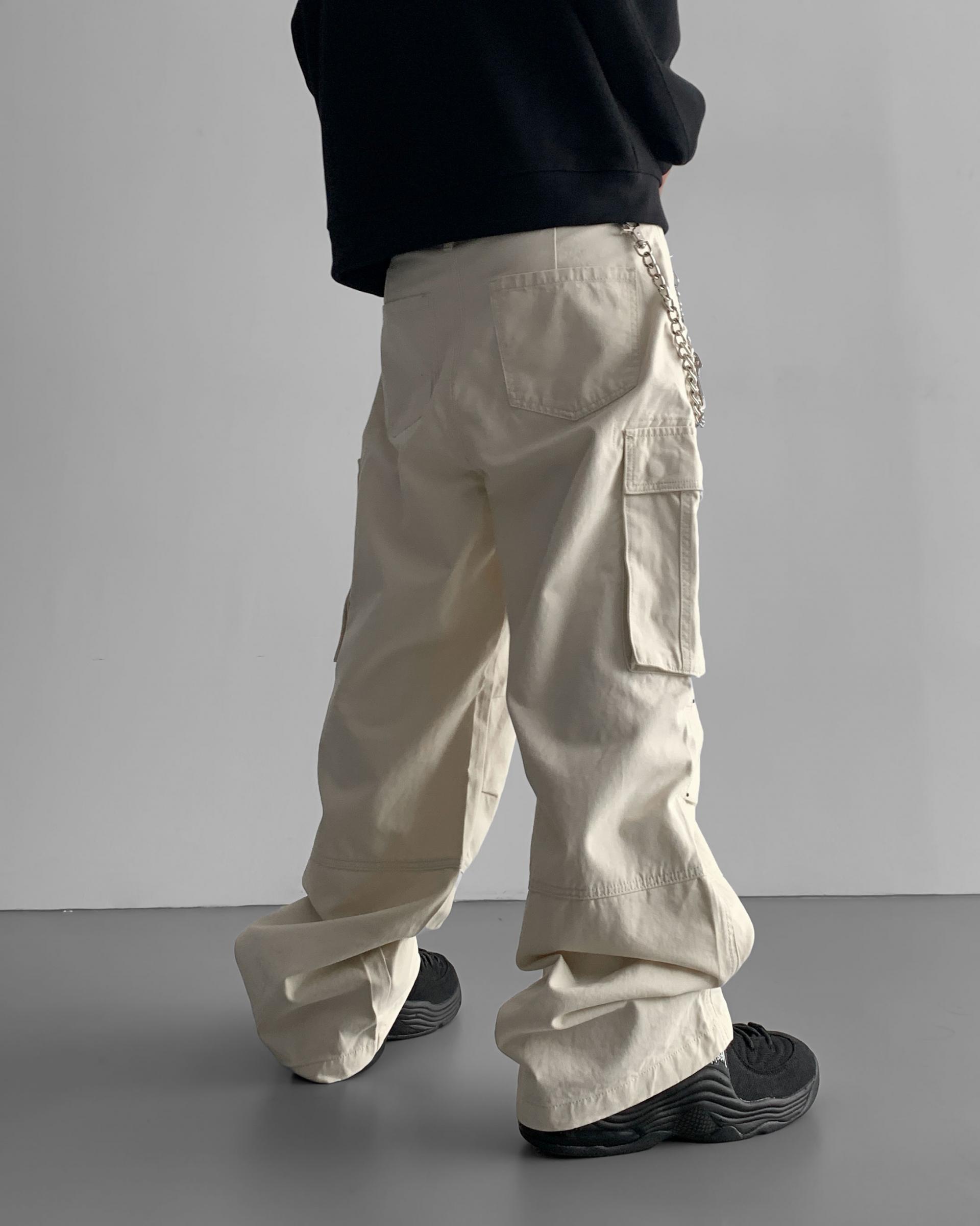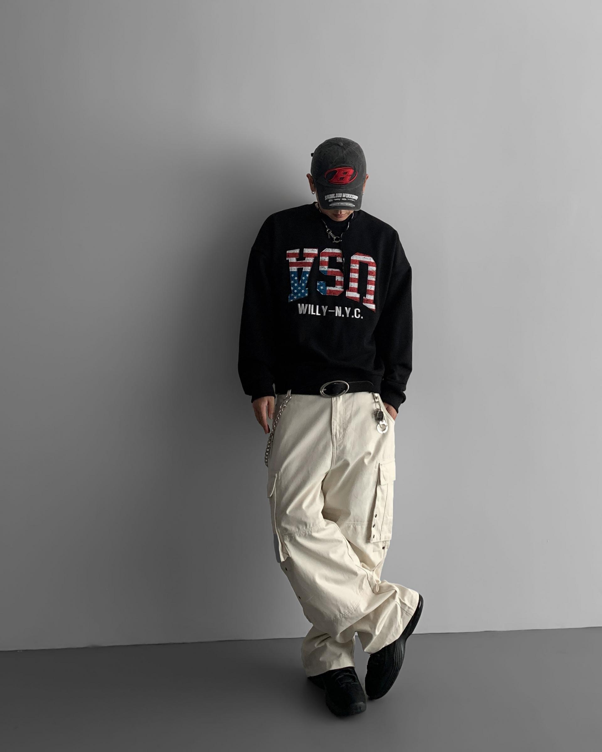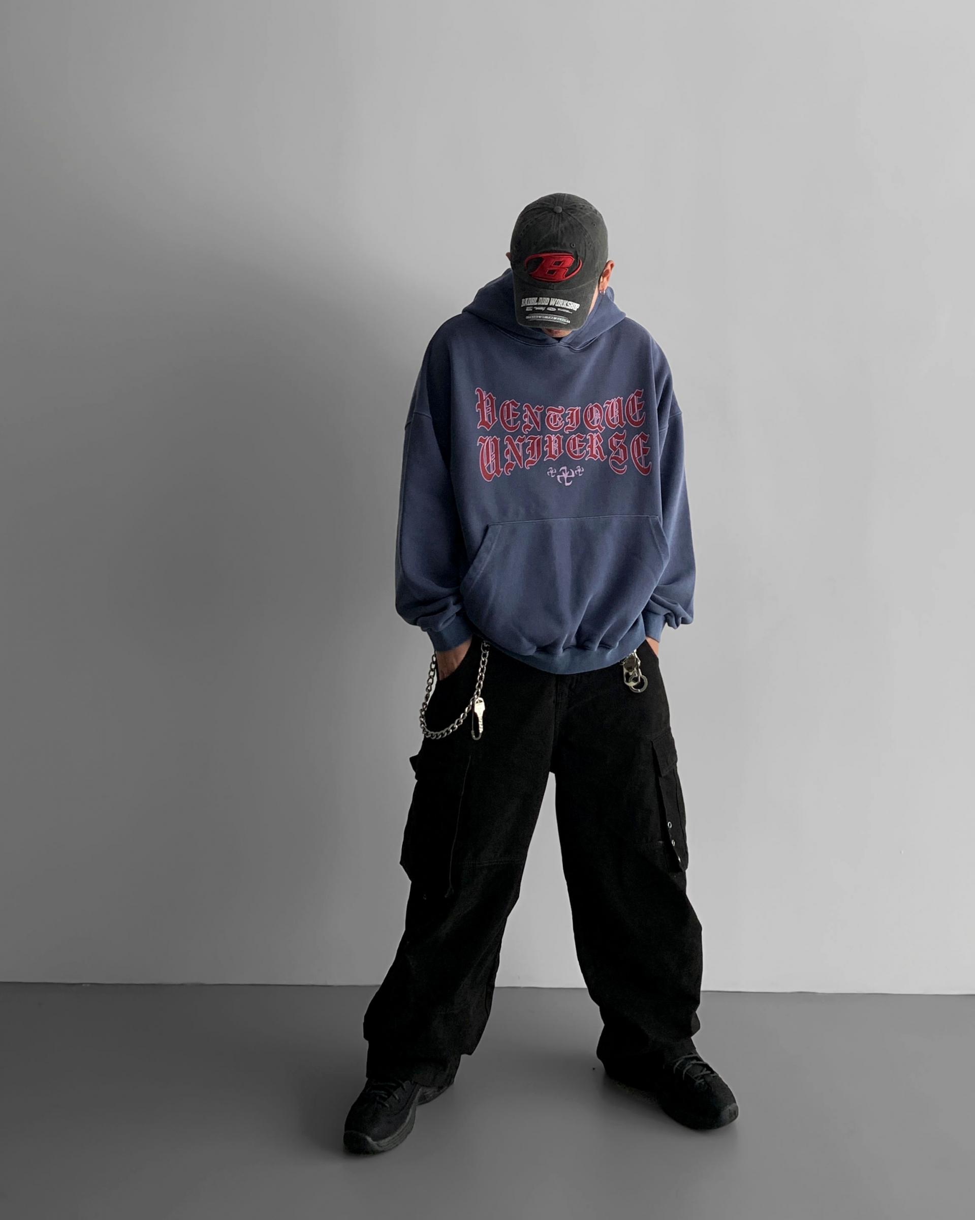(모델에게 큰 사이즈를 선택하여 골반에 걸쳐서 착용. 와이드한 핏 연출)