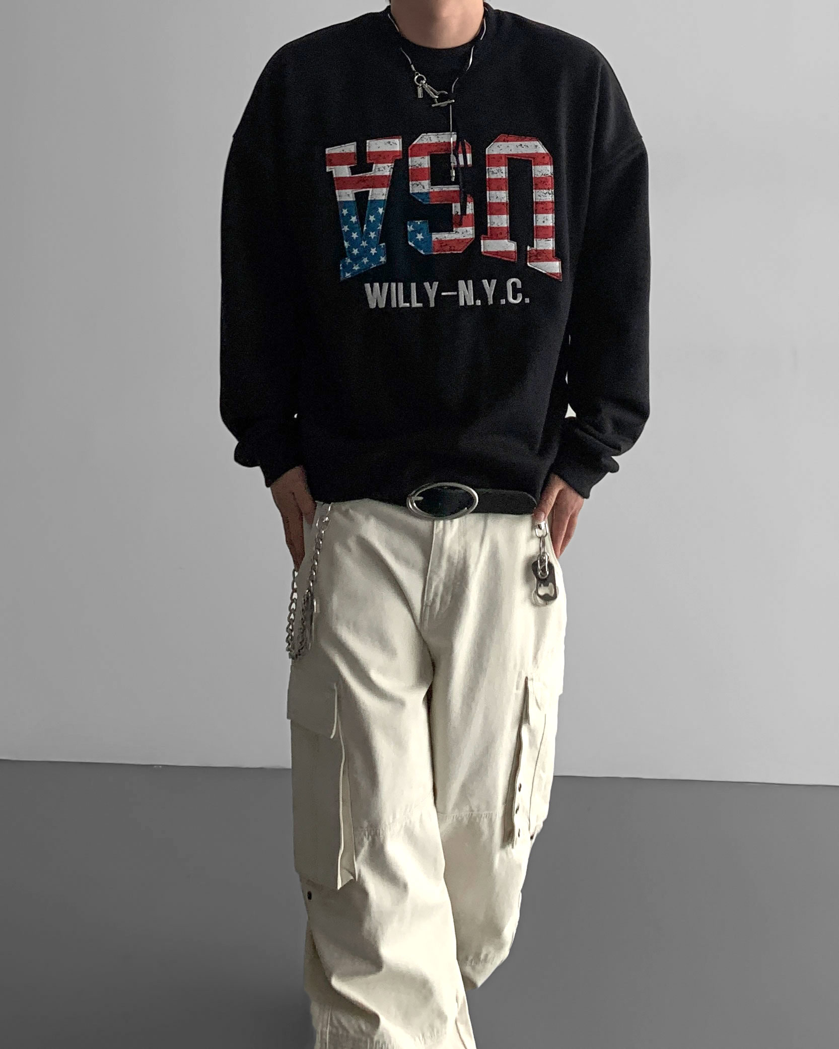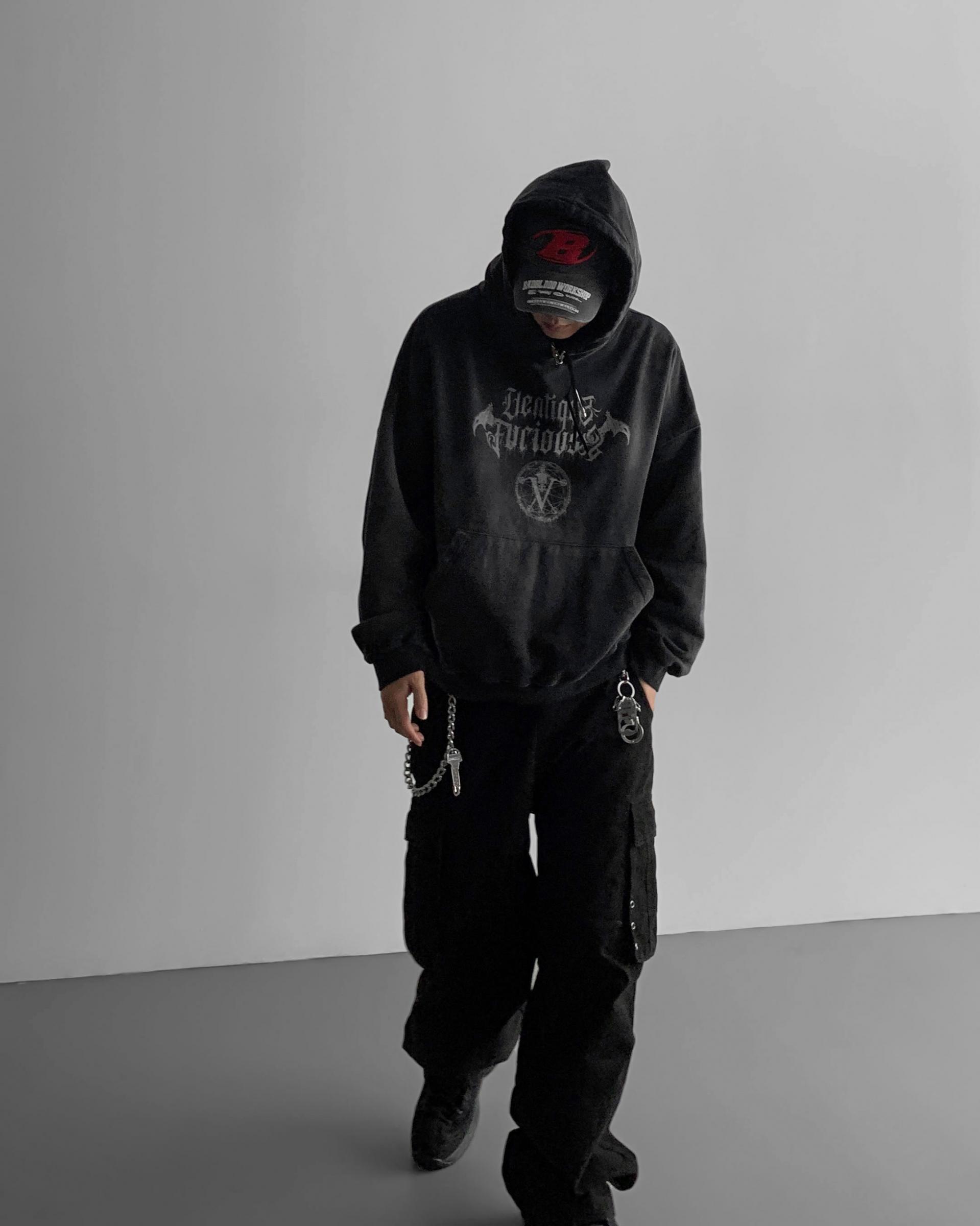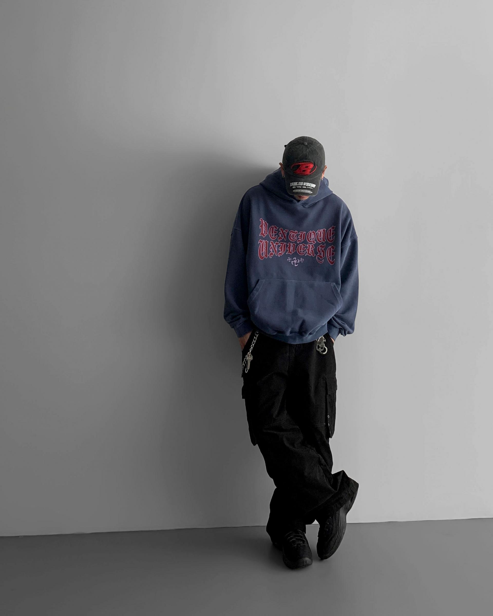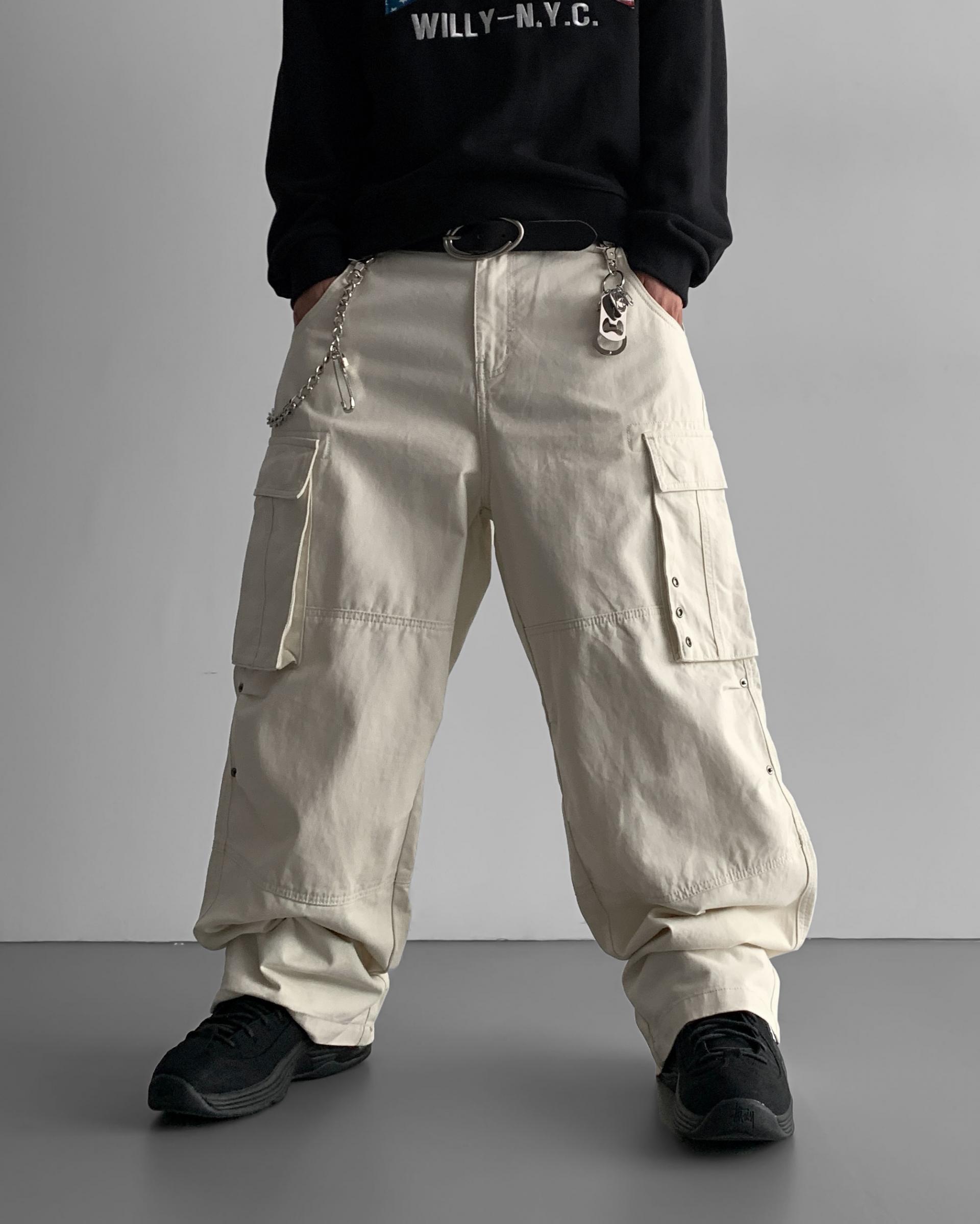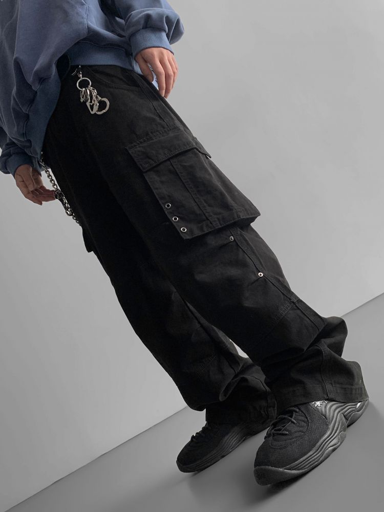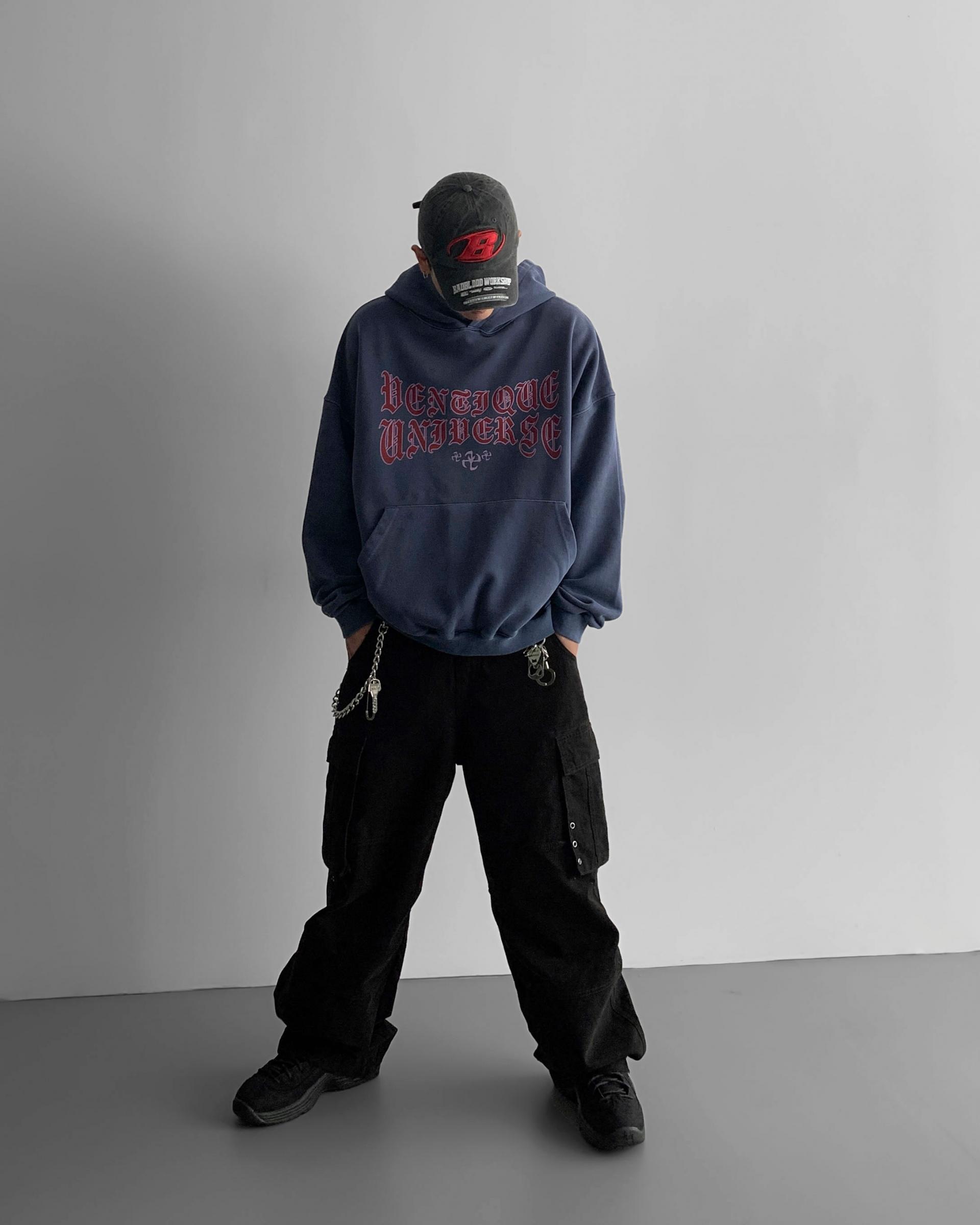(모델에게 큰 사이즈를 선택하여 골반에 걸쳐서 착용. 와이드한 핏 연출)