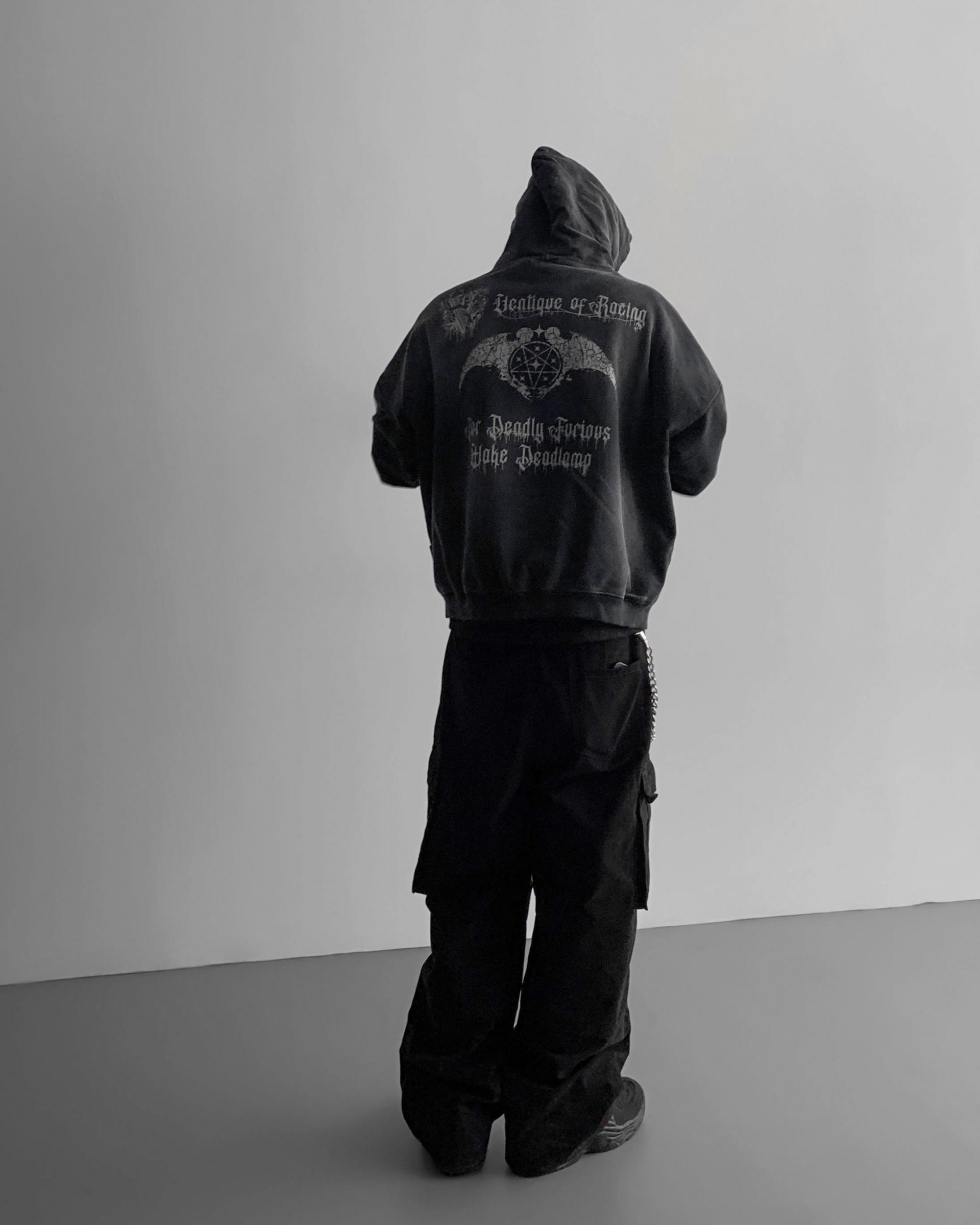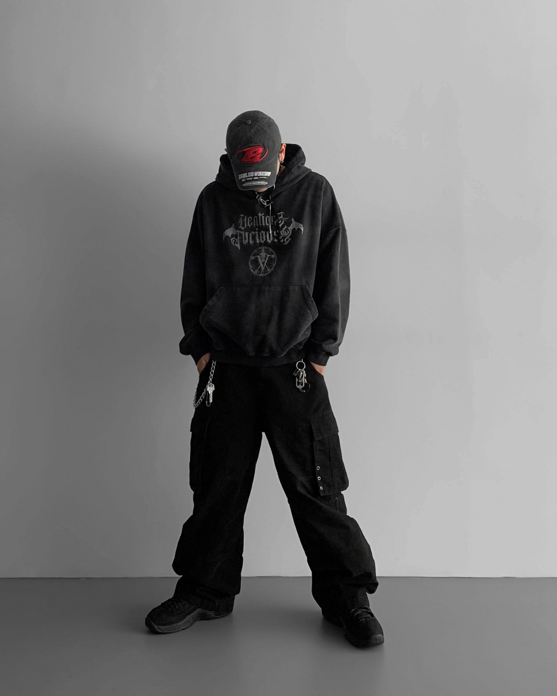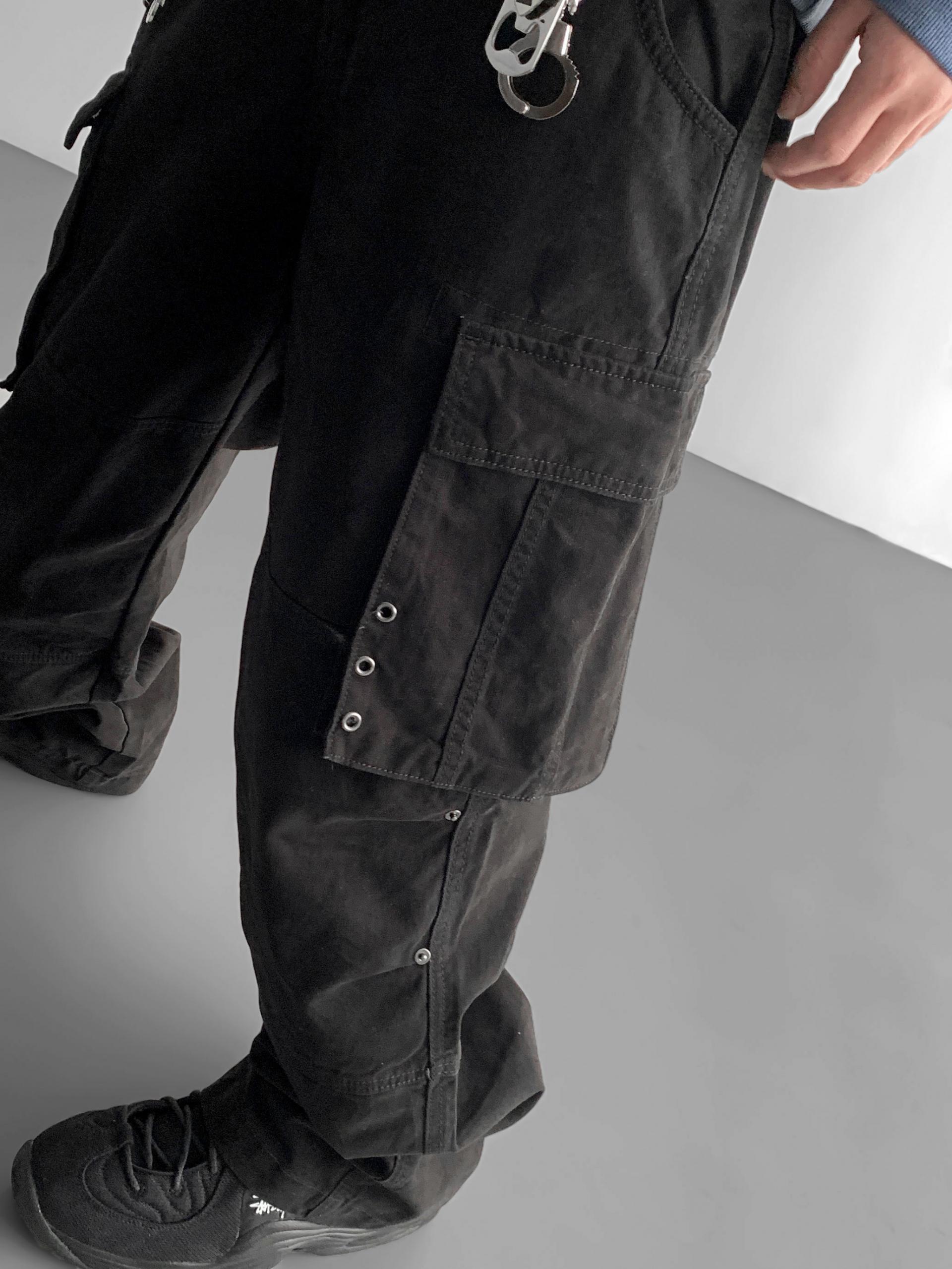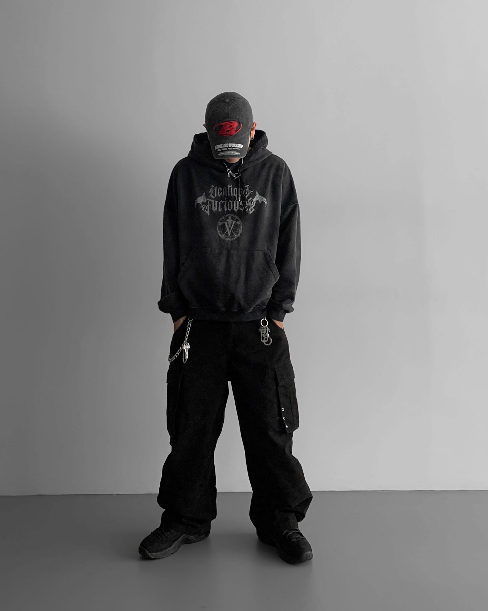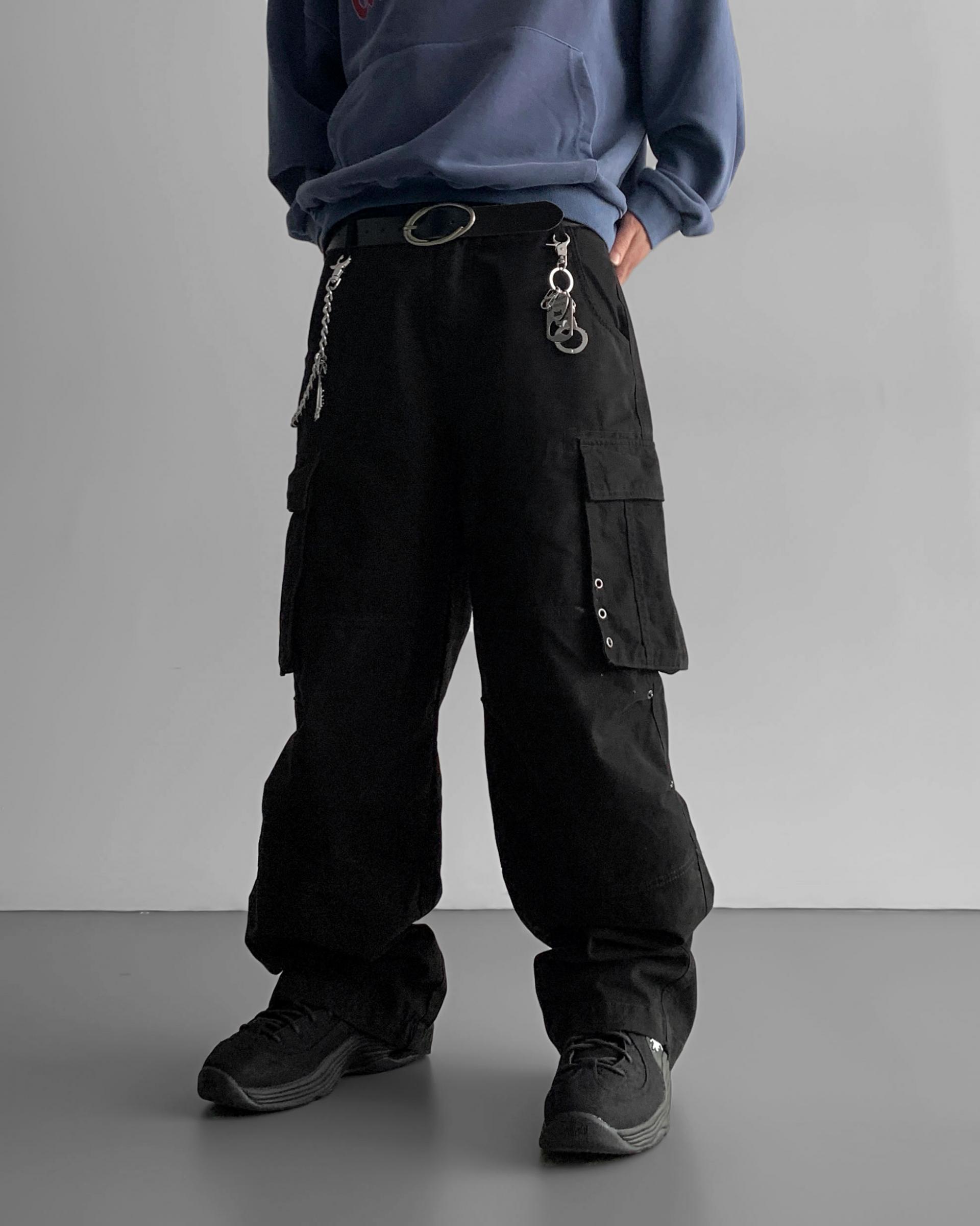 (모델에게 큰 사이즈를 선택하여 골반에 걸쳐서 착용. 와이드한 핏 연출)