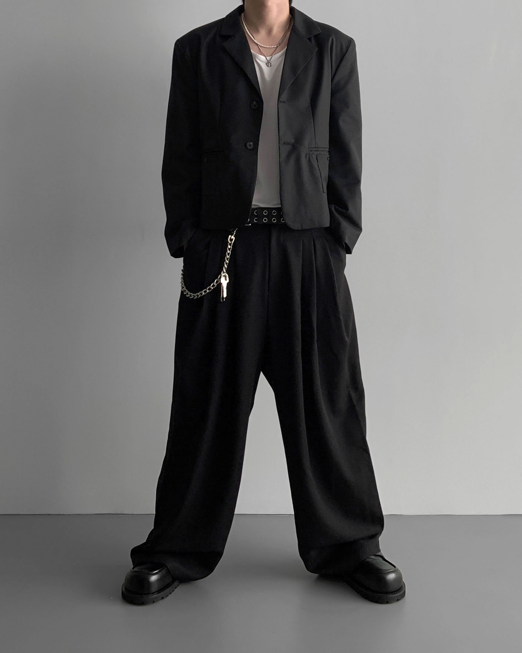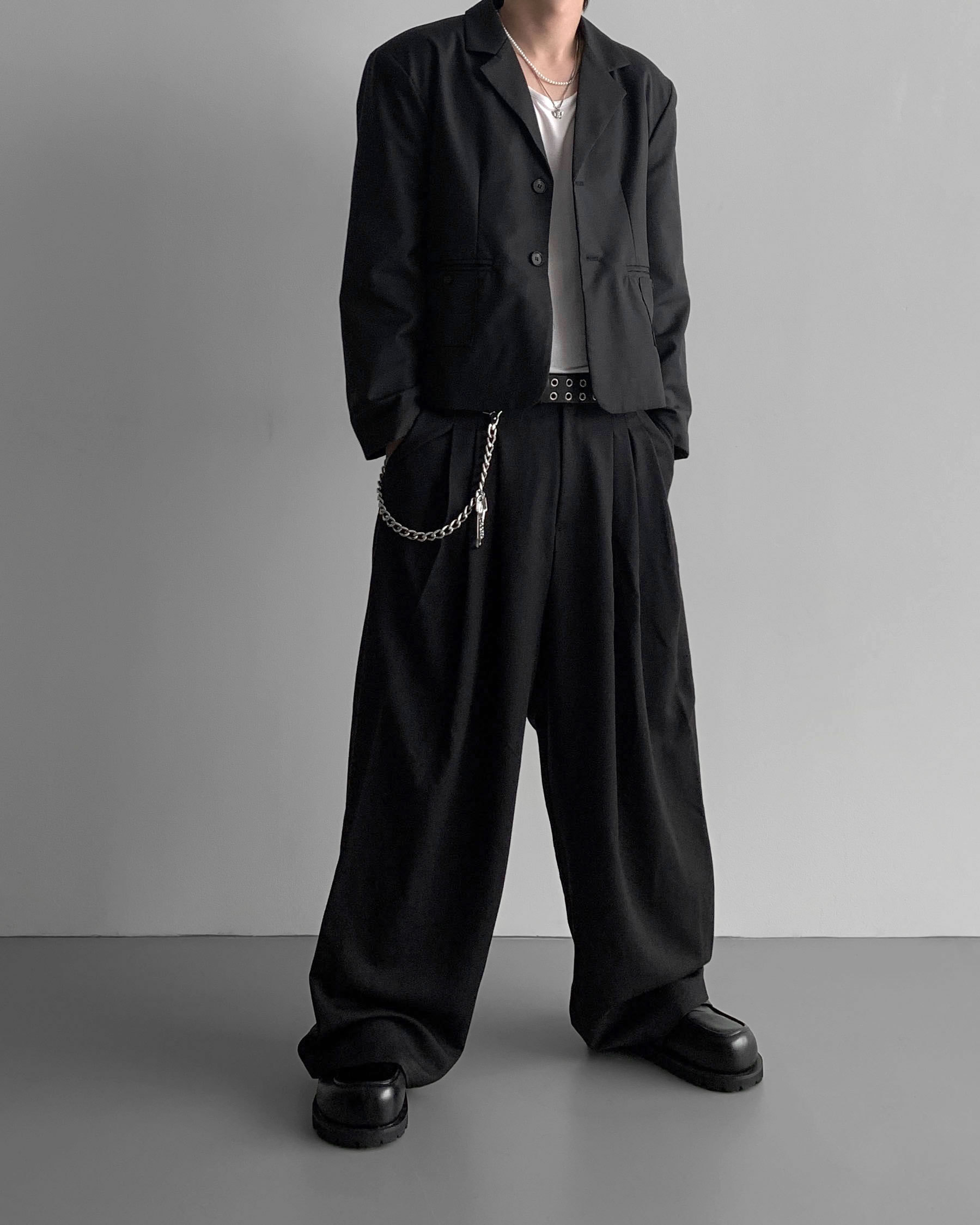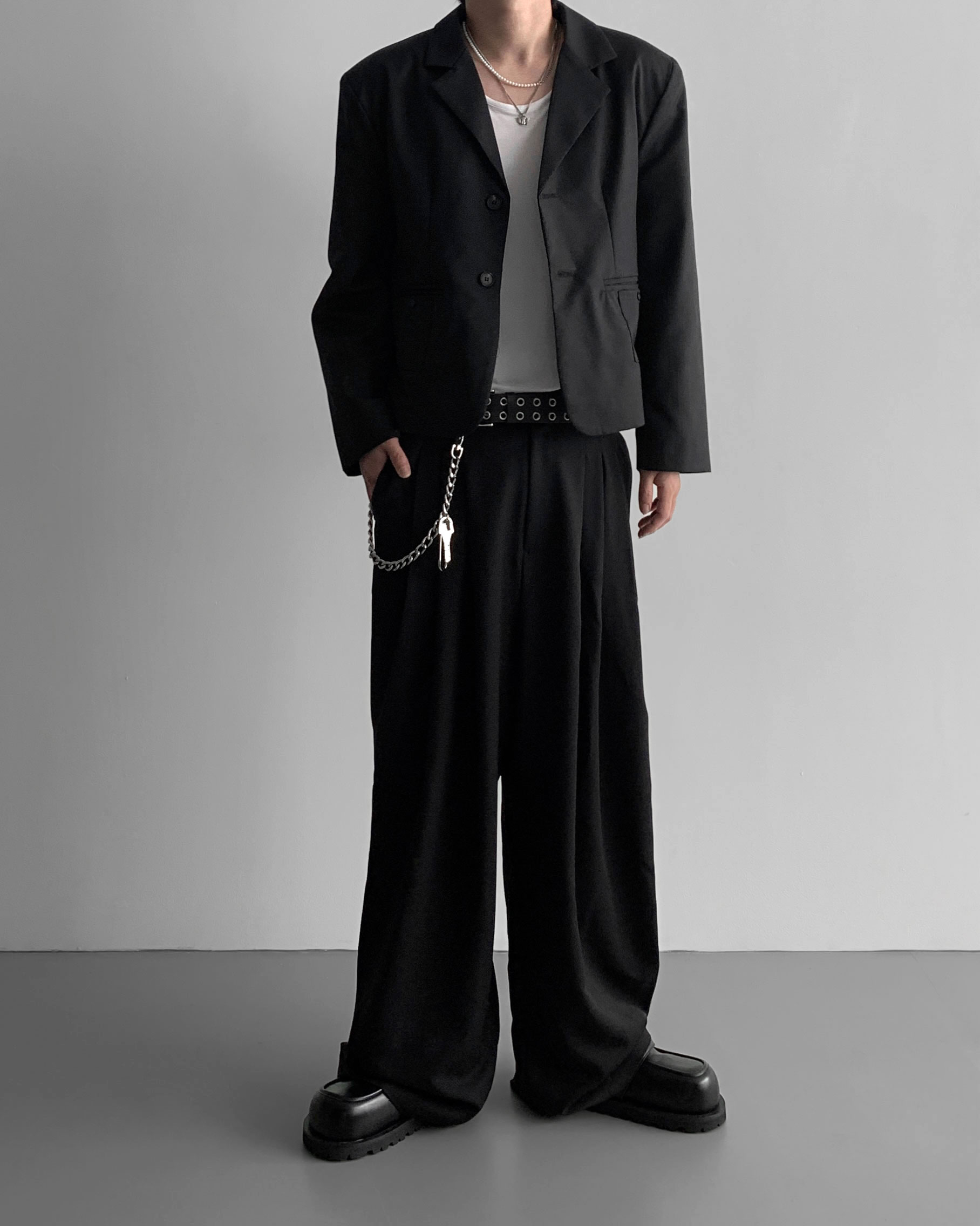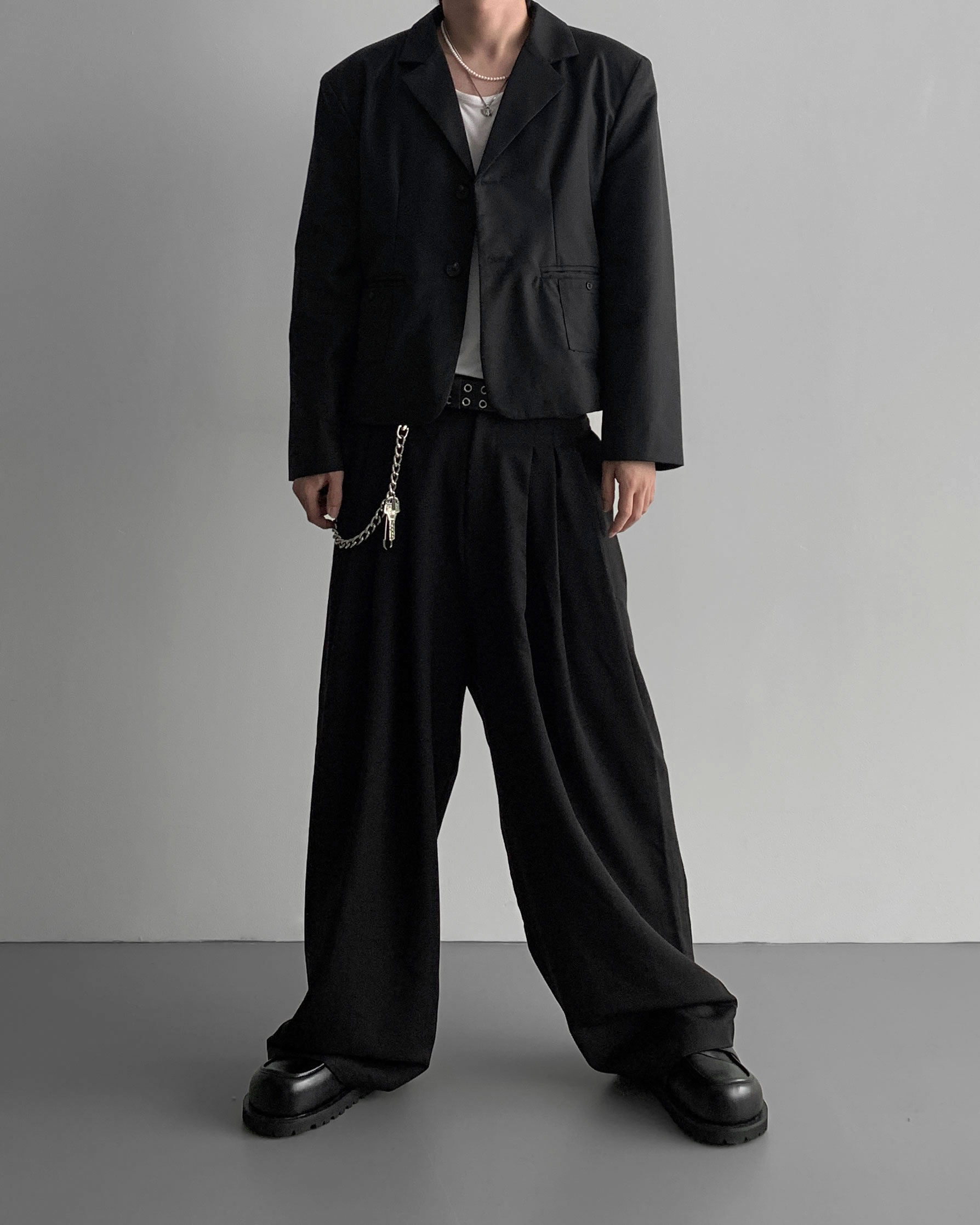 (팬츠를 약간 내려입어 골반에 걸쳐서 착용하였고 와이드로 떨어지는 핏)