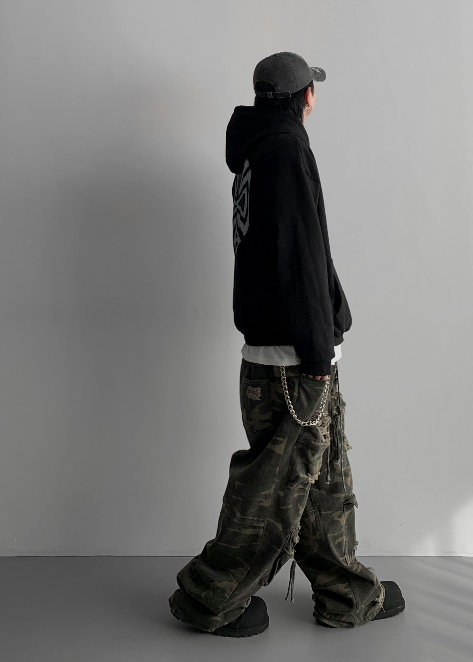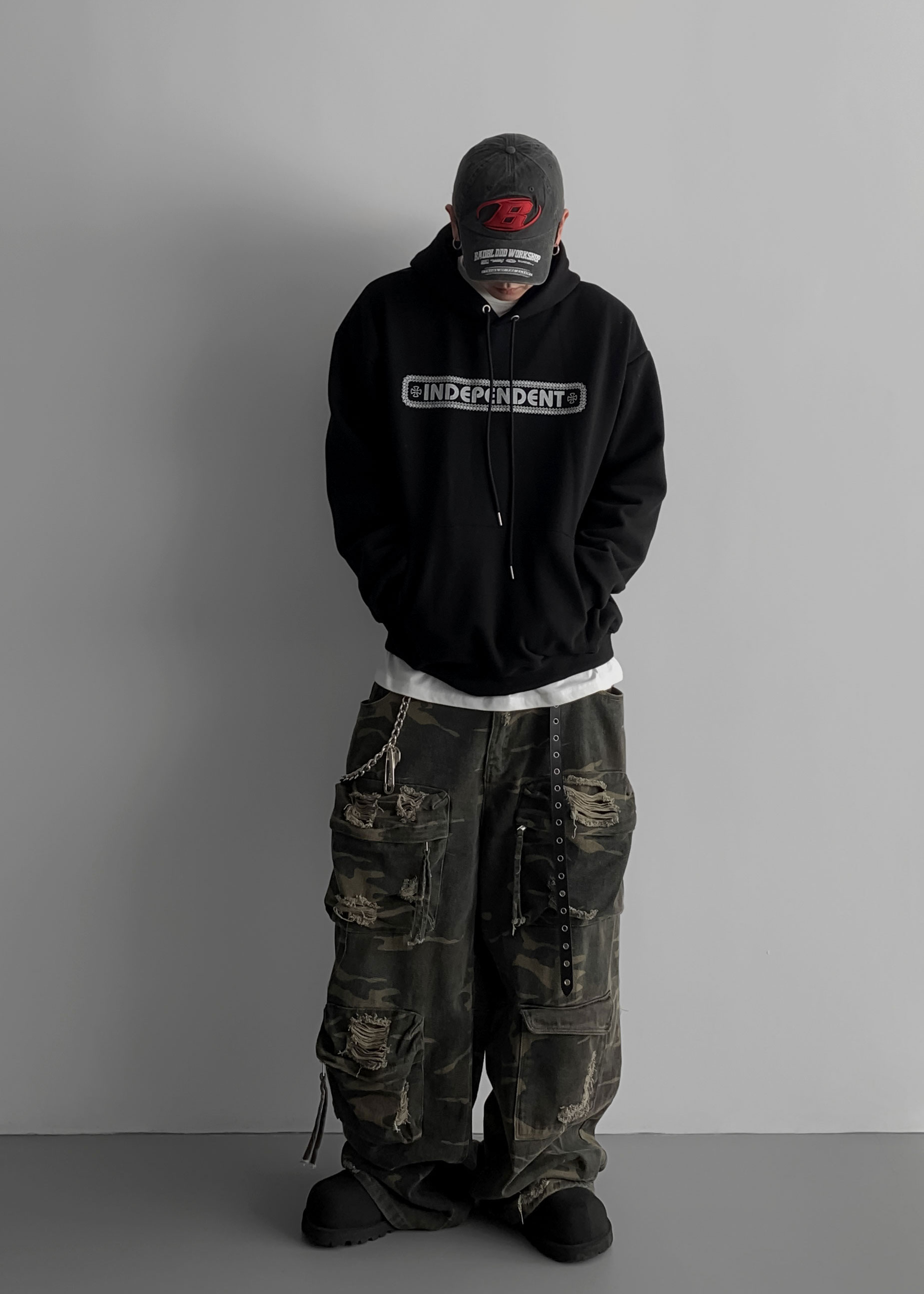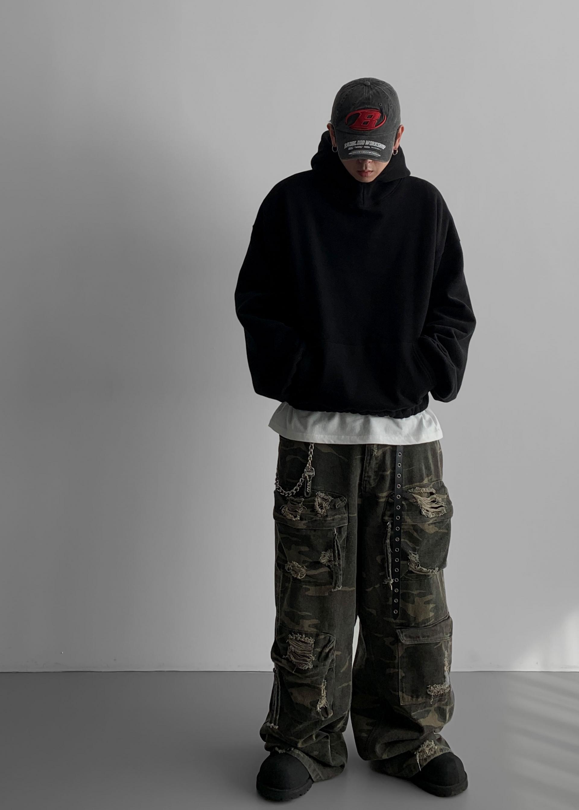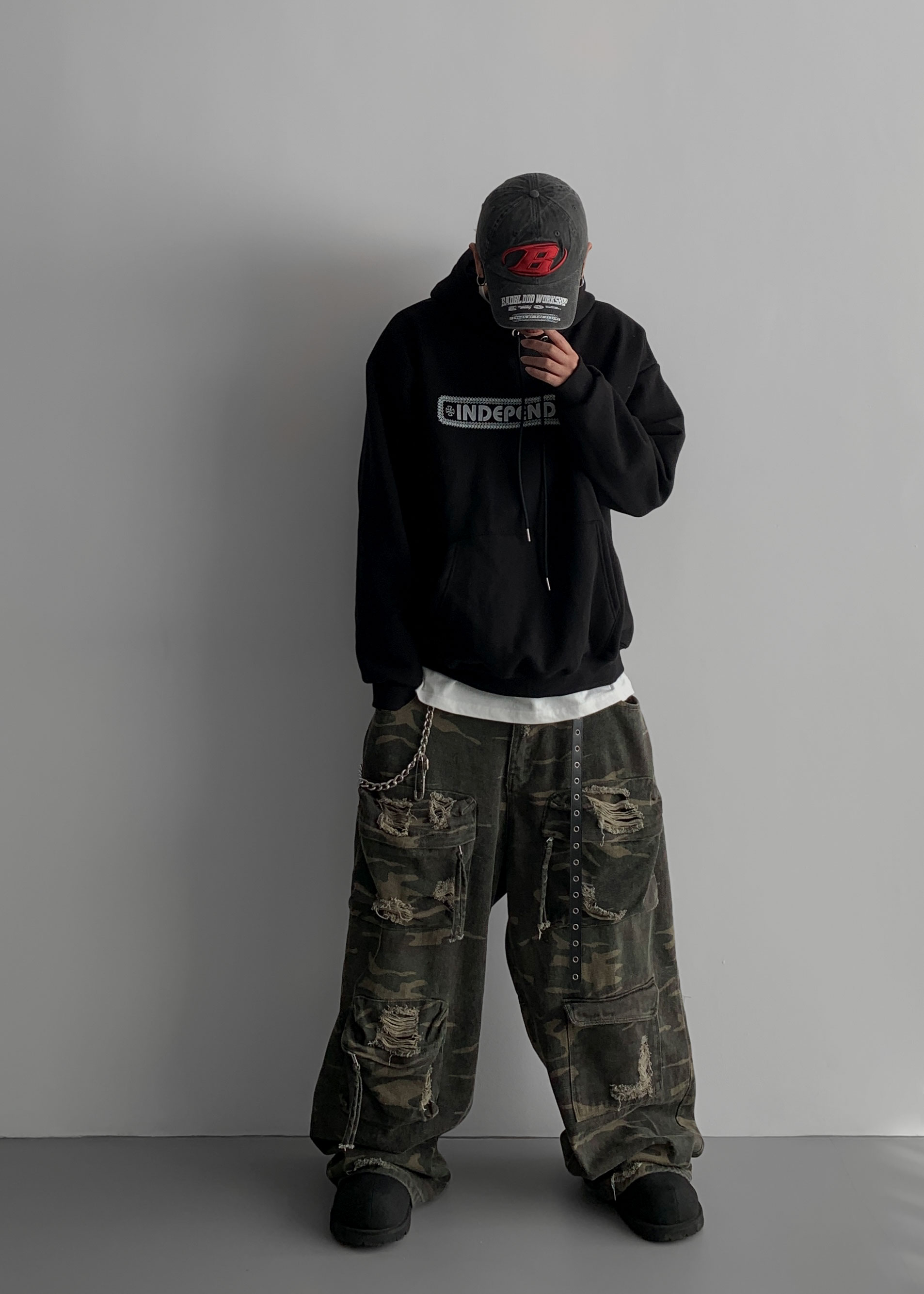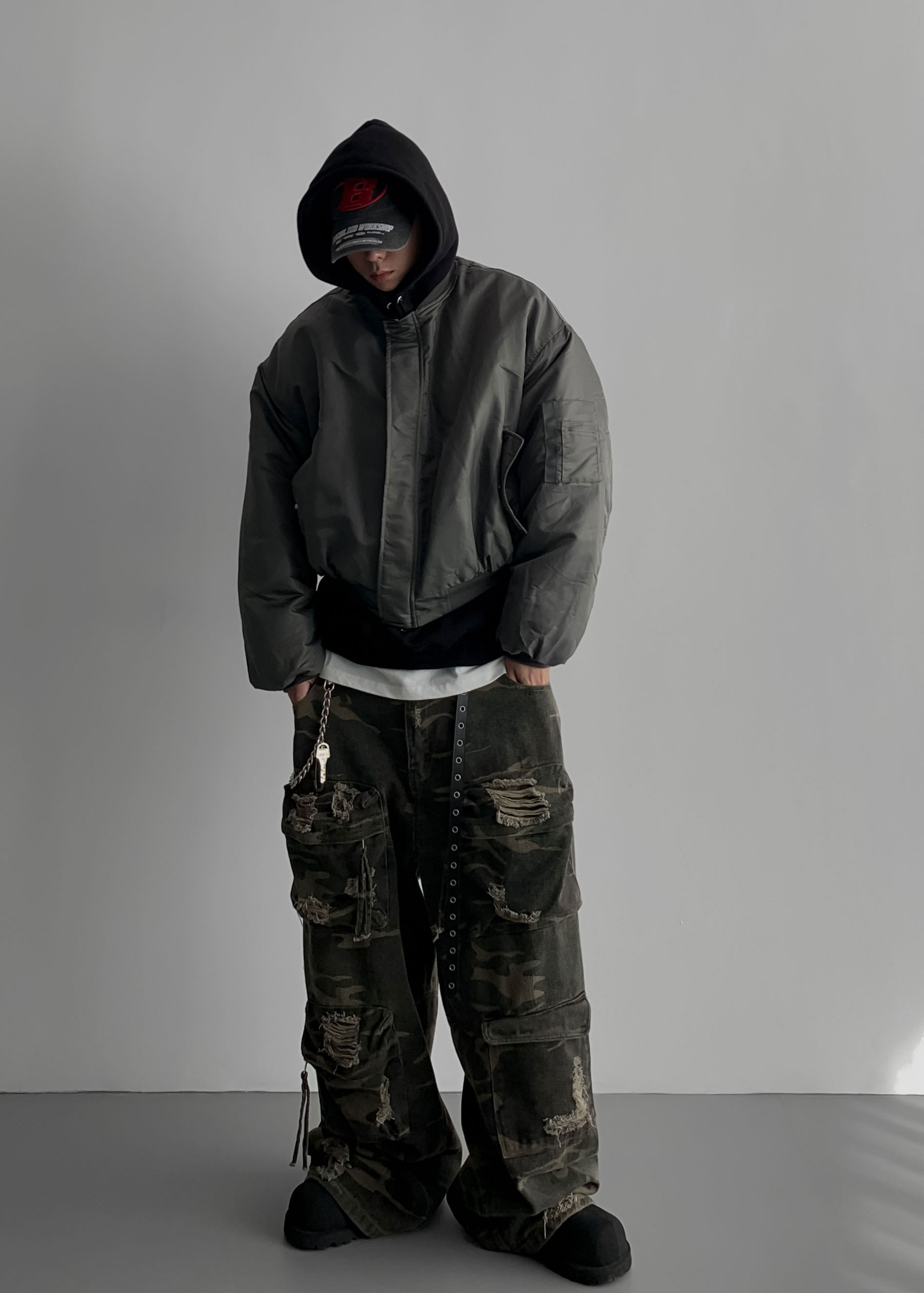 (팬츠를 약간 내려입어 골반에 걸쳐서 착용하였고 와이드한 핏 연출)