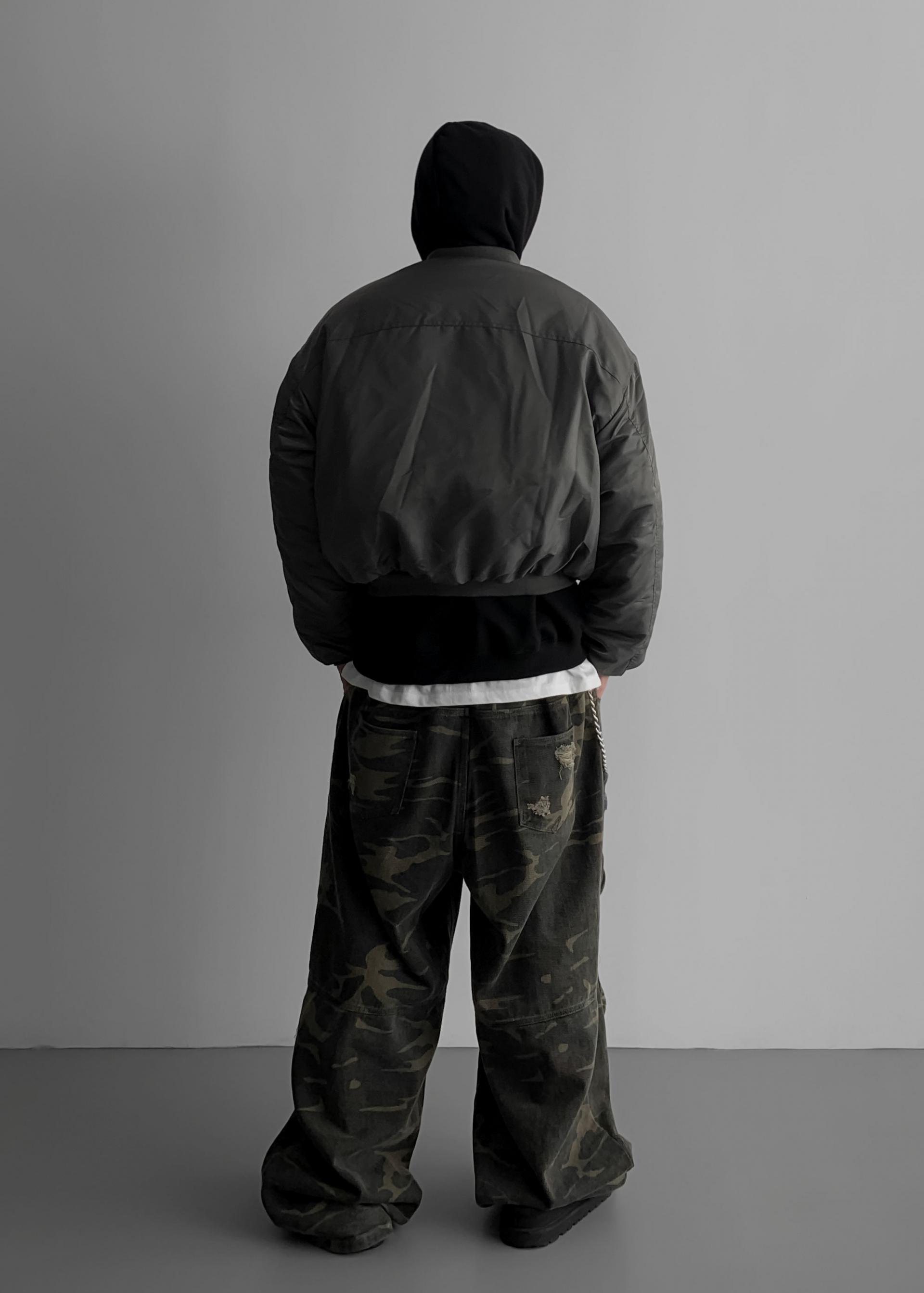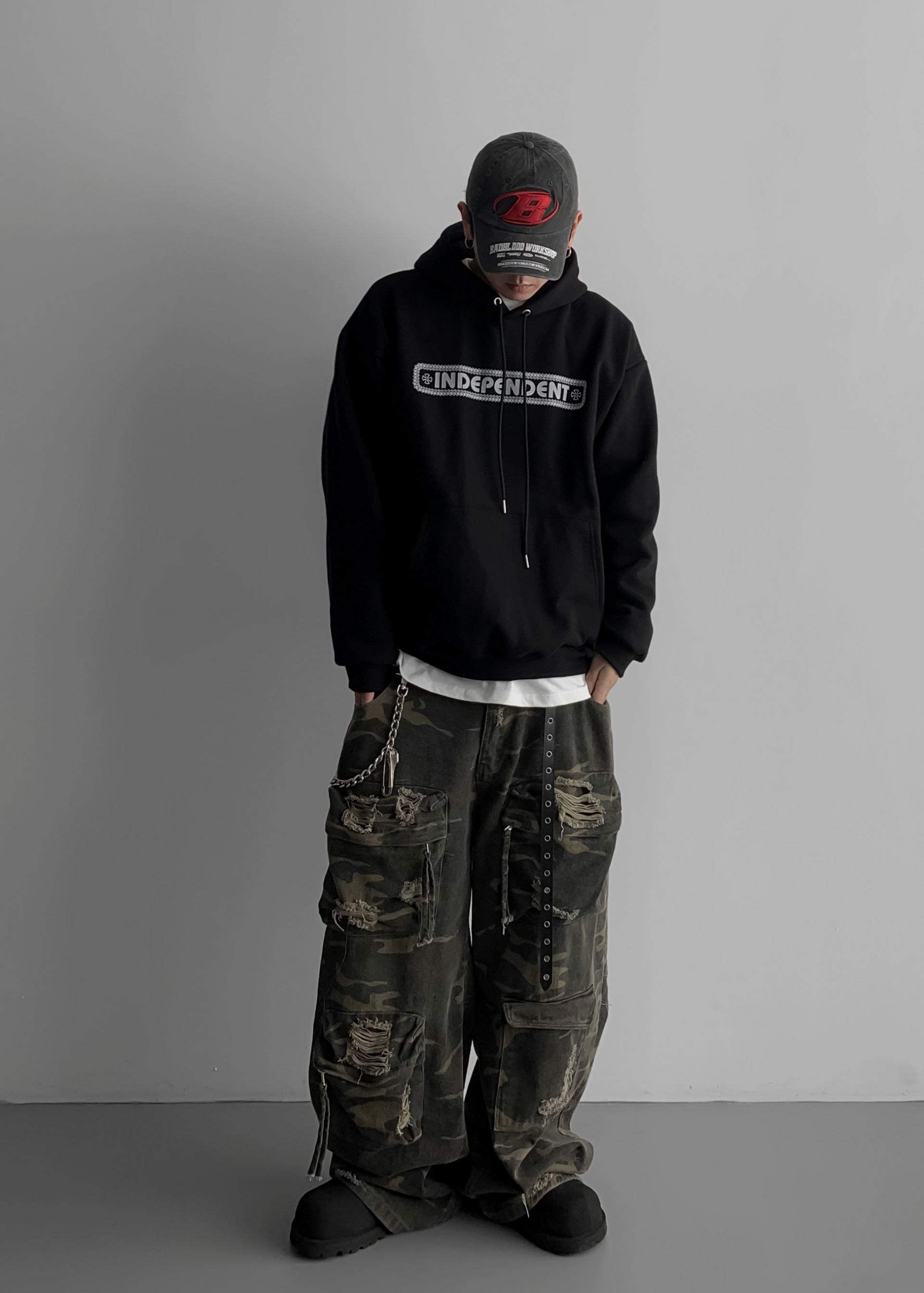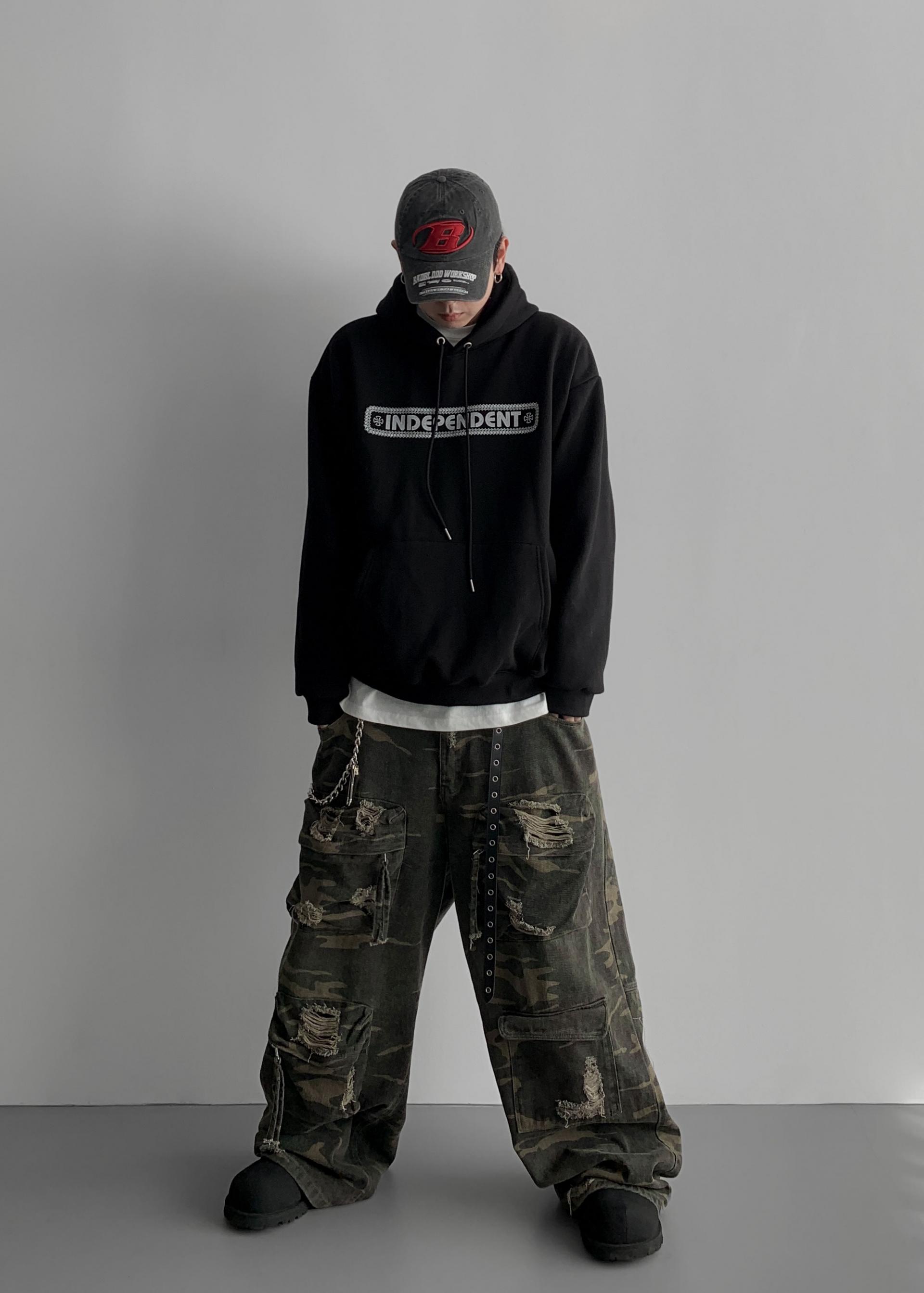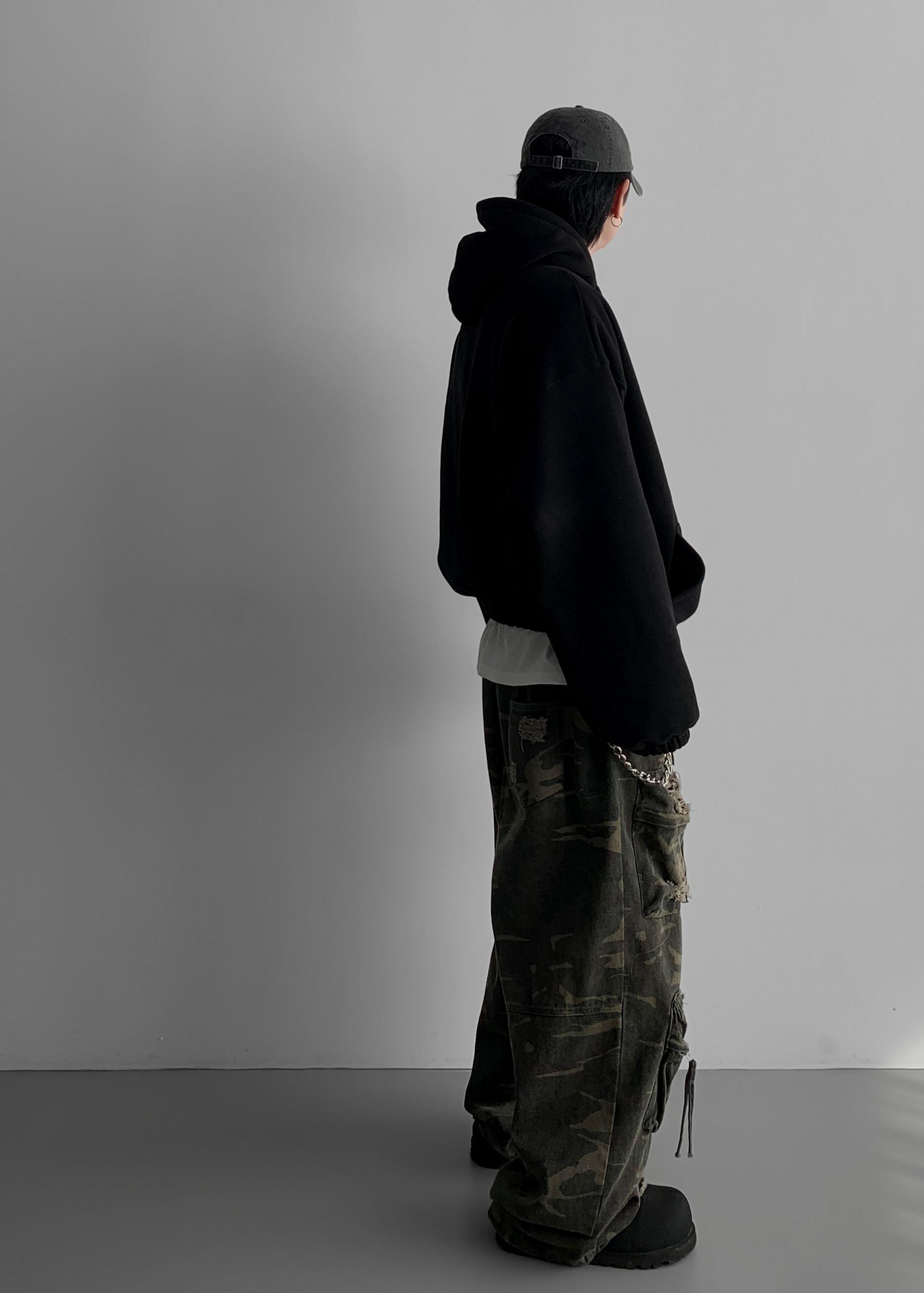(팬츠를 약간 내려입어 골반에 걸쳐서 착용하였고 와이드한 핏 연출)