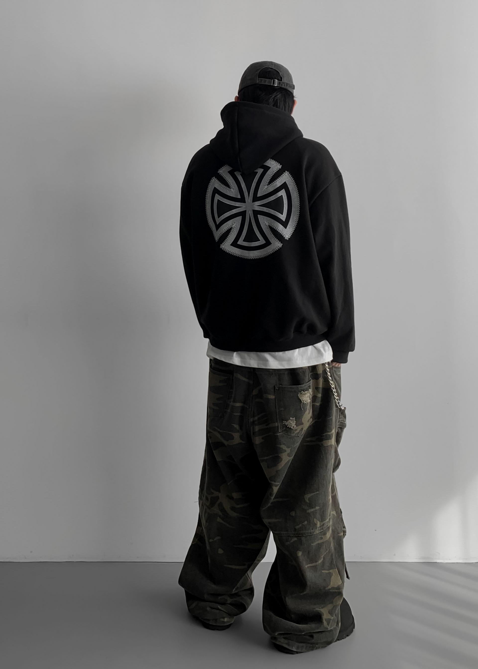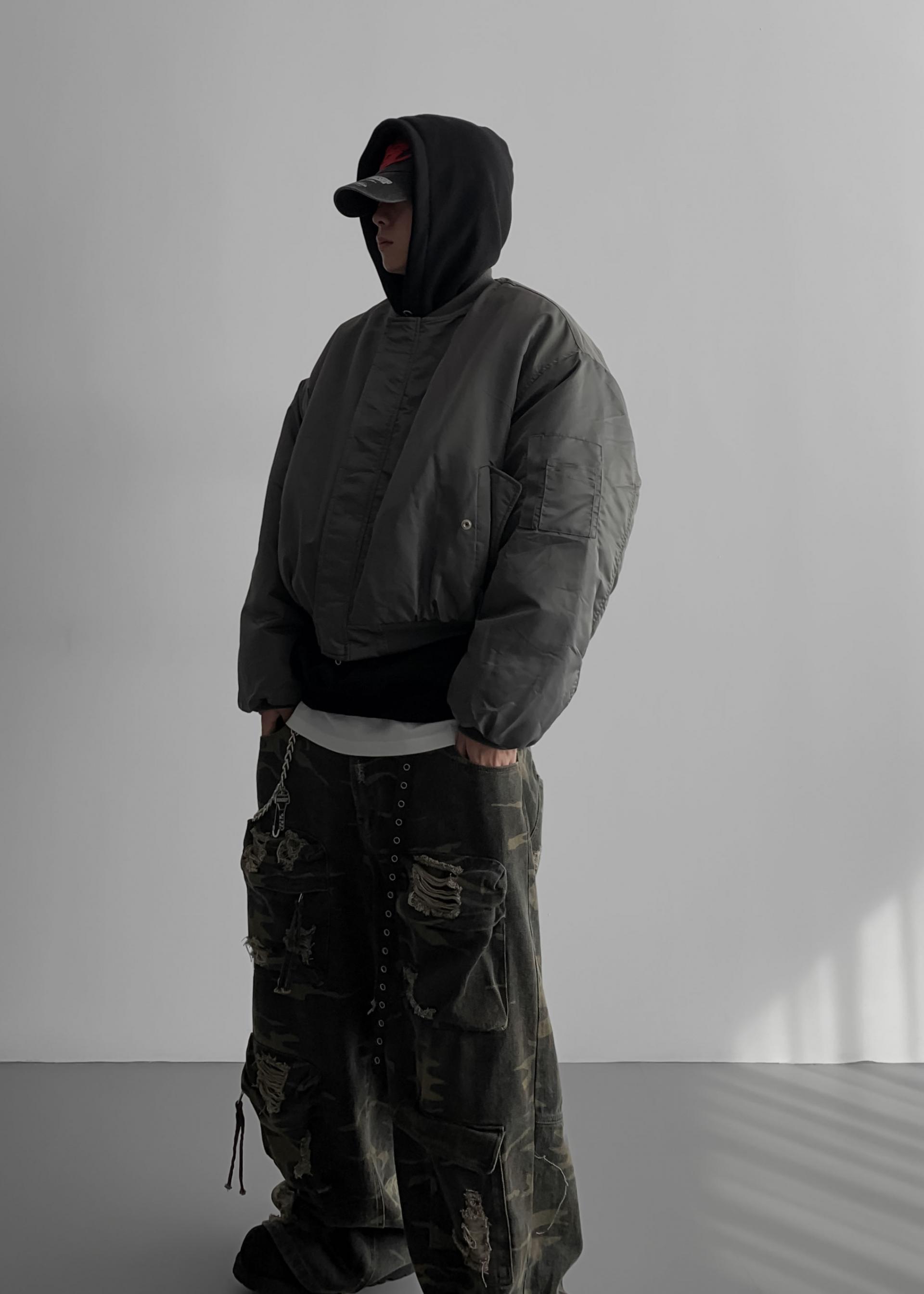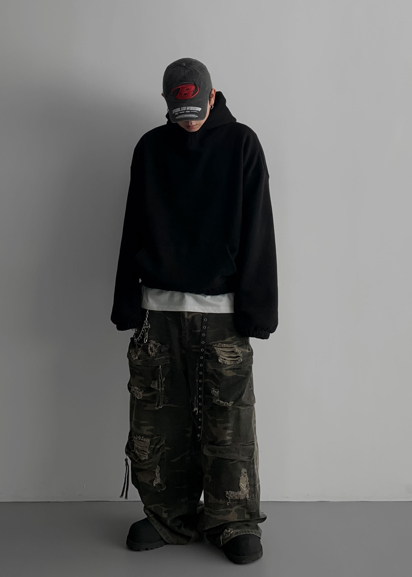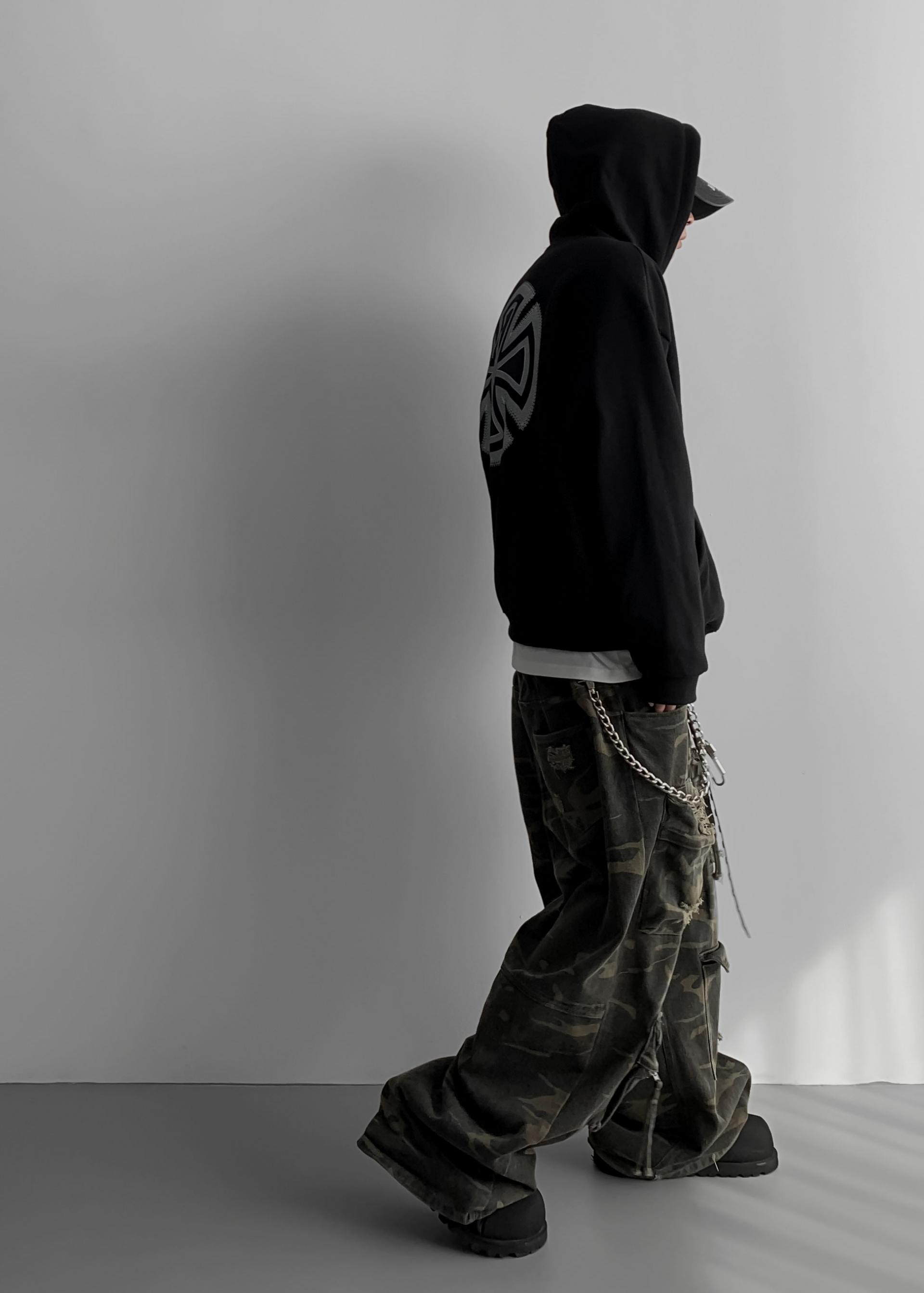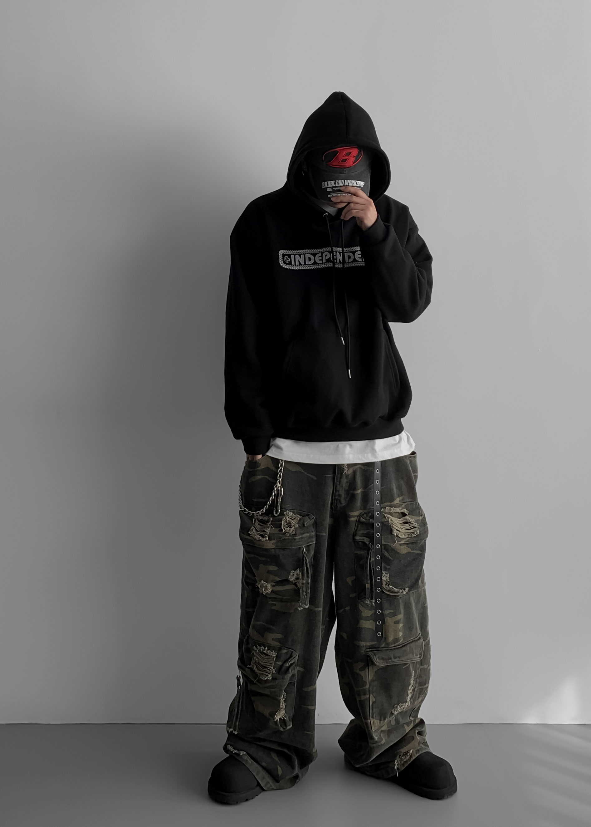 (팬츠를 약간 내려입어 골반에 걸쳐서 착용하였고 와이드한 핏 연출)