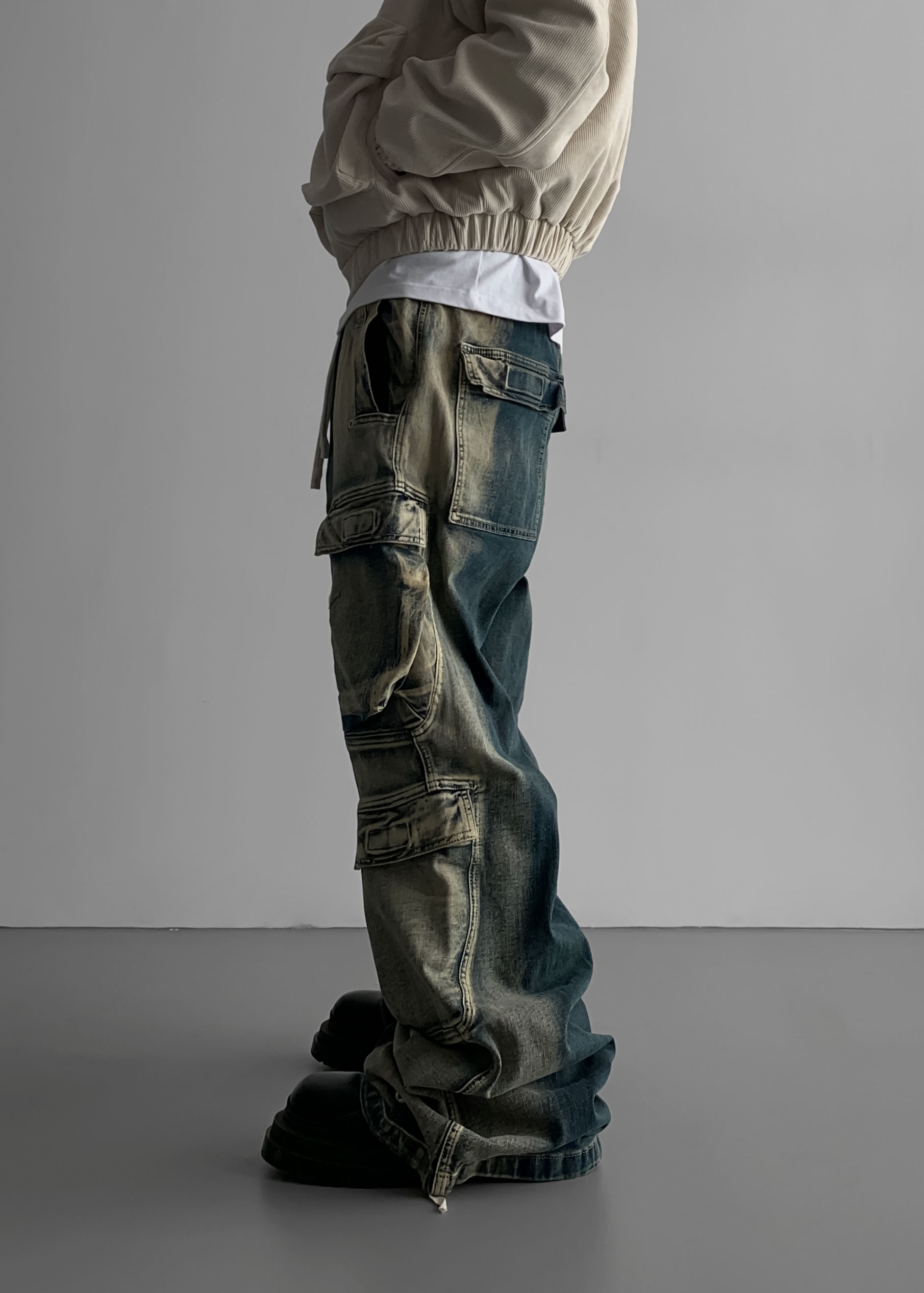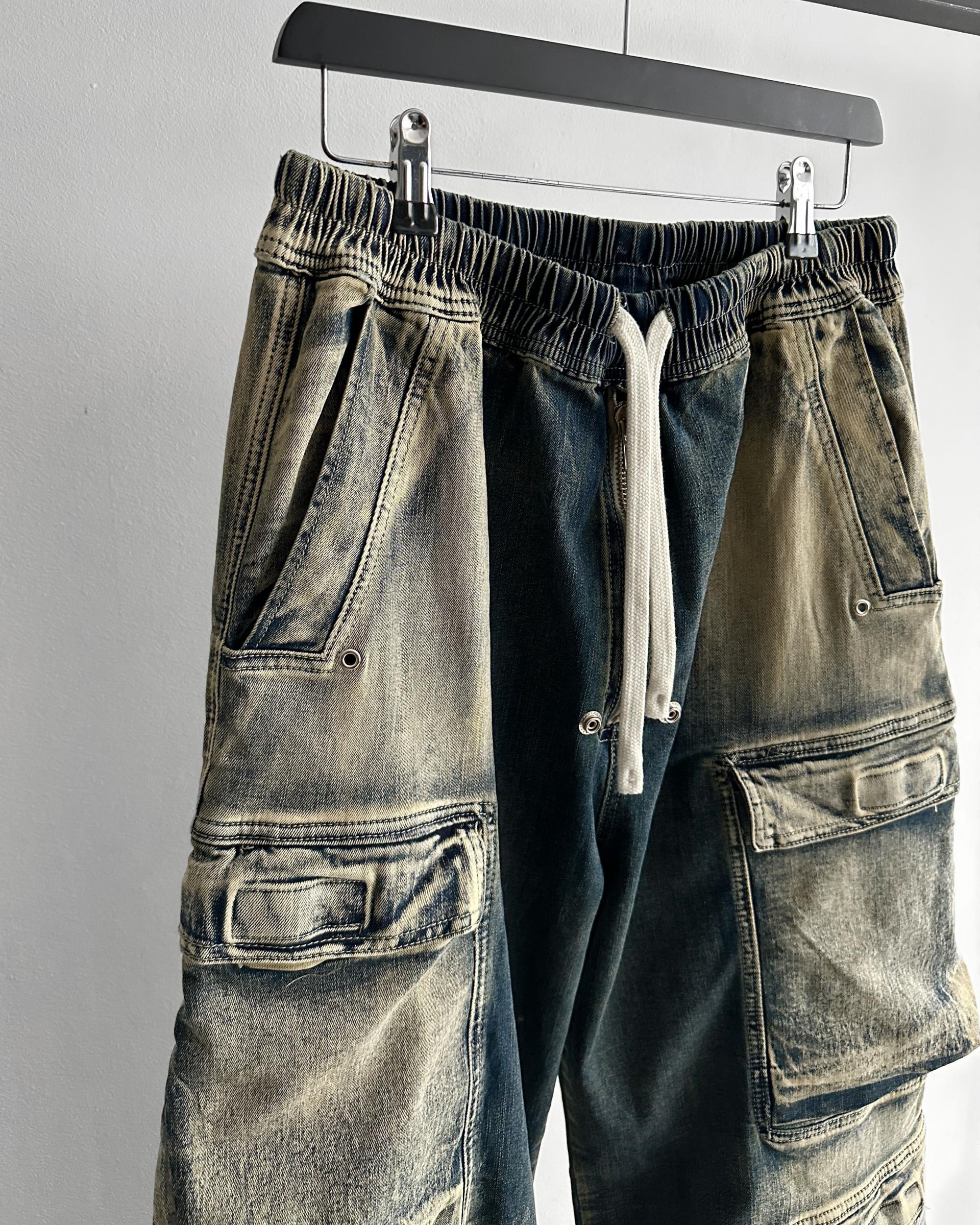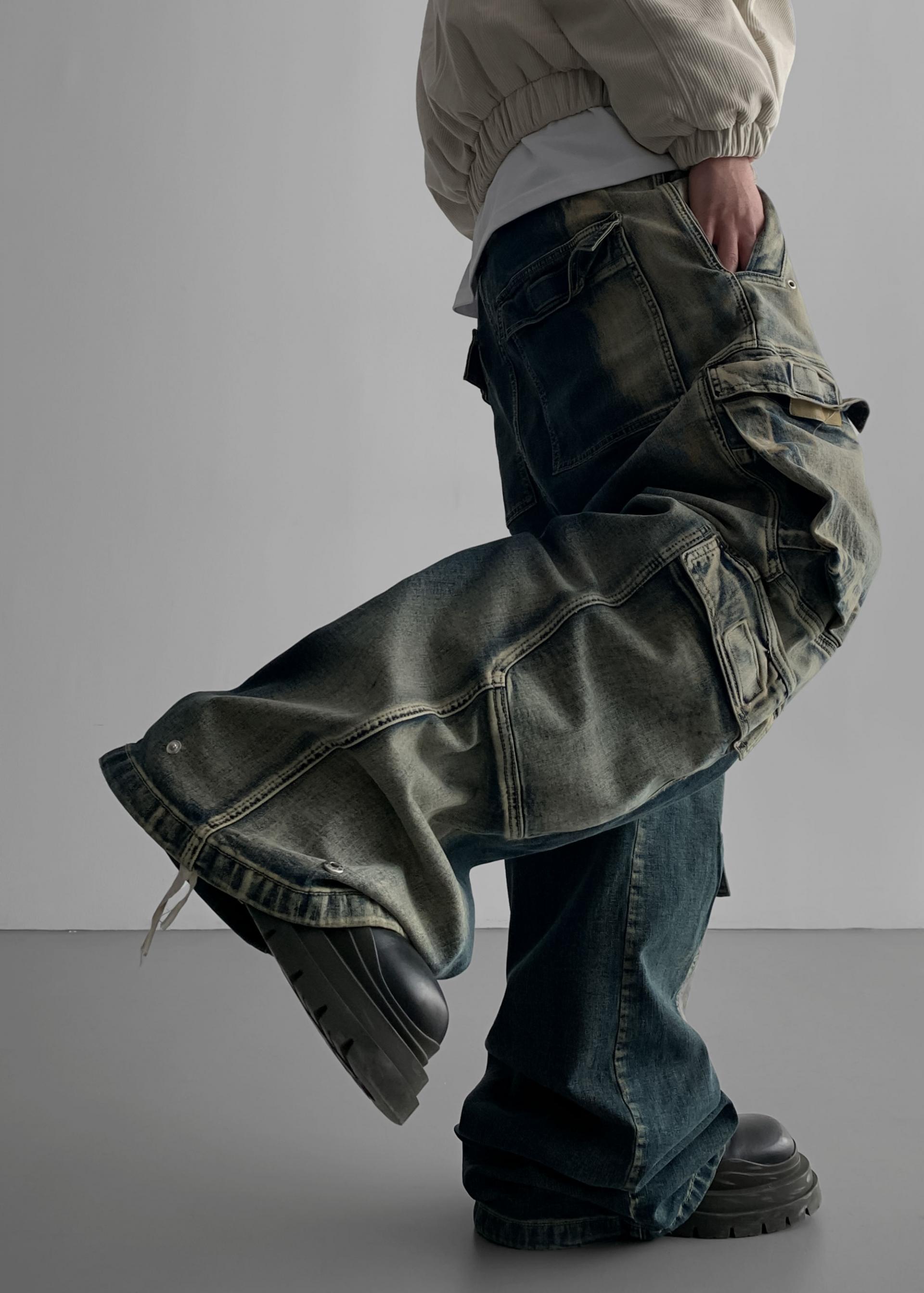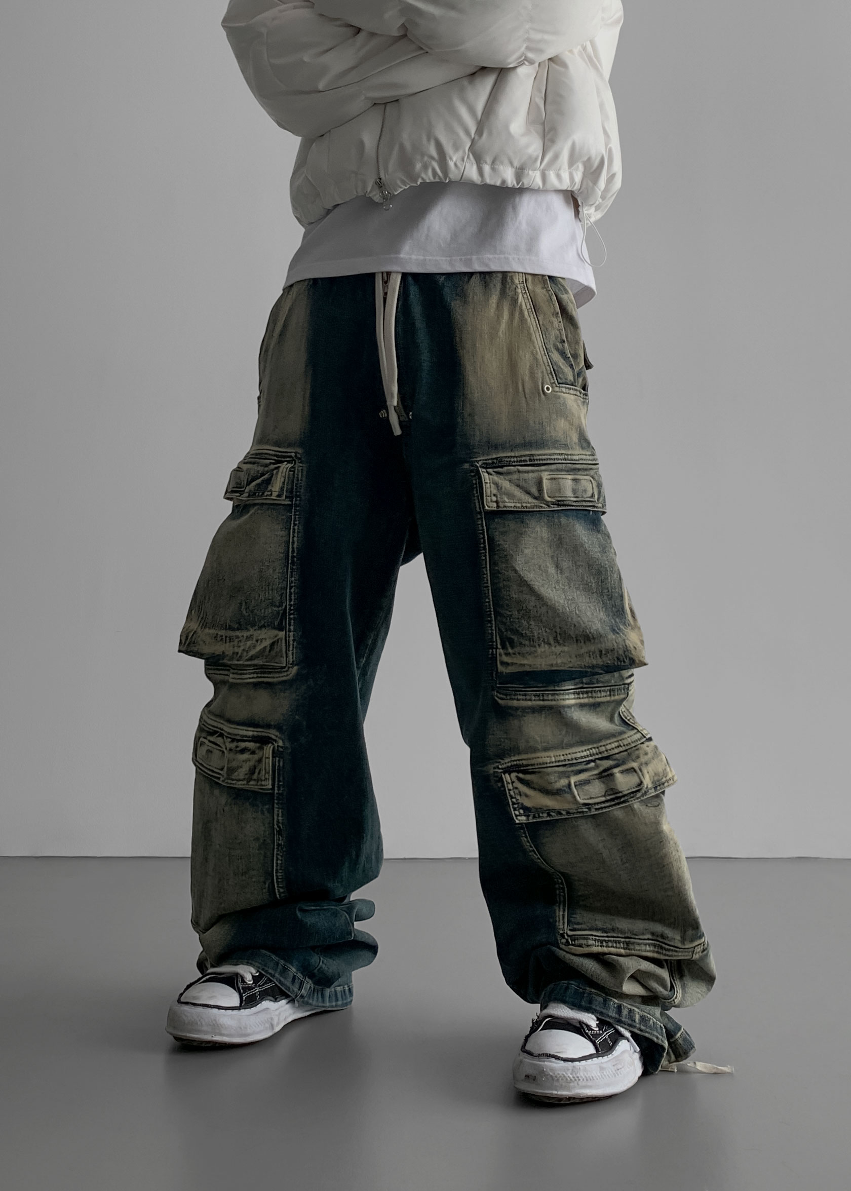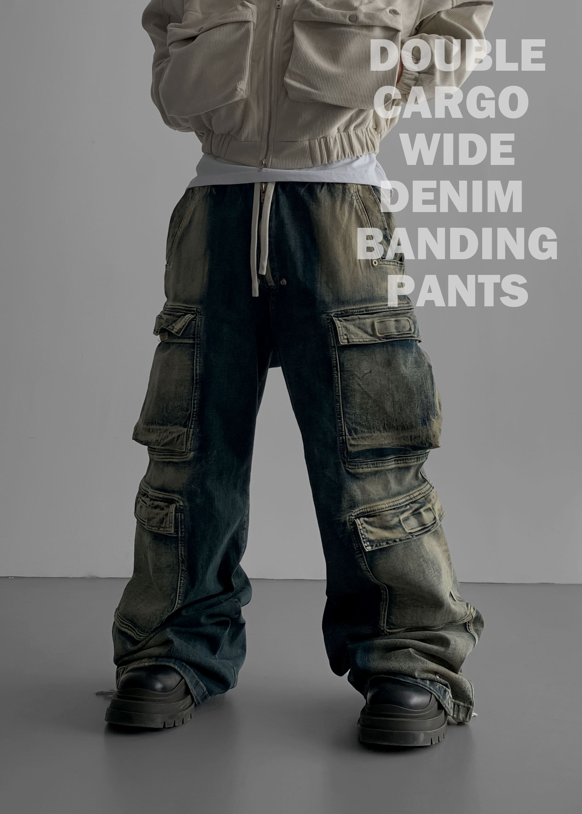더블 카고 와이드 데님 밴딩 팬츠