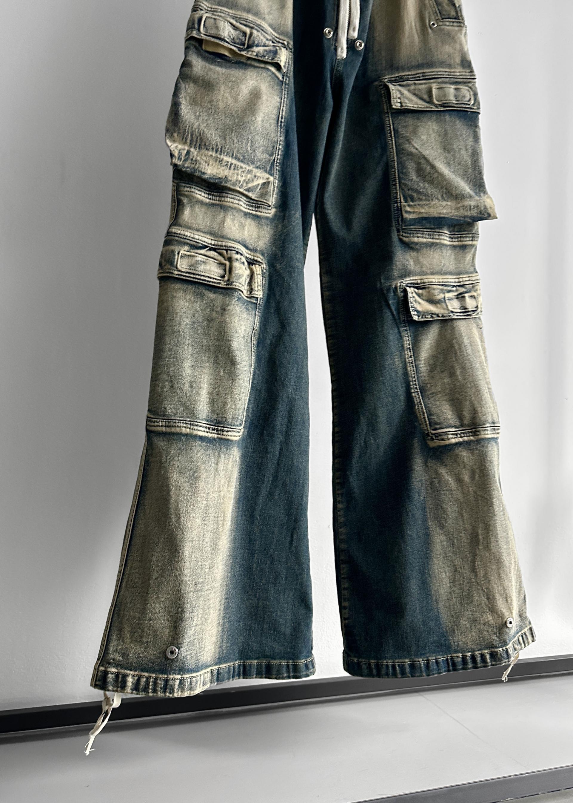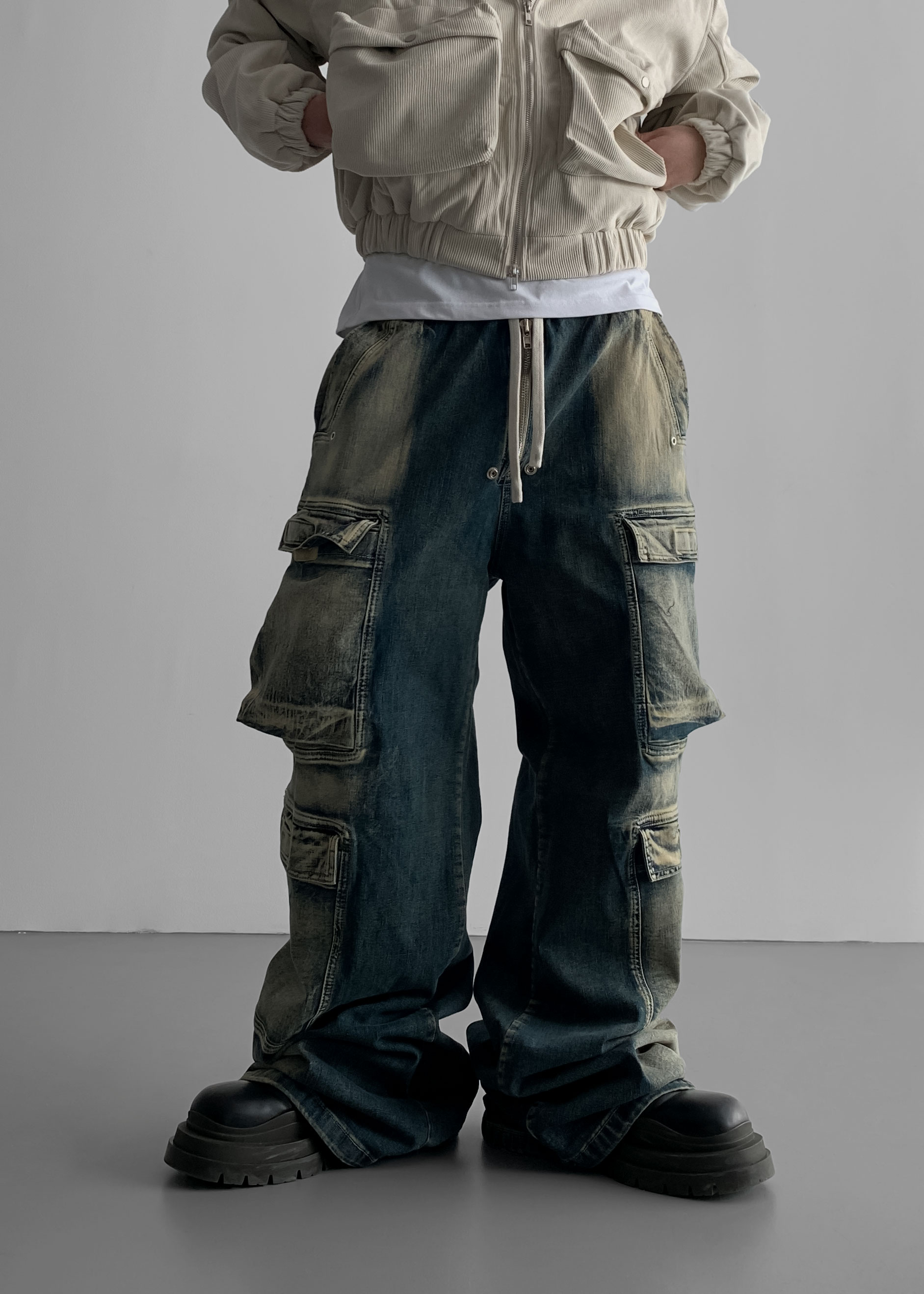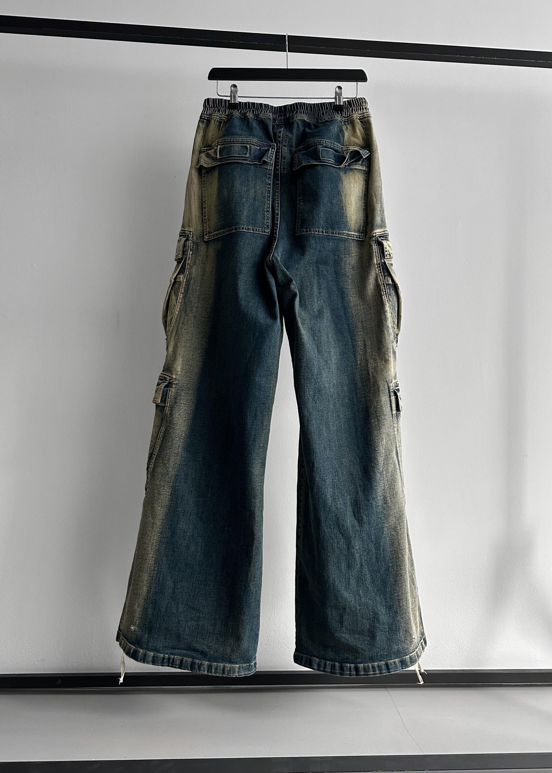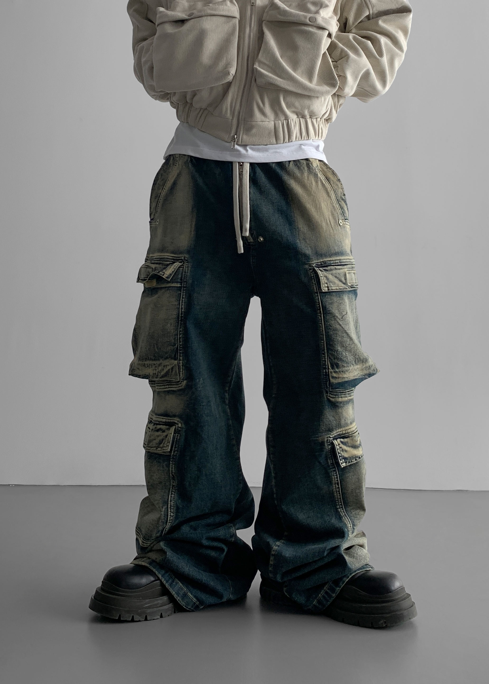 더블 카고 와이드 데님 밴딩 팬츠