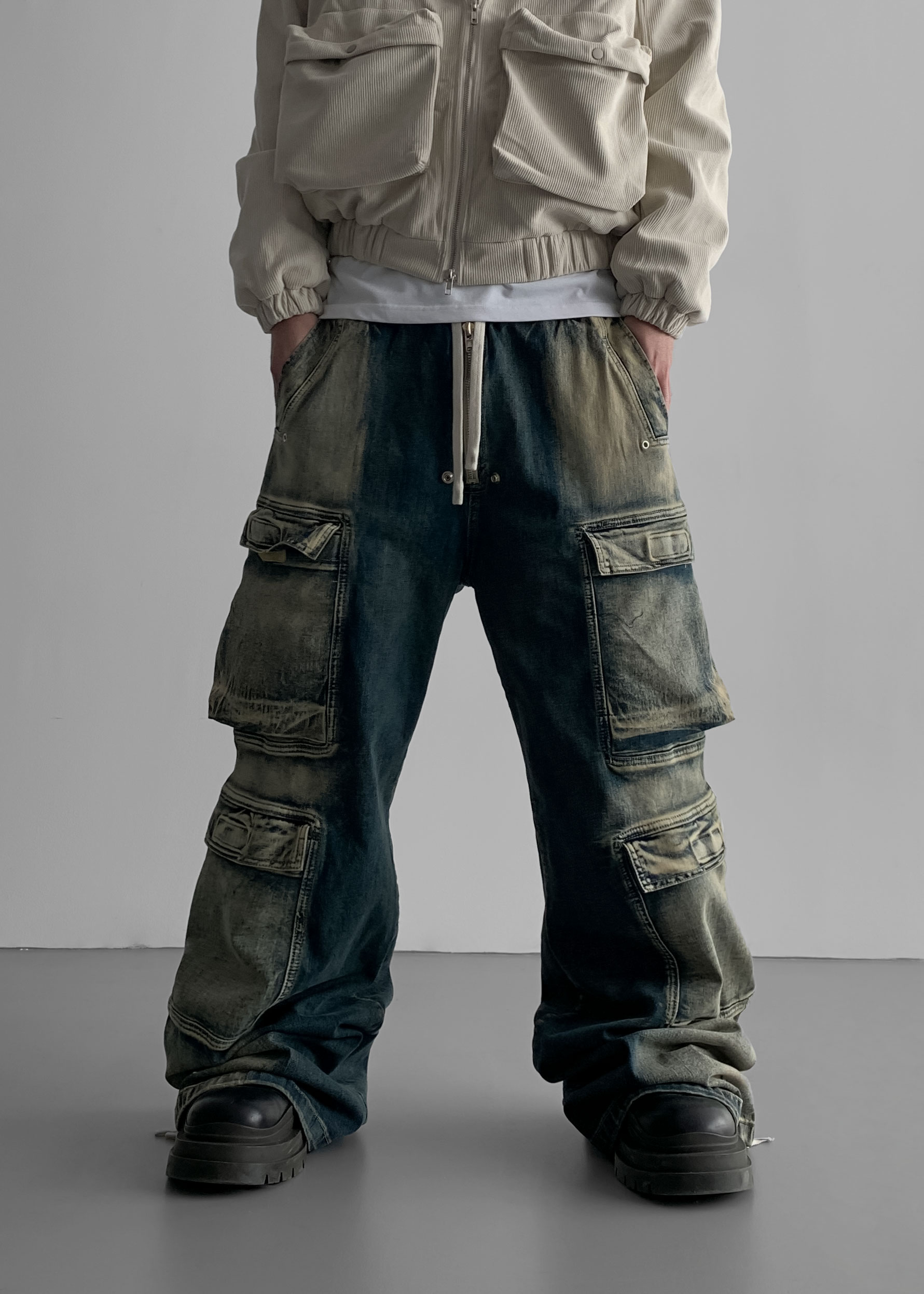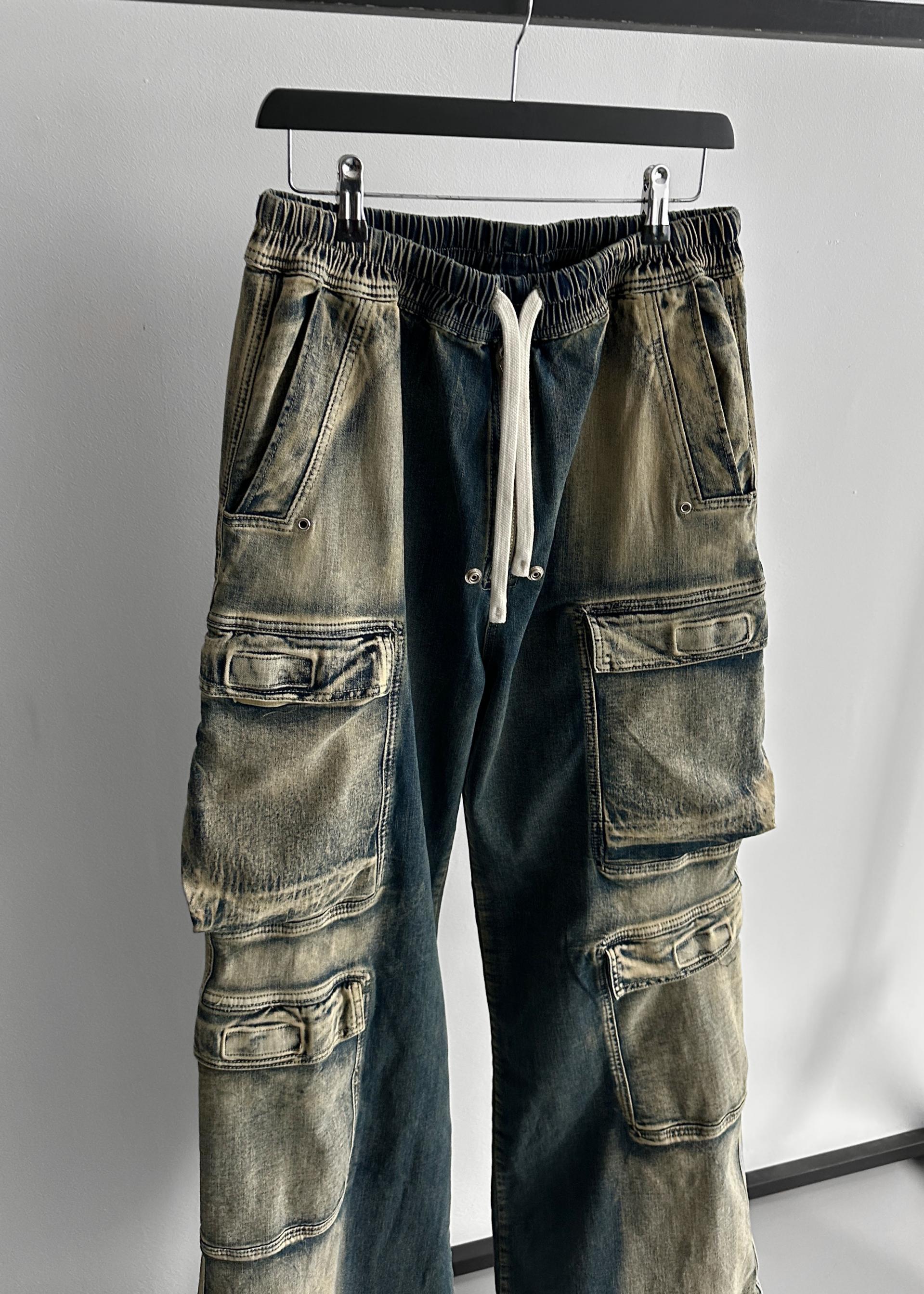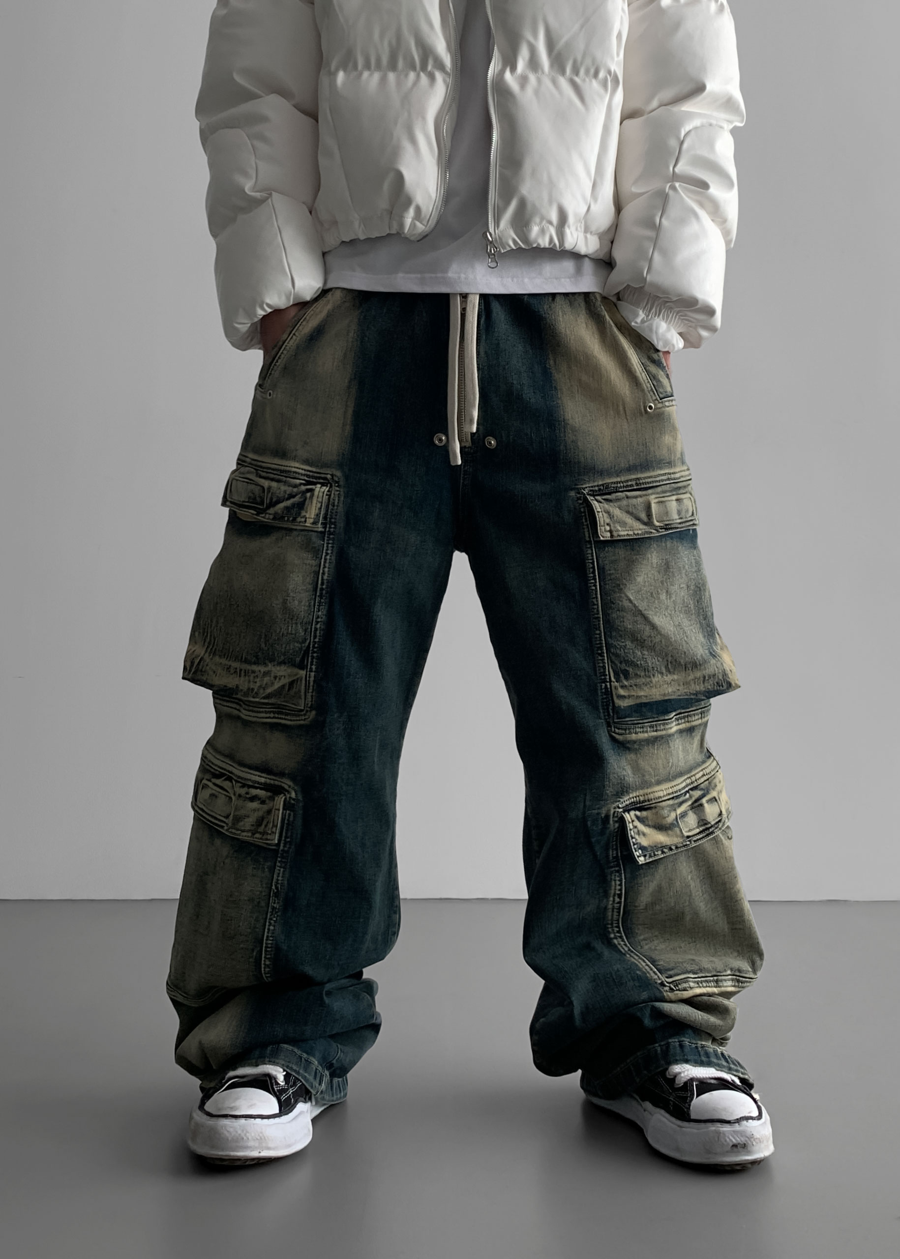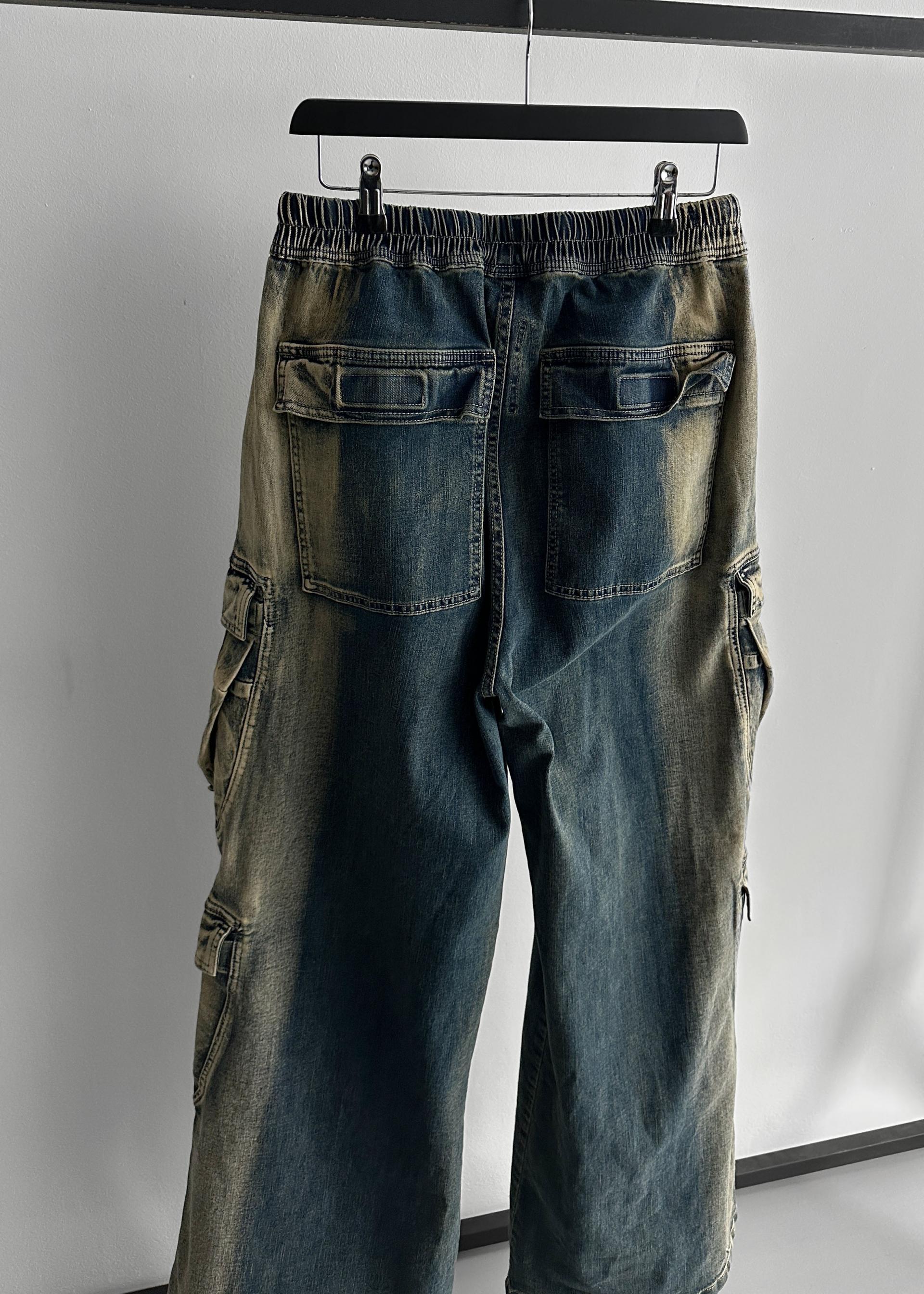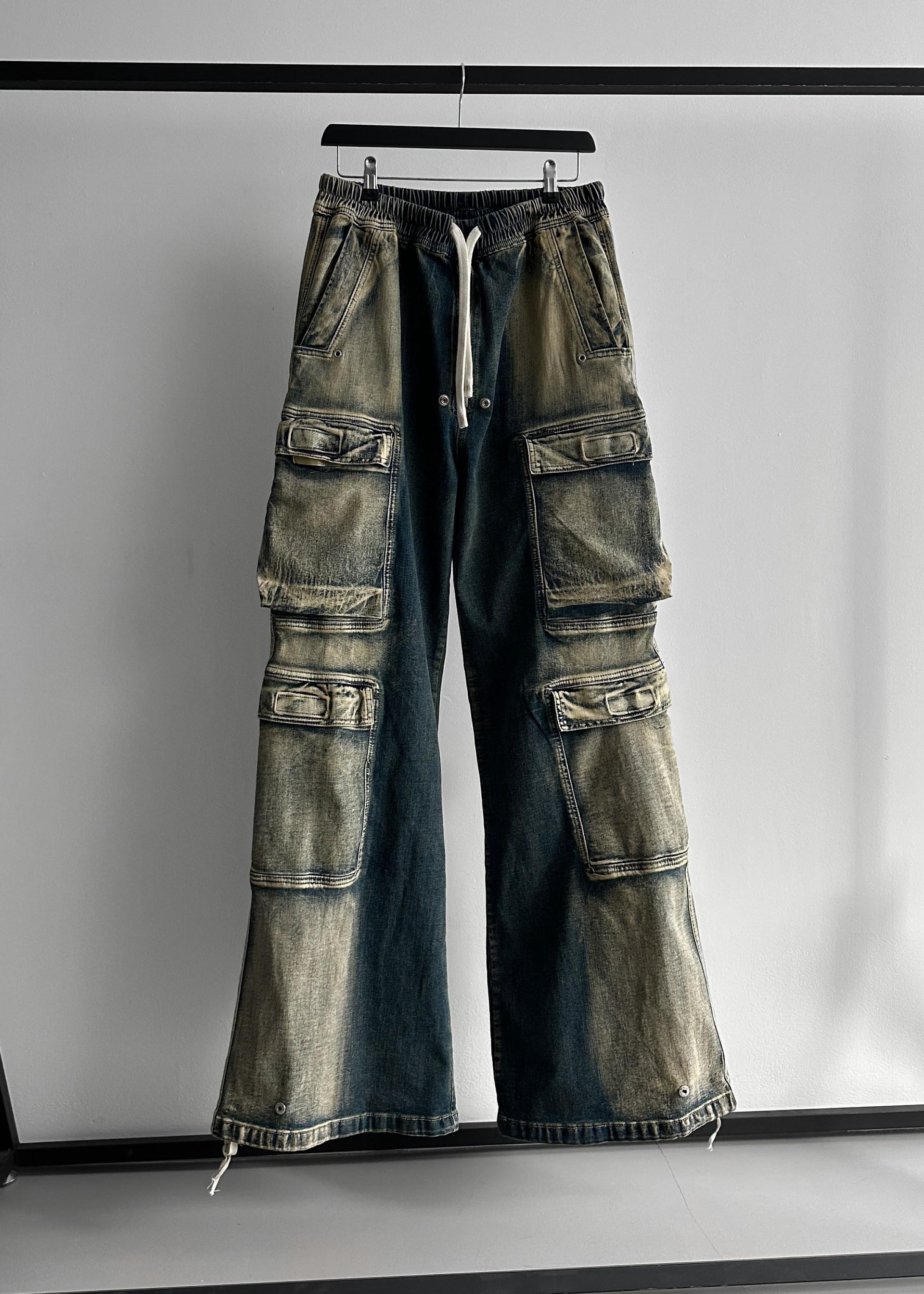 더블 카고 와이드 데님 밴딩 팬츠