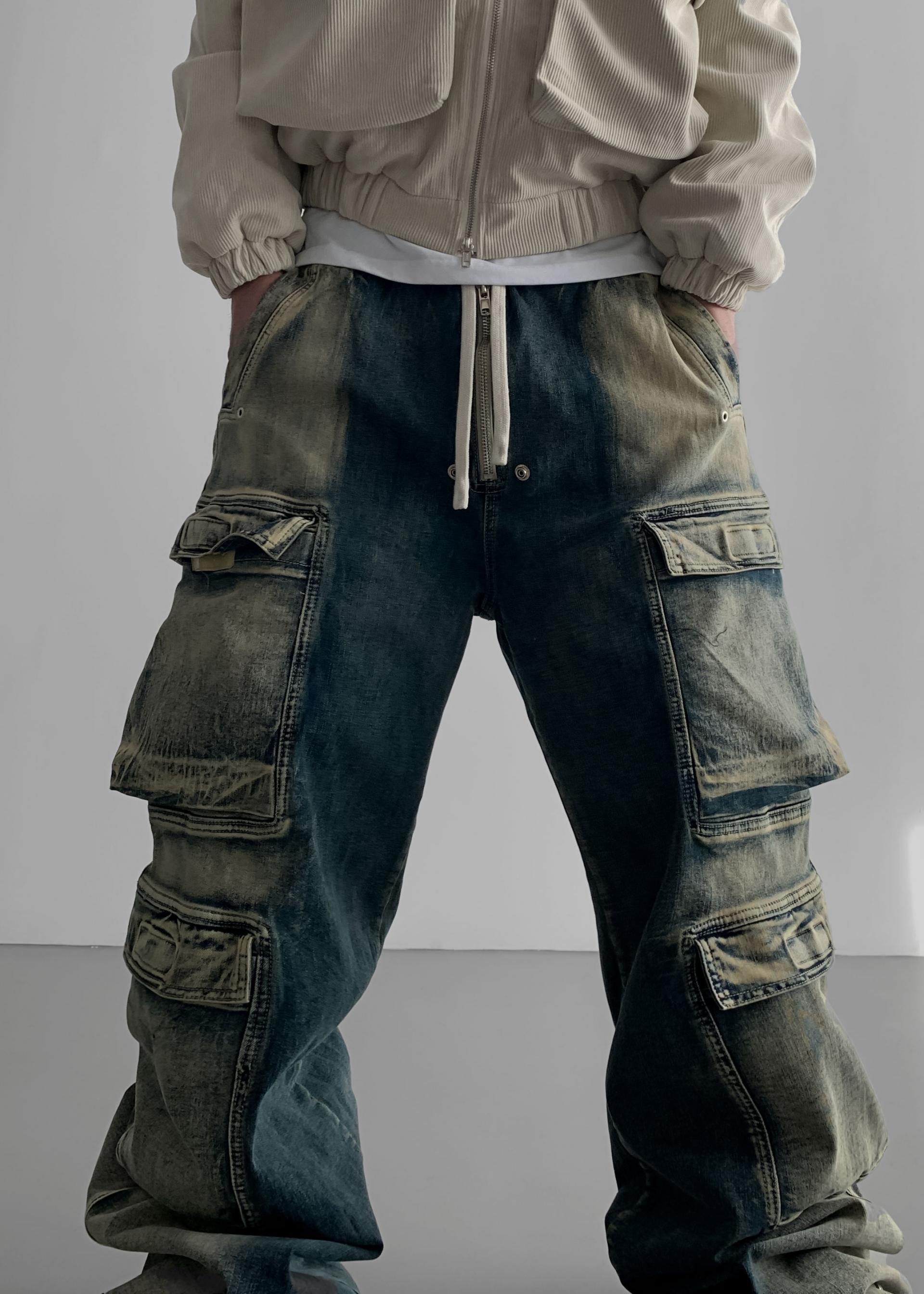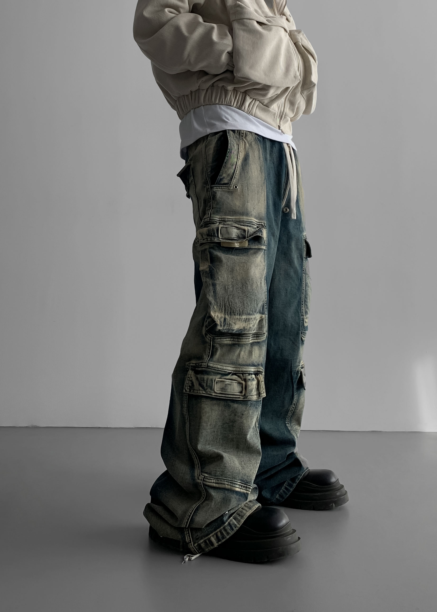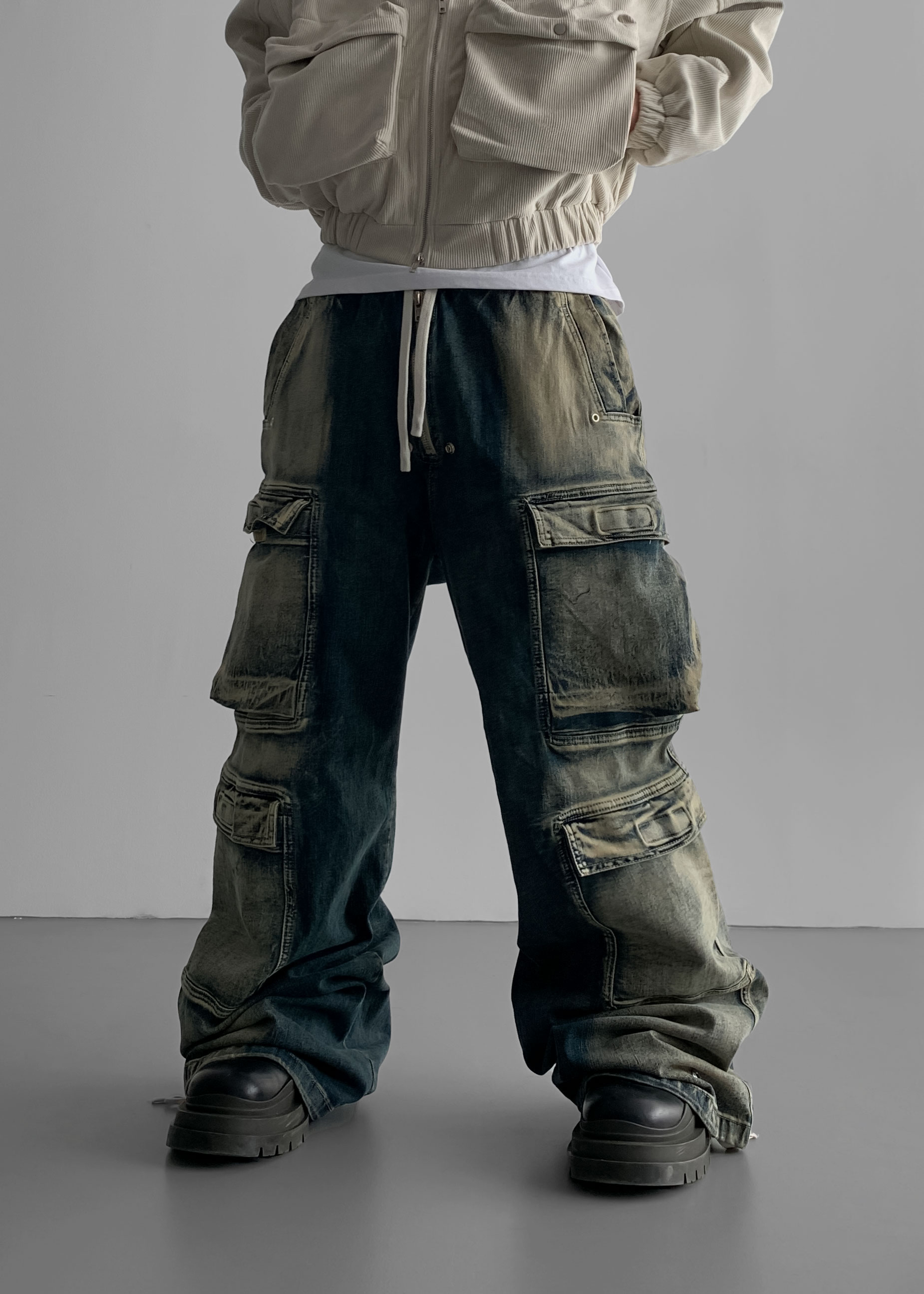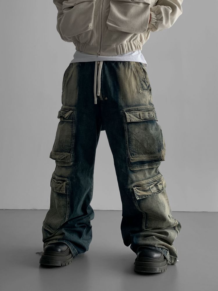 더블 카고 와이드 데님 밴딩 팬츠