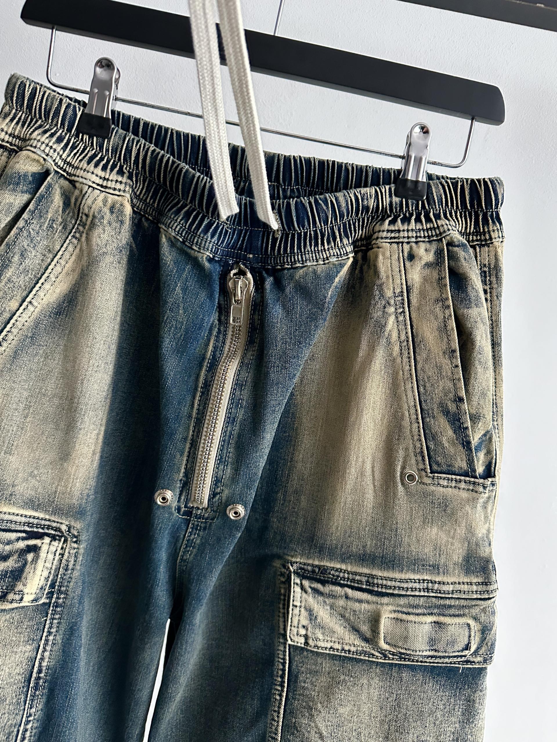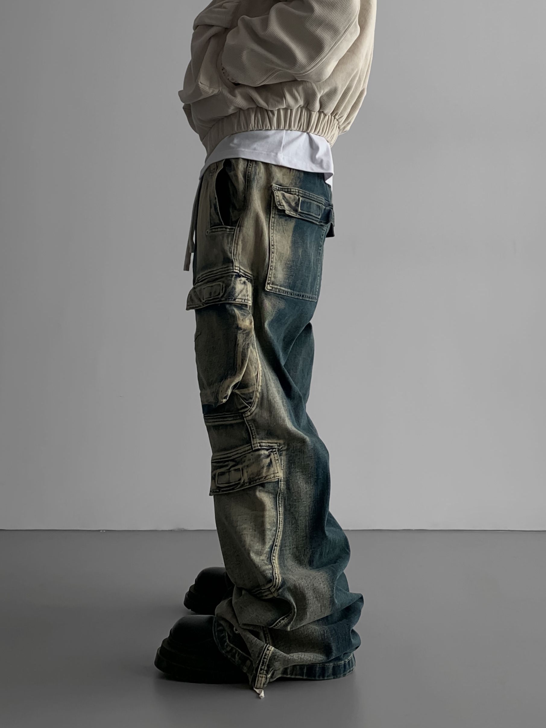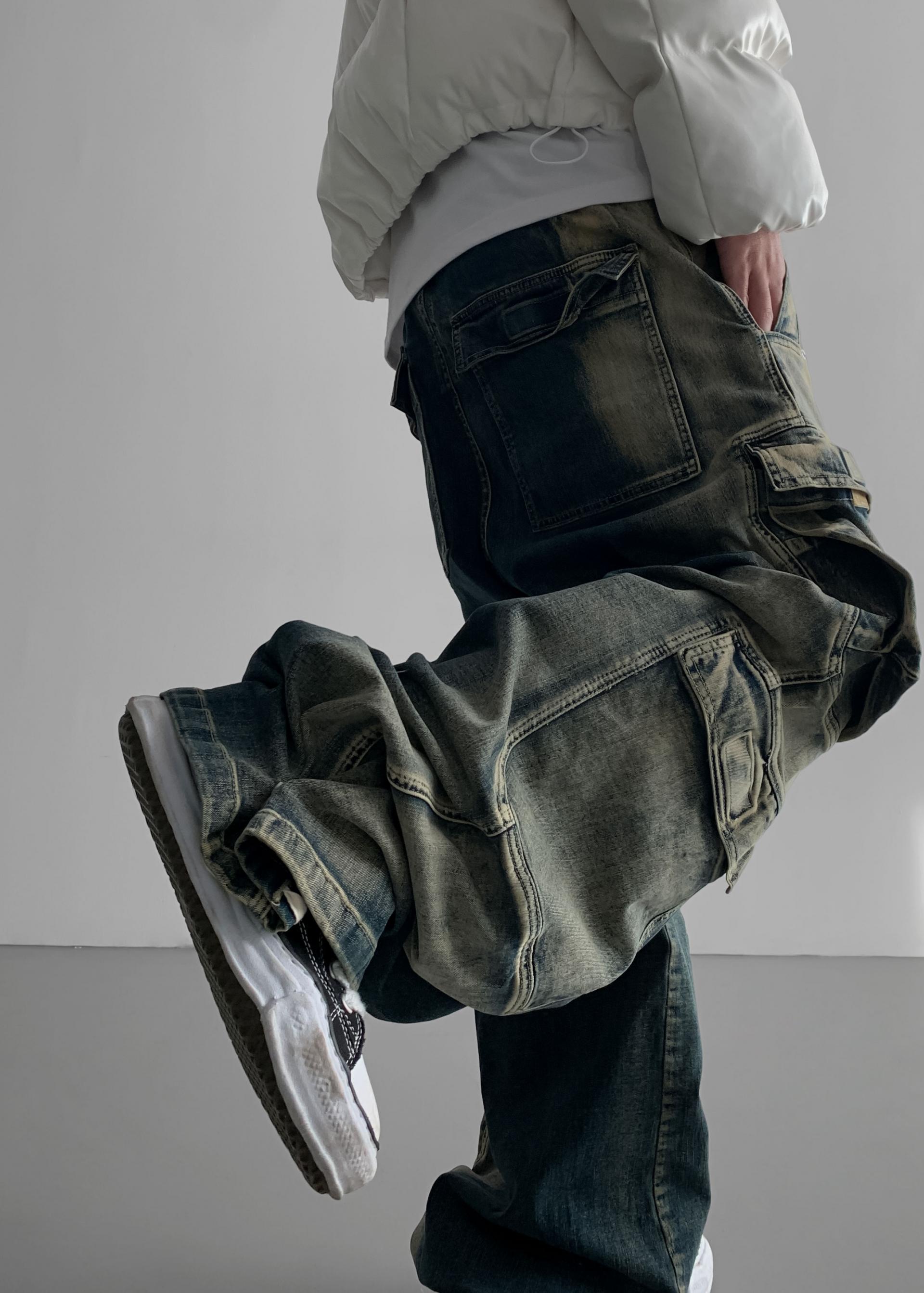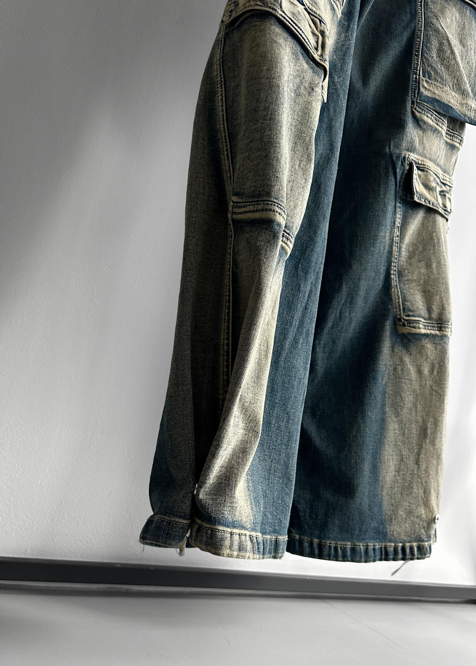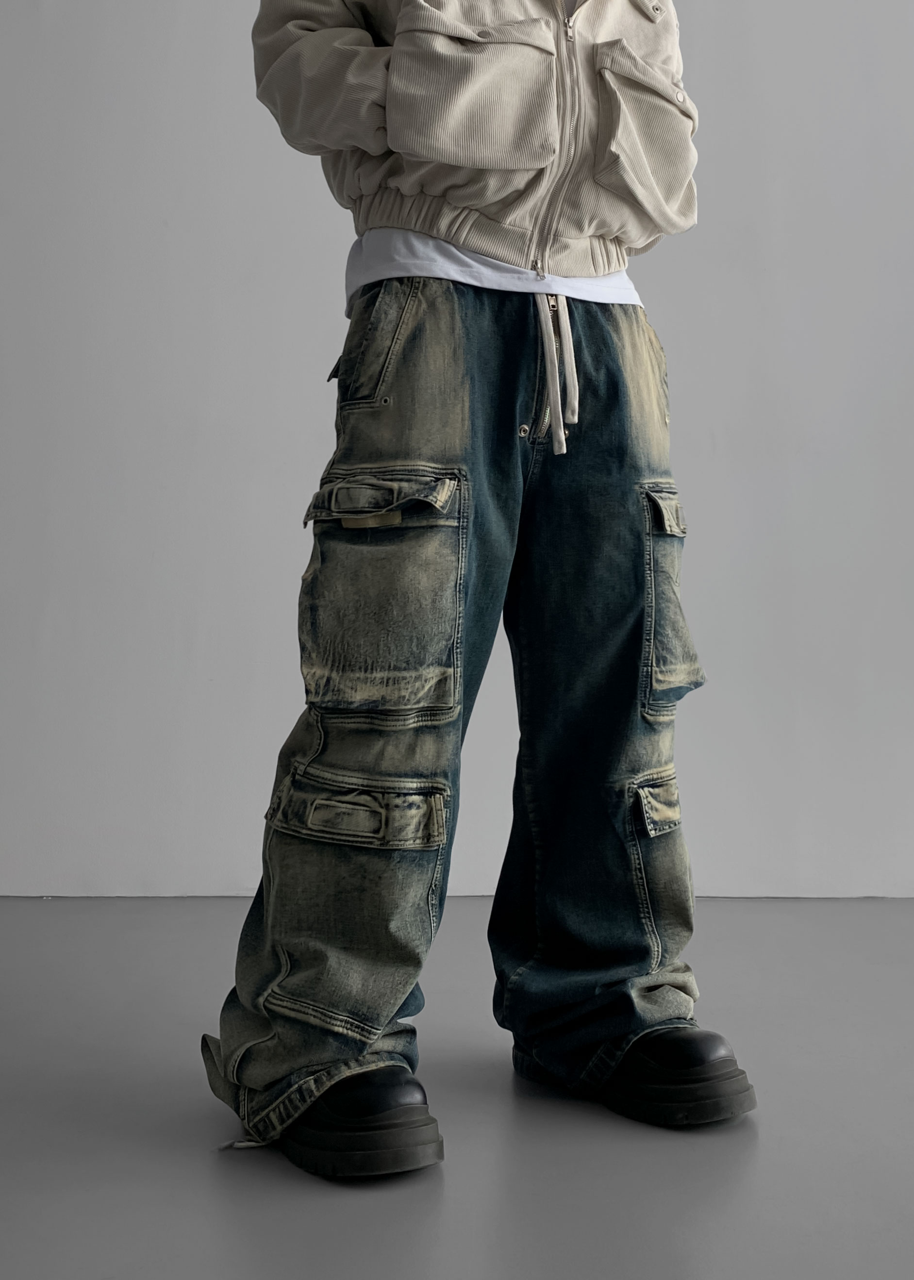 더블 카고 와이드 데님 밴딩 팬츠