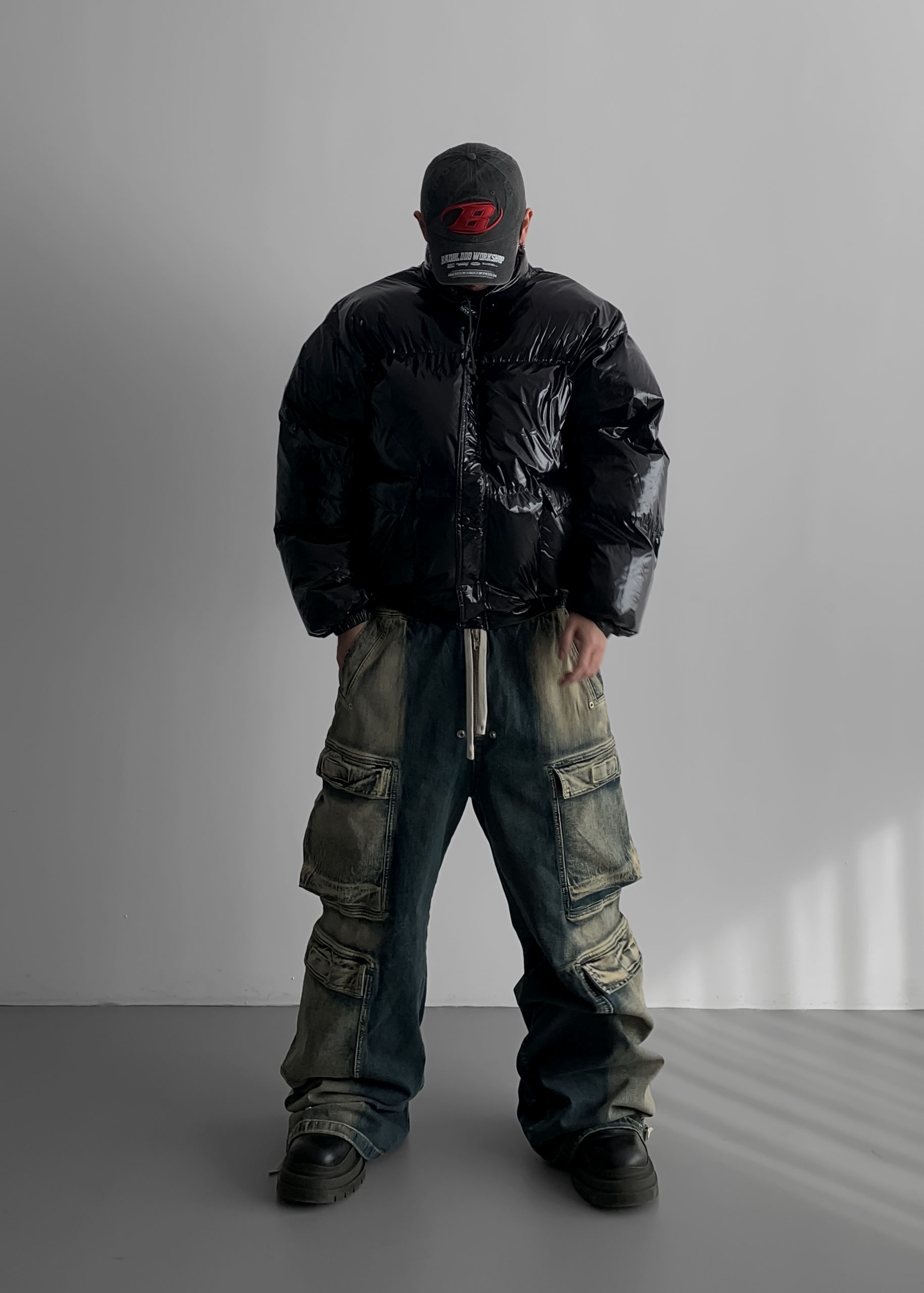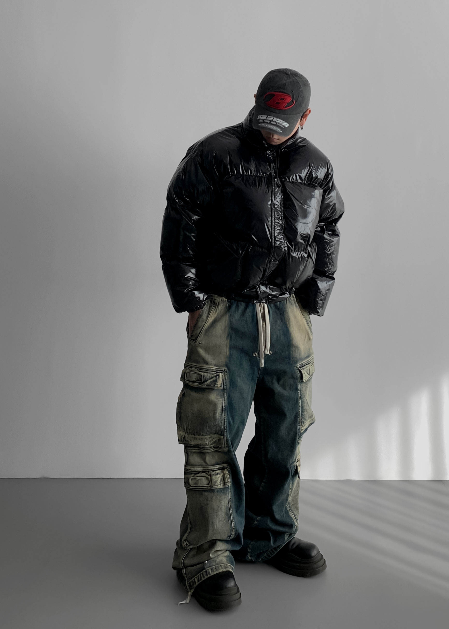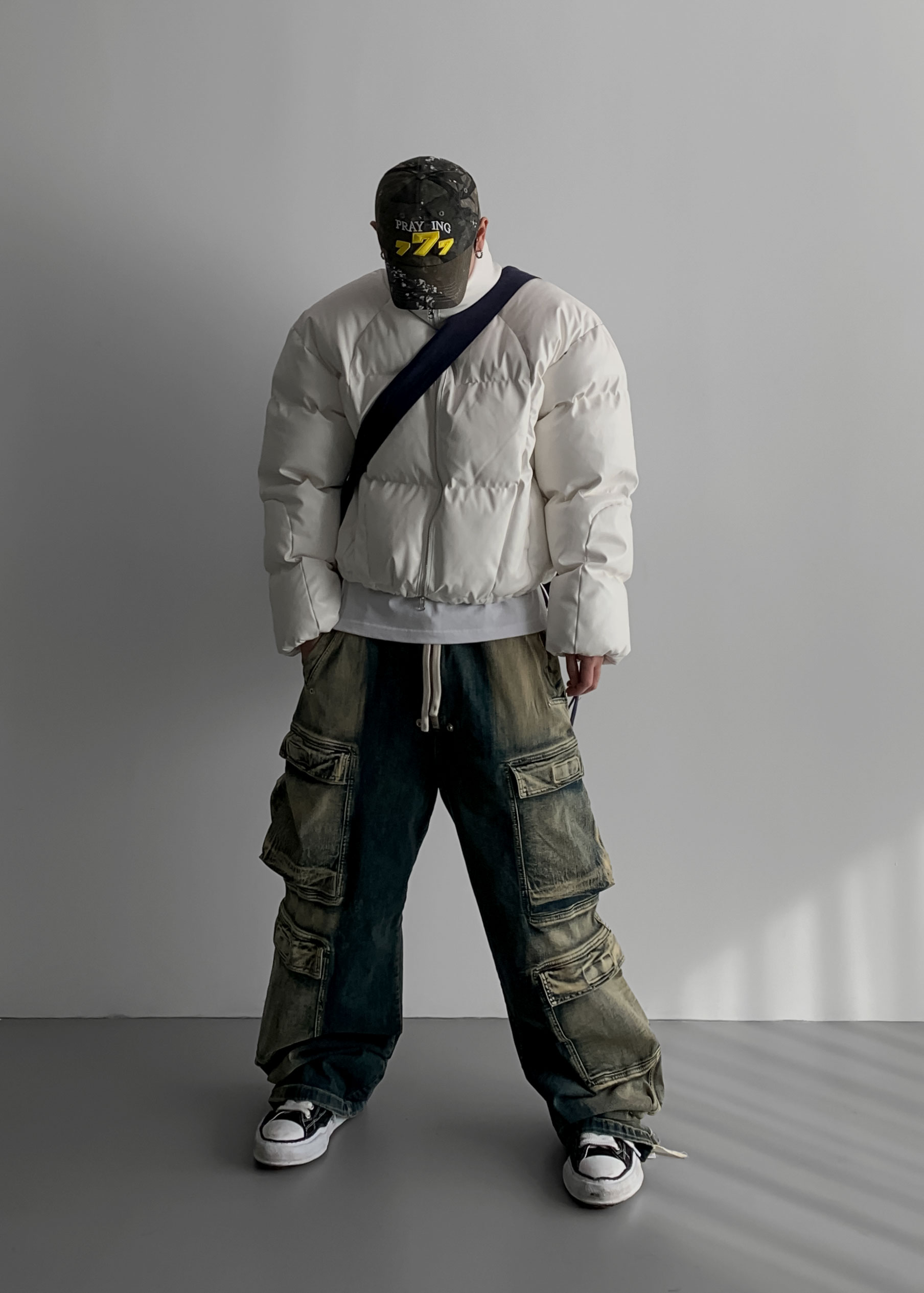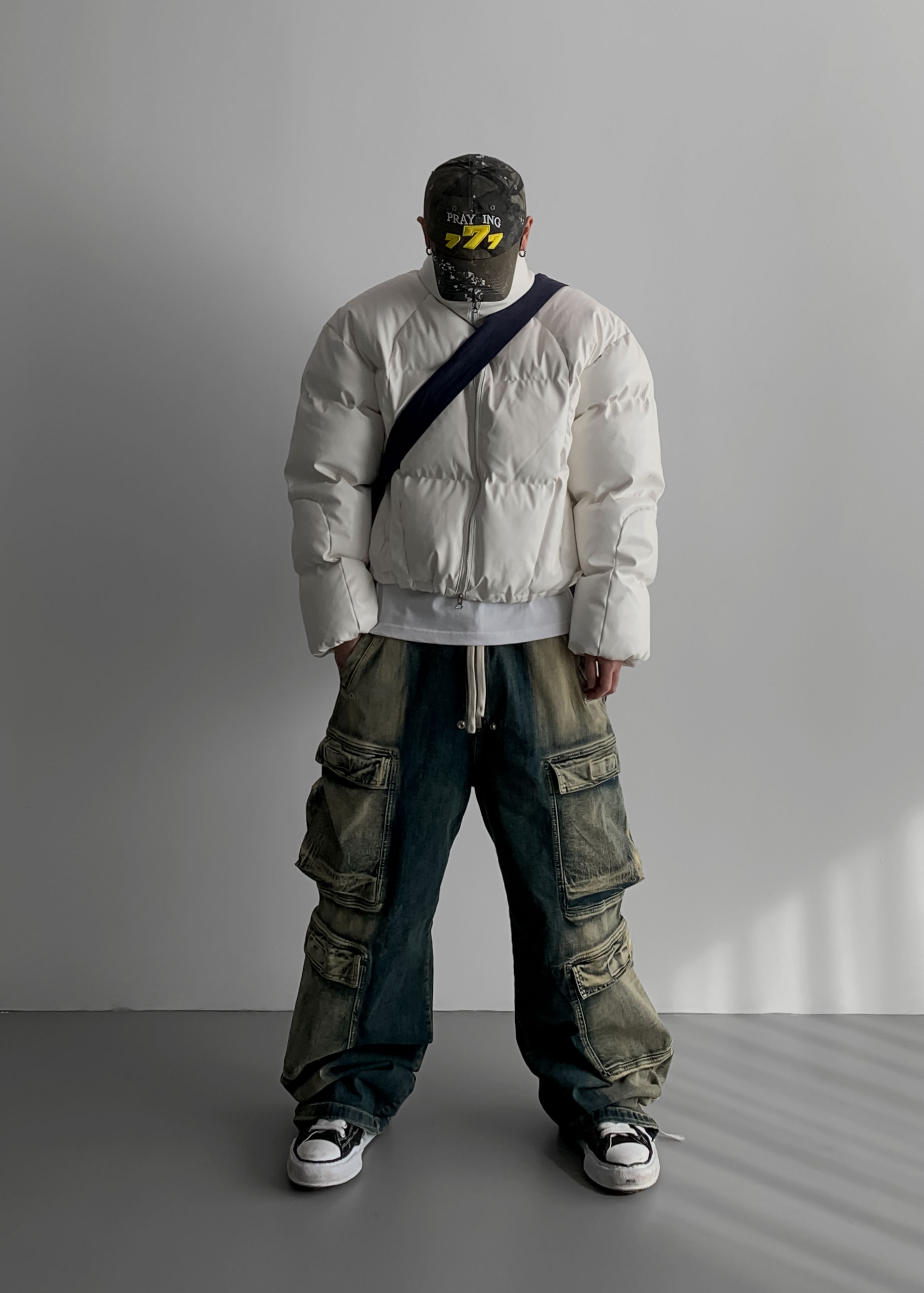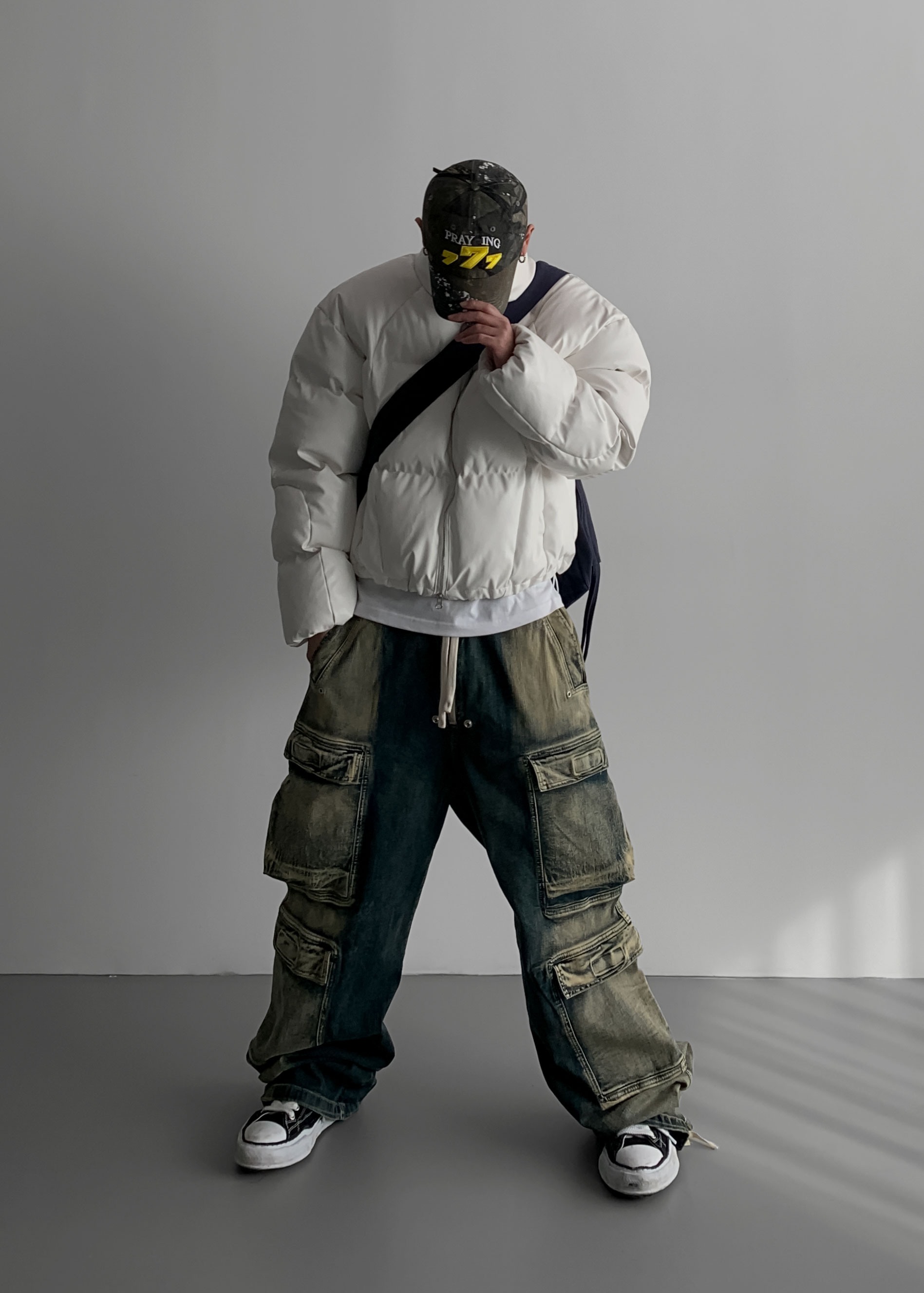 (팬츠를 내려입어 골반에 걸쳐서 착용하였고 와이드 핏 연출)