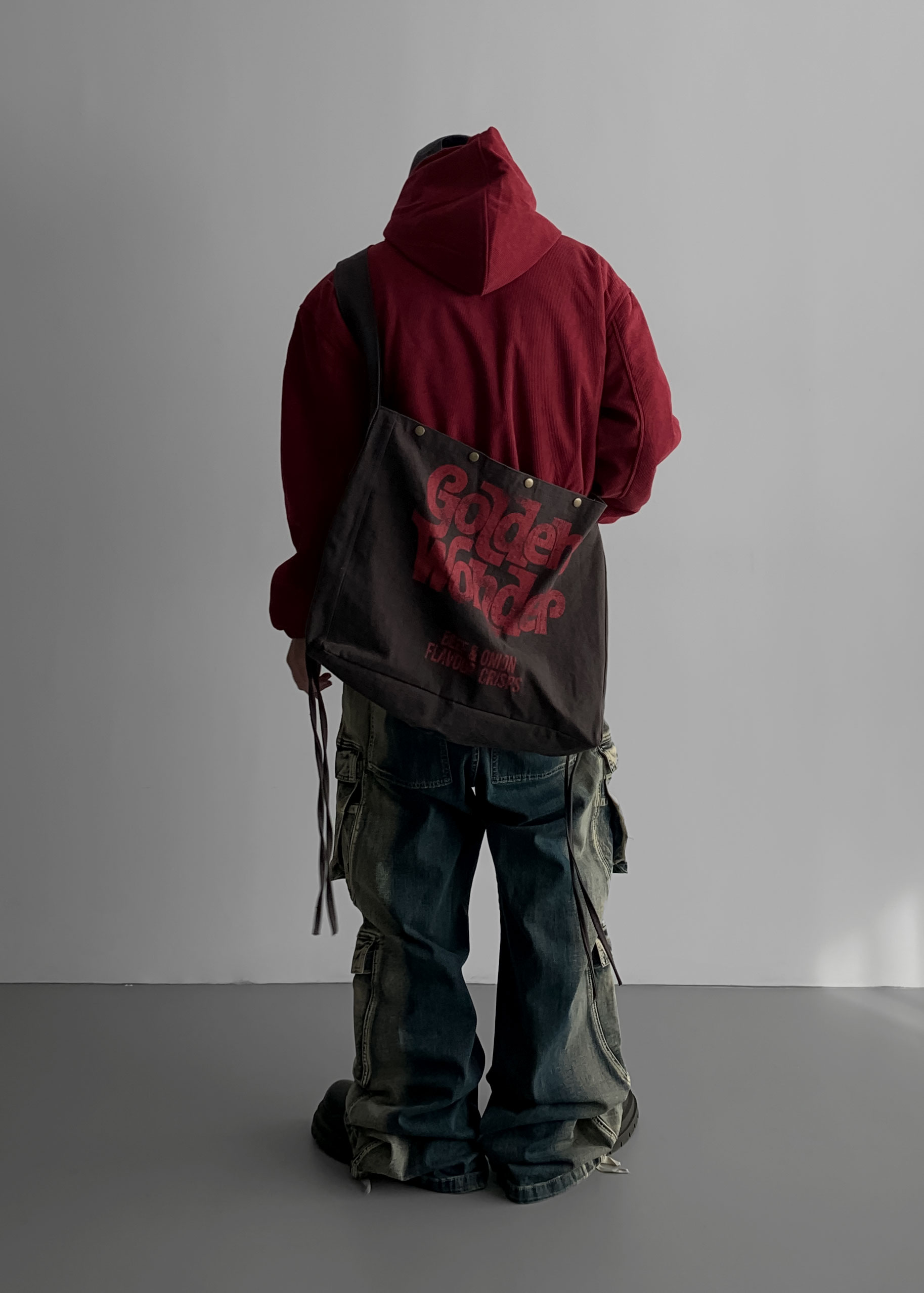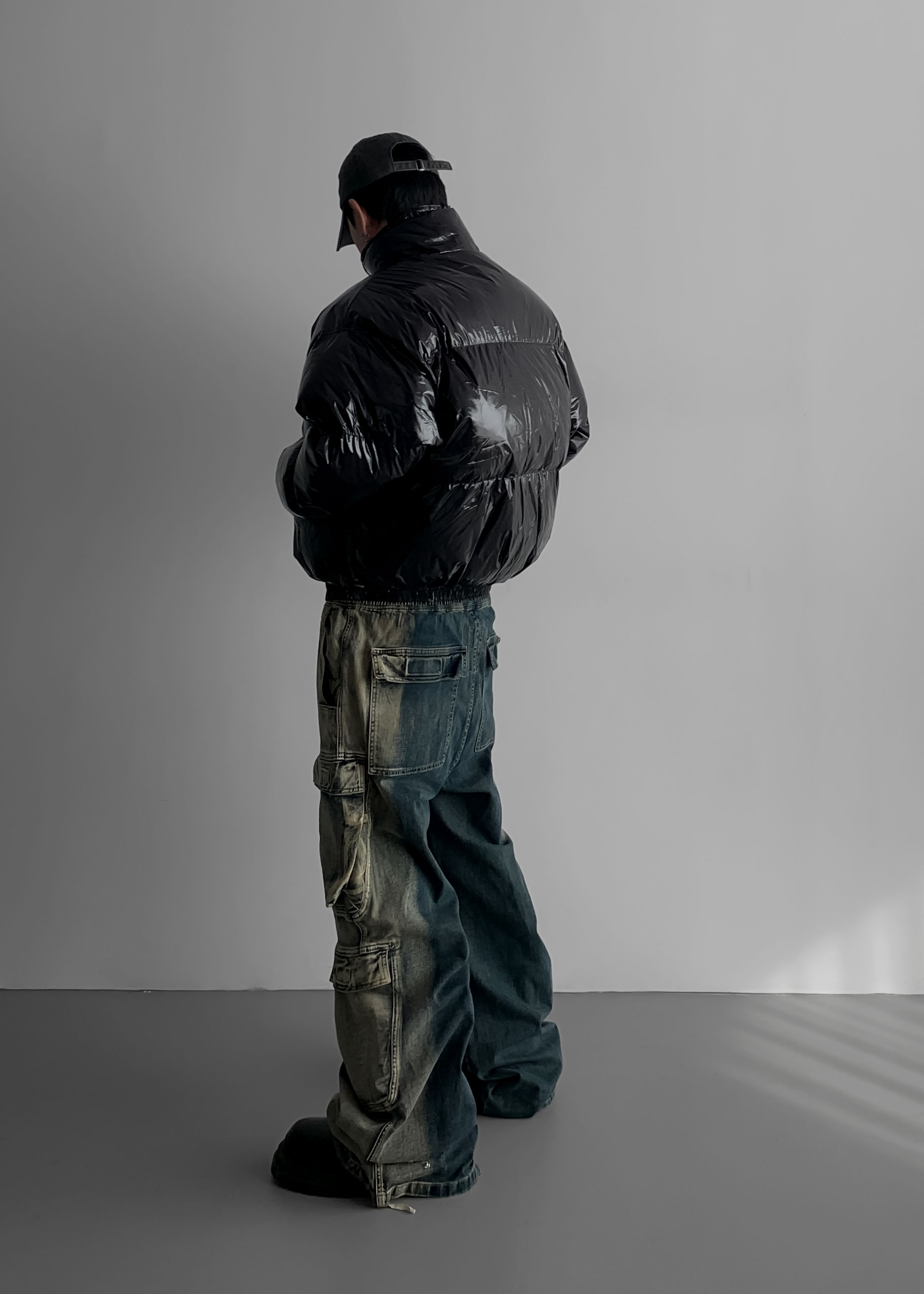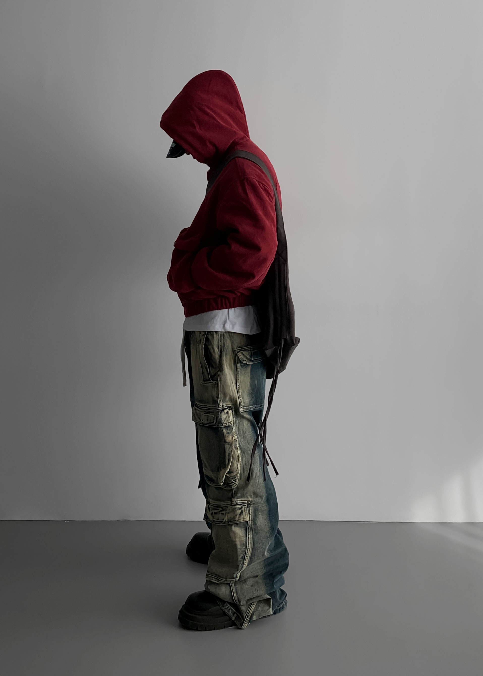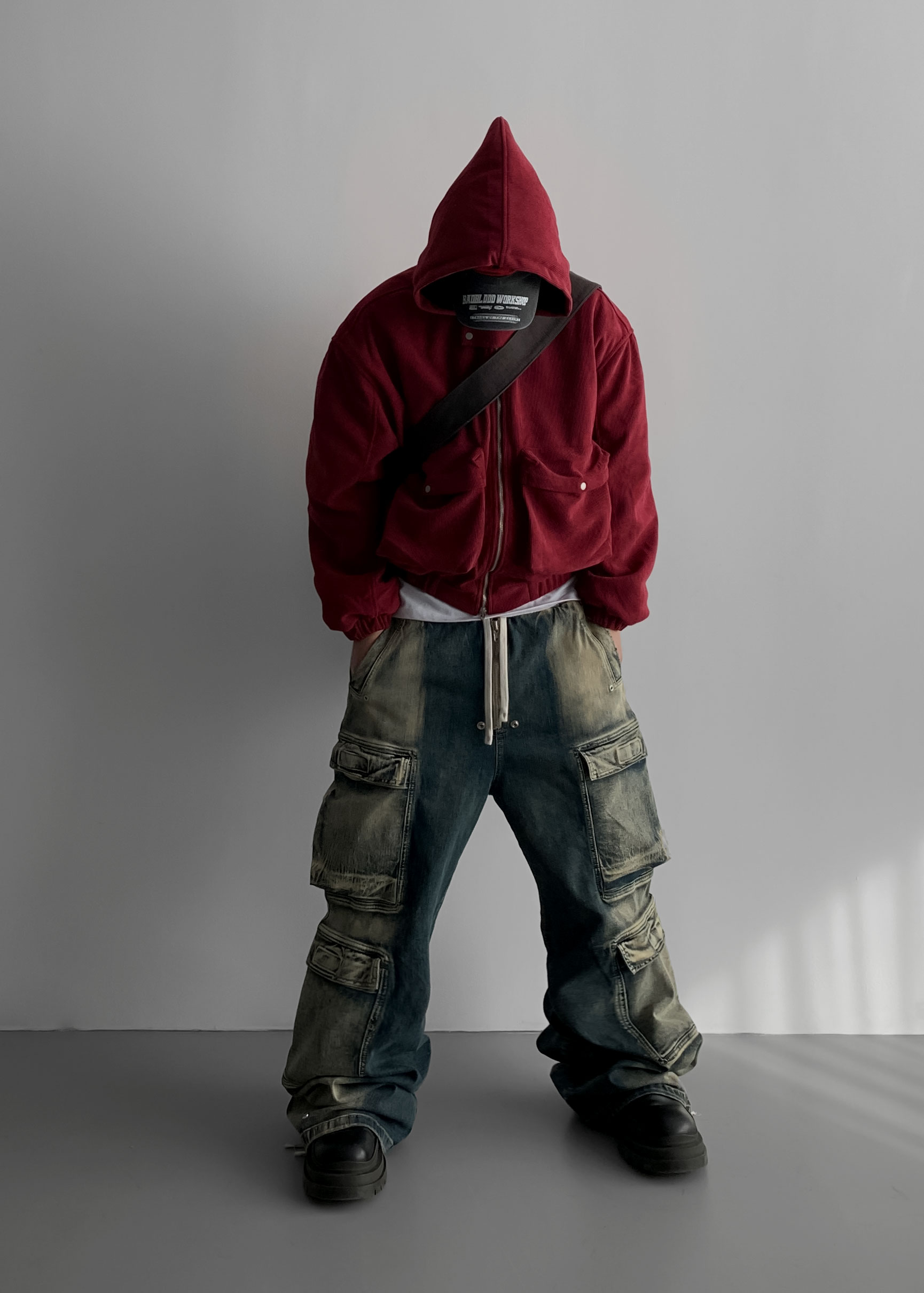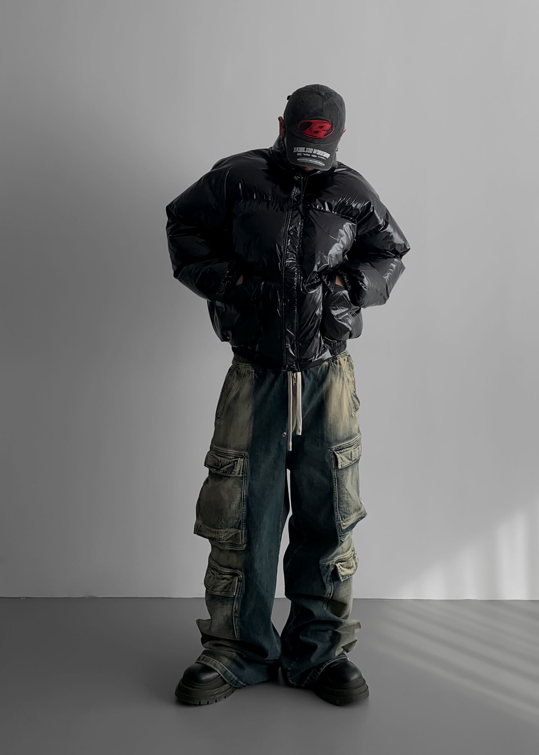 (팬츠를 내려입어 골반에 걸쳐서 착용하였고 와이드 핏 연출)