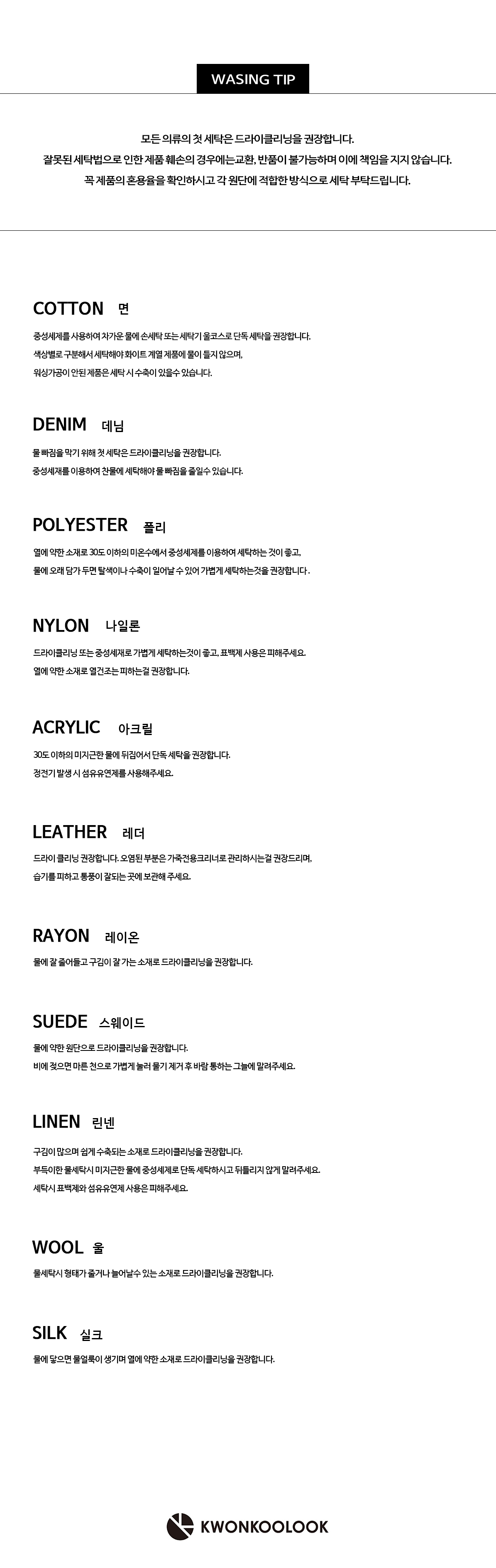 -모든 상품의 세탁은 드라이클리닝을 권장하며, 탈수나 건조기 사용시 상품이 변형될 가능성이 높으니 자제 부탁드립니다.