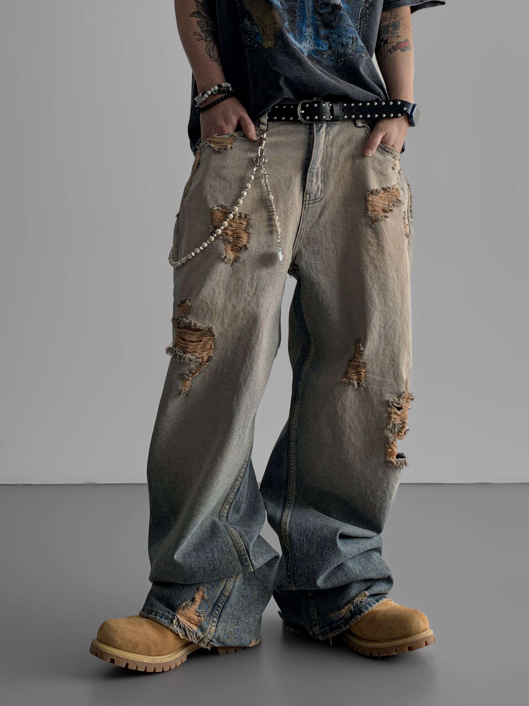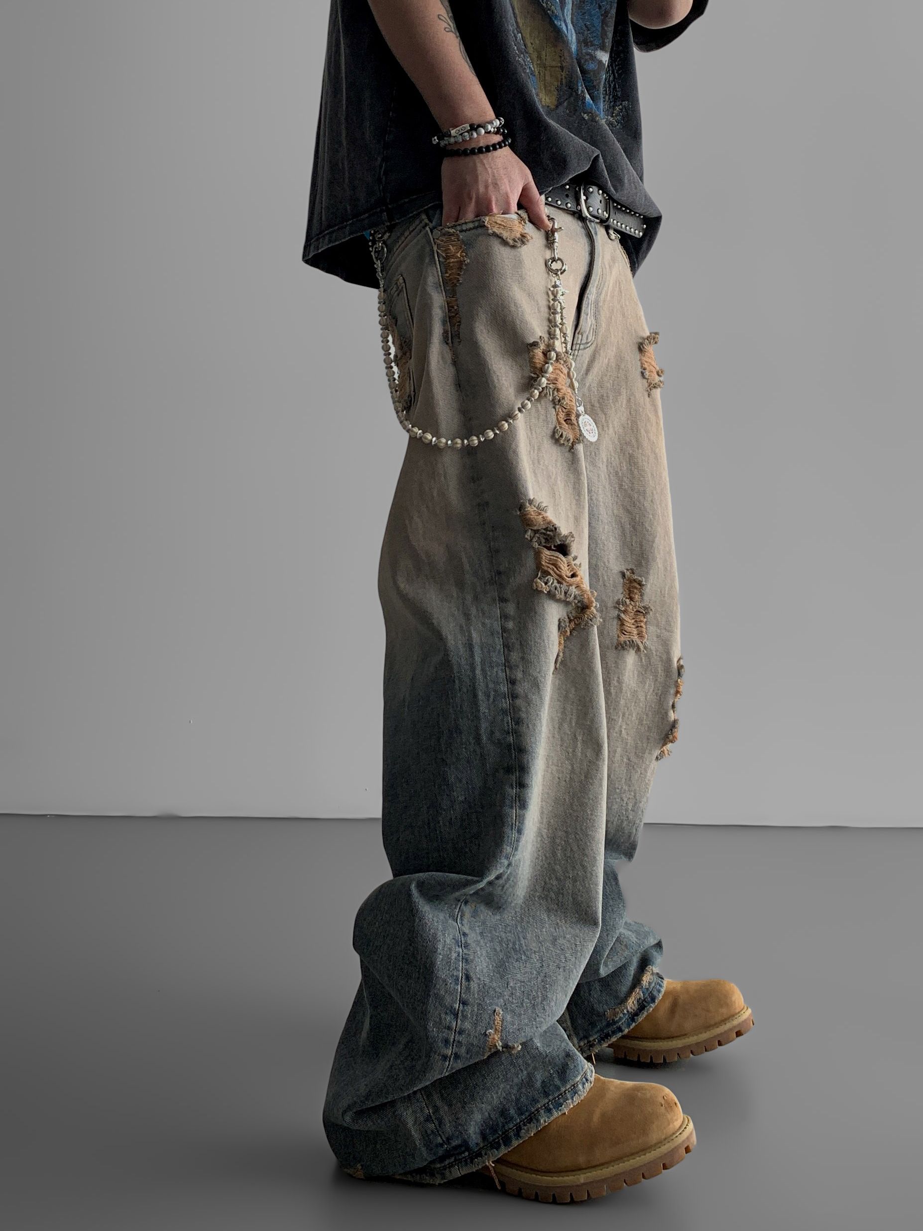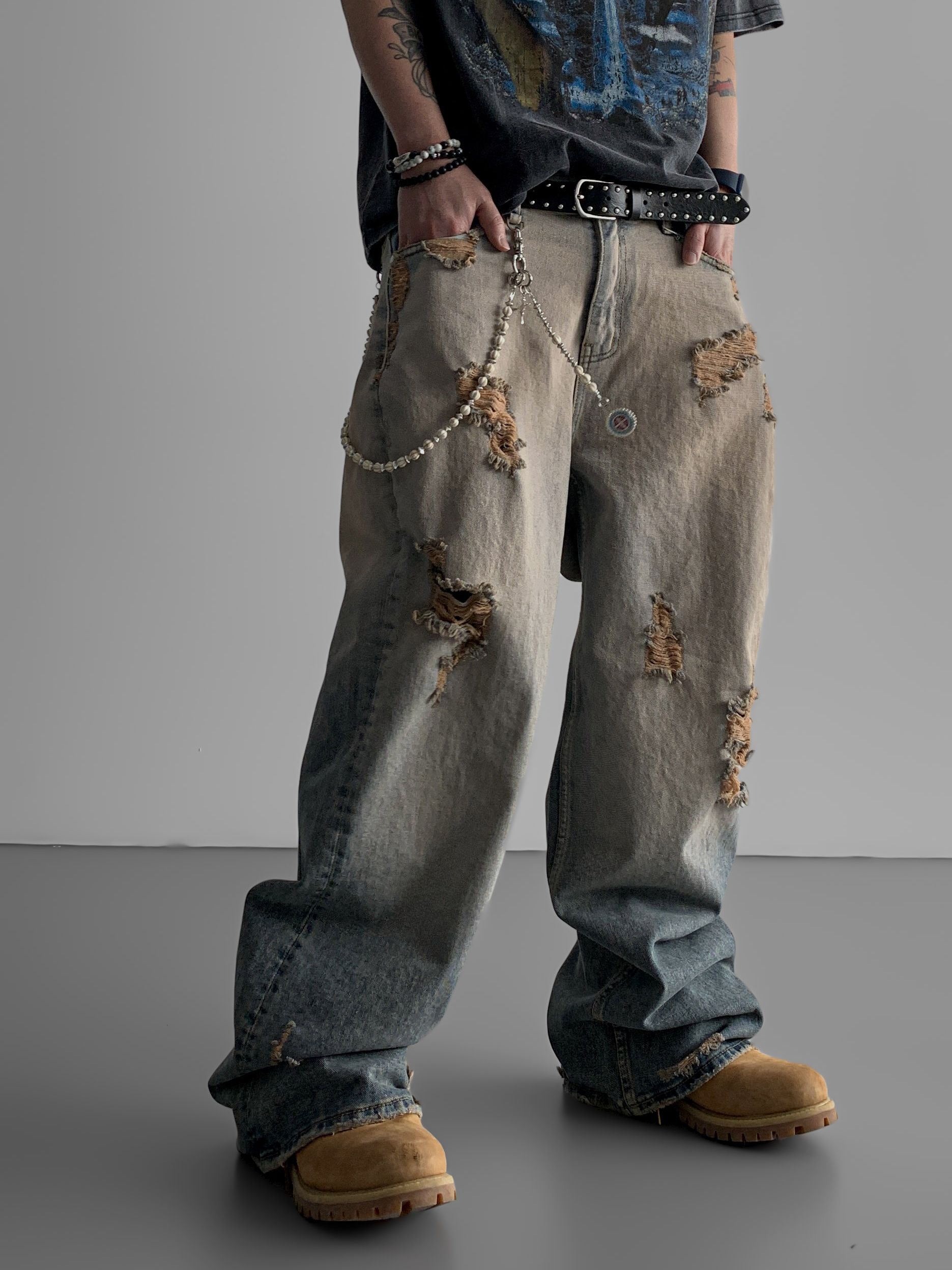 머드 데미지 데님 팬츠