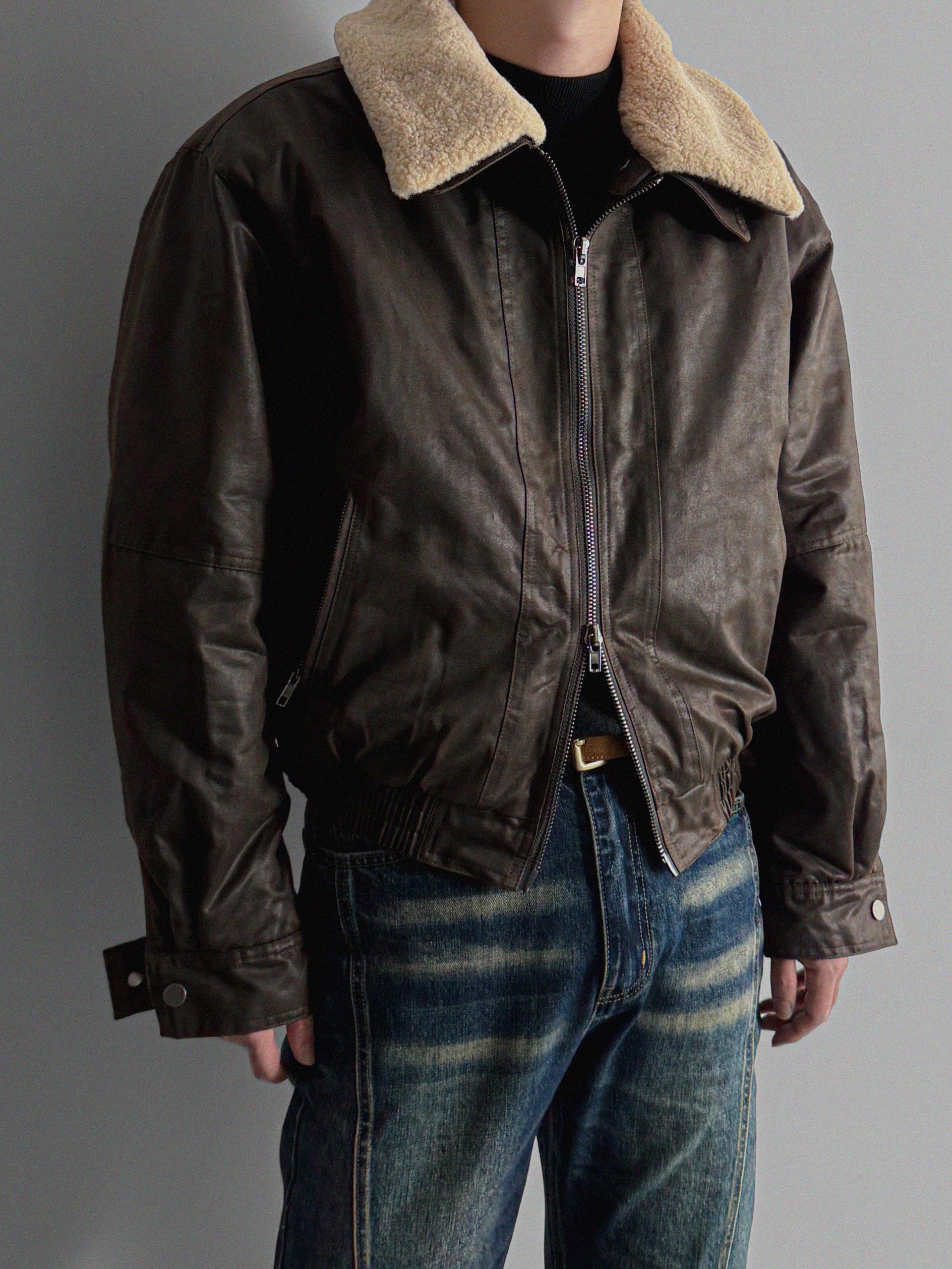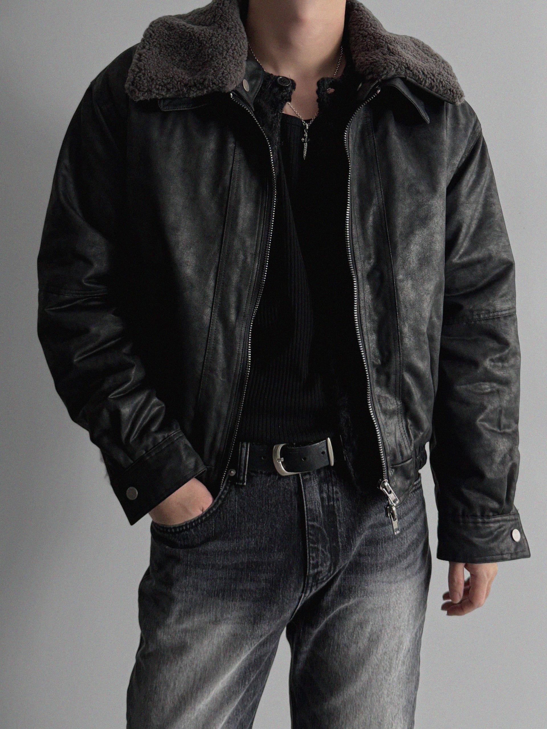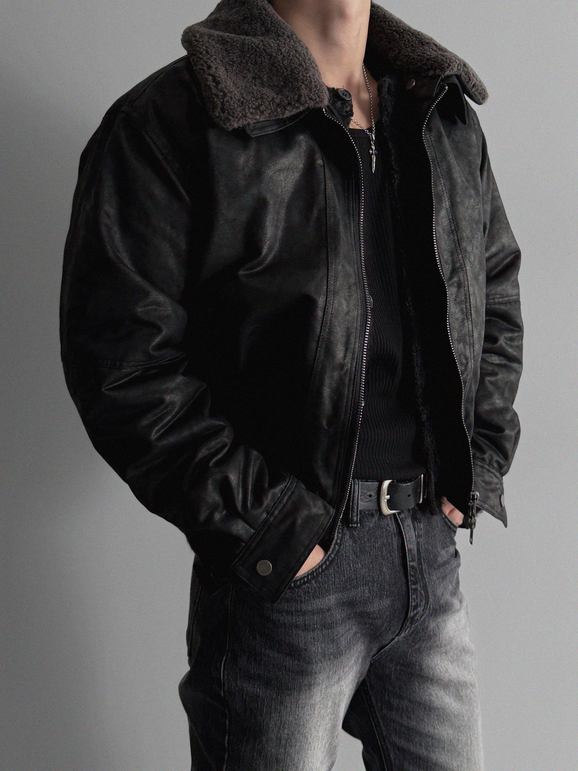 -거친 텍스처감의 러프한 레더 패딩 무스탕 자켓